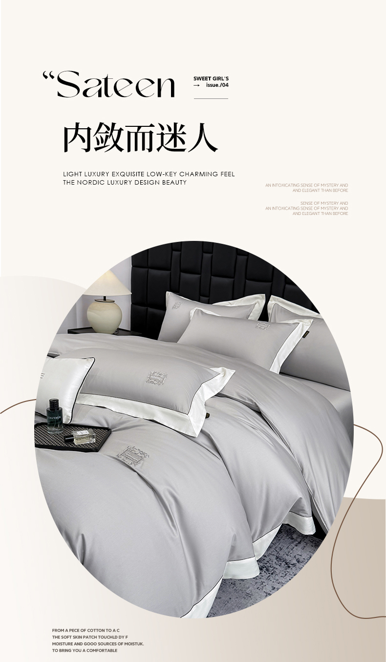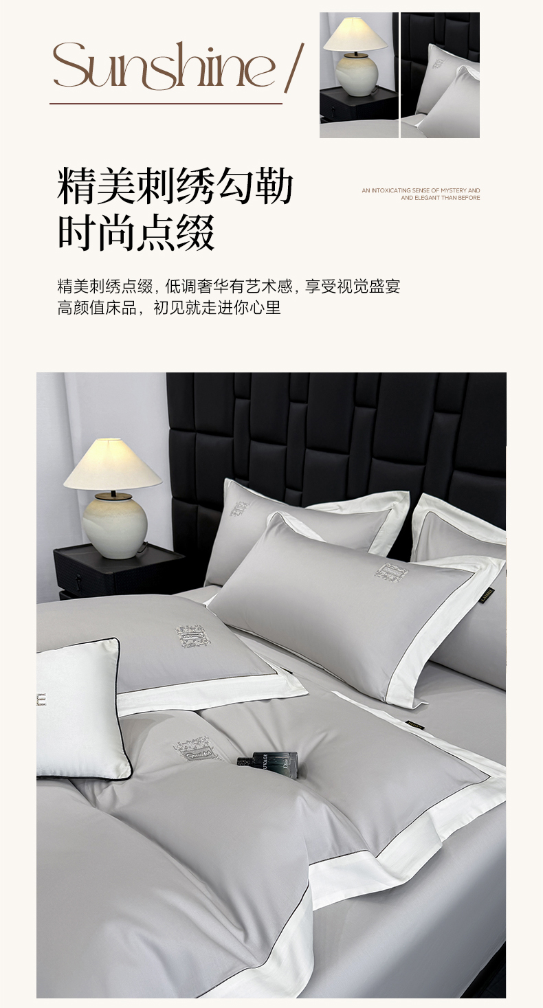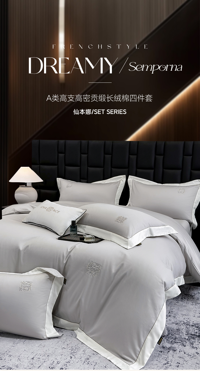 当前位置: 91家纺网 > 商品网购 > 床品套件 > 四件套 > 全棉普通四件套 > 欣宜家纺 2026新款A类100支全棉纯棉50x50s埃及贡缎长绒棉刺绣绣花四件套-仙本娜(控价 券后标准不低于288元) 仙本娜 绅士灰