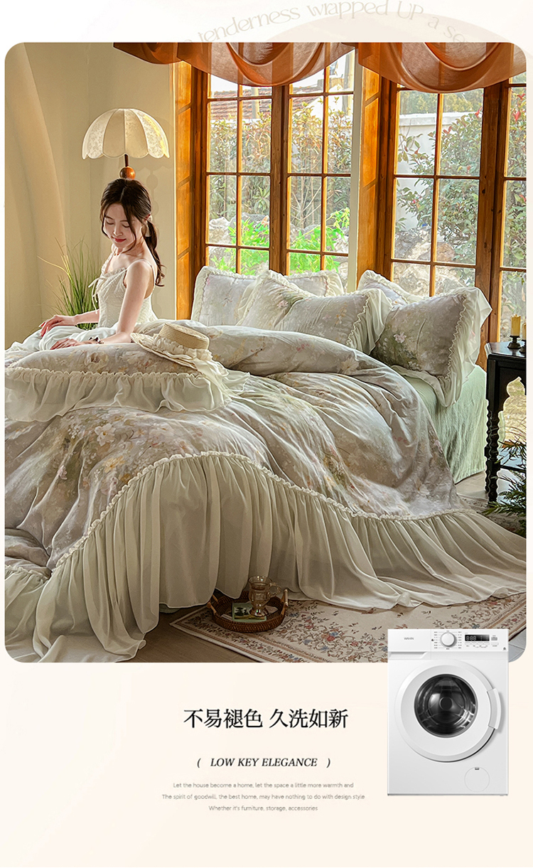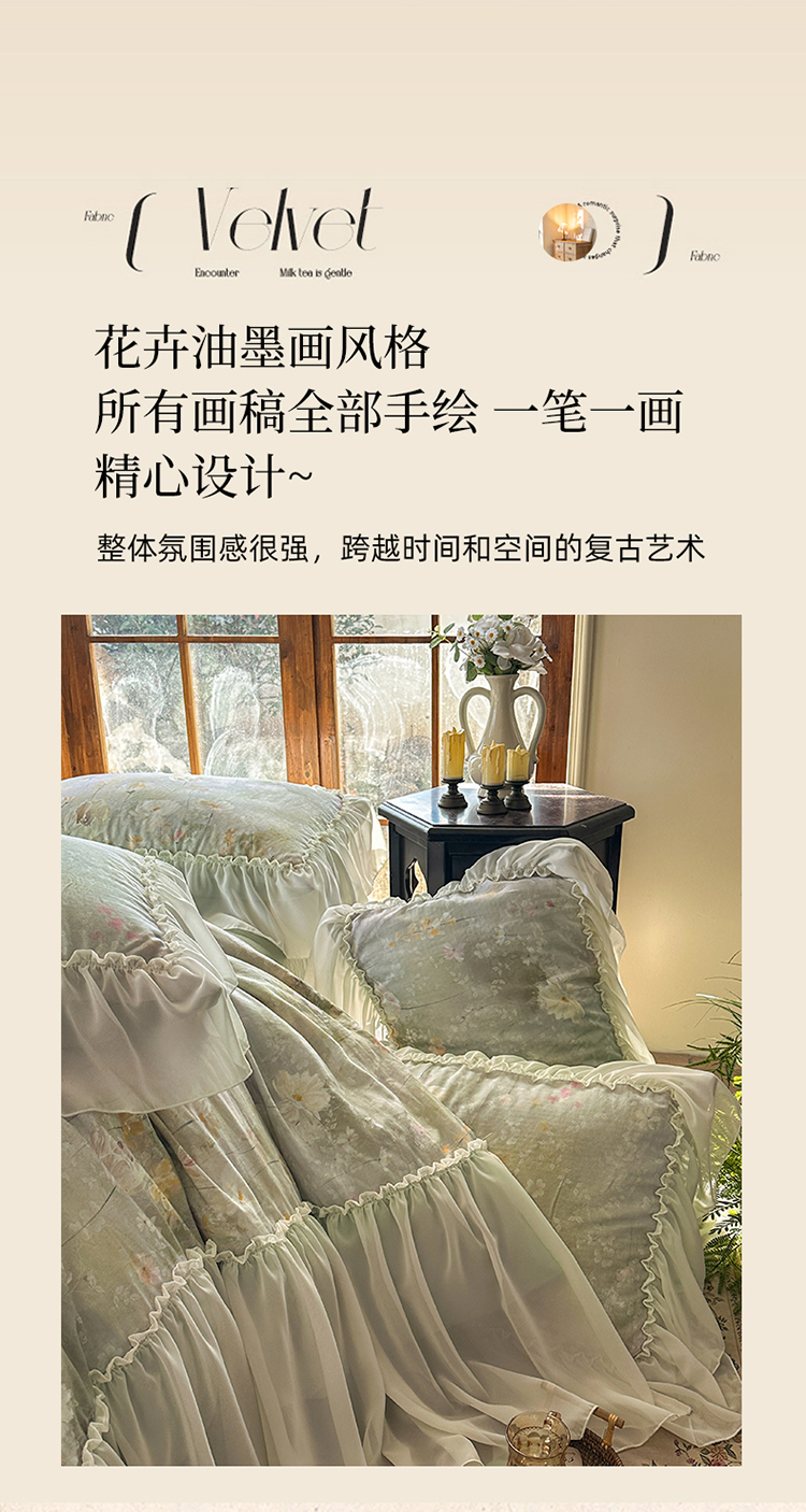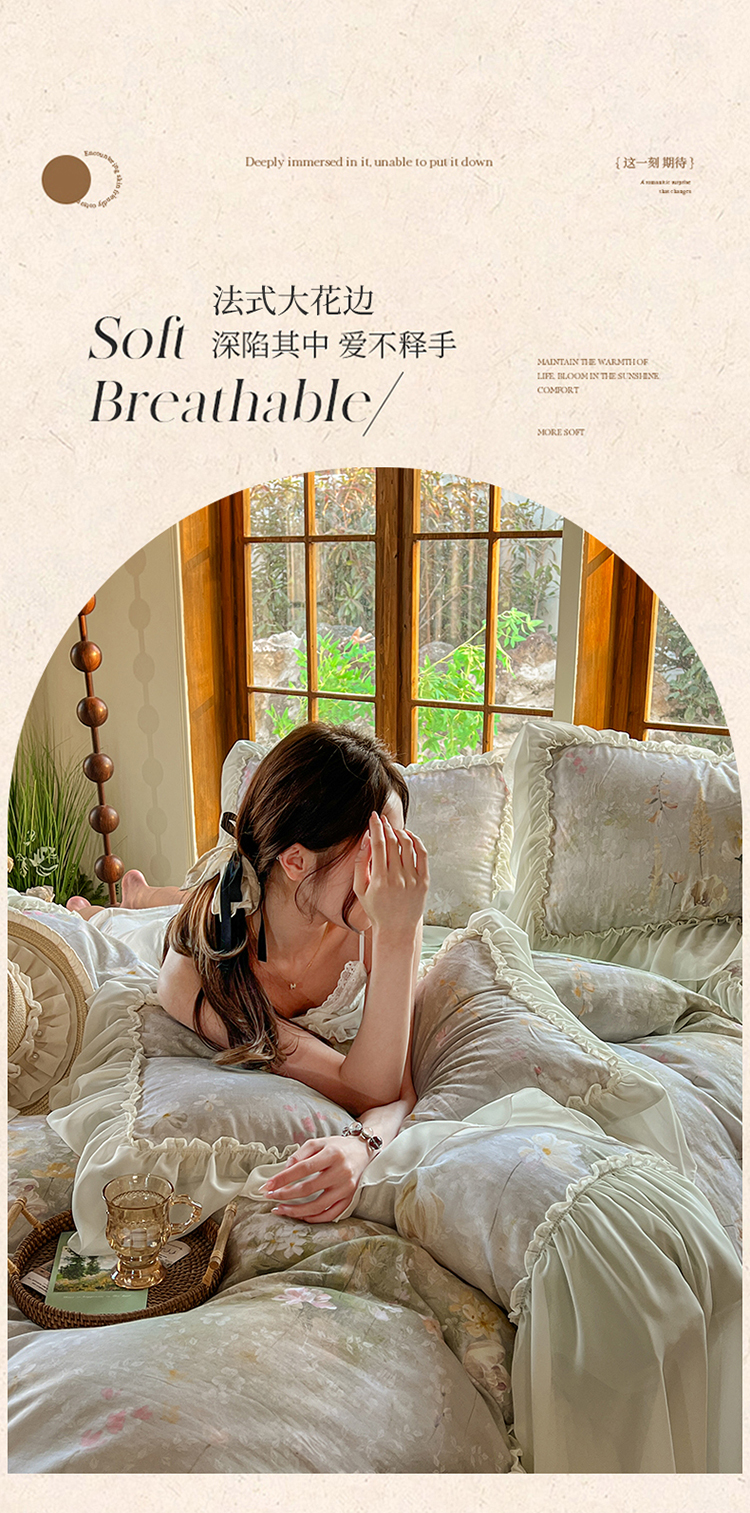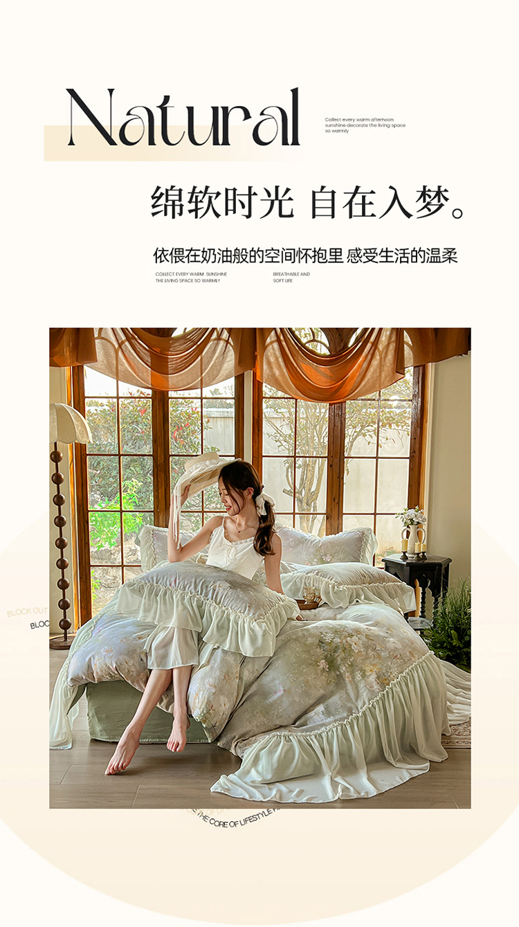 (总)【苏东来】2026高端韩版法式花边油画纯棉全棉双层纱四件套复古赫本公主风浪漫荷叶边花卉纯棉四件套被套床单,青黛,芳菲,花隐,拾光里里,木槿,蔷薇恋人,虞美人,疏影,暮色玫瑰,爱丽丝