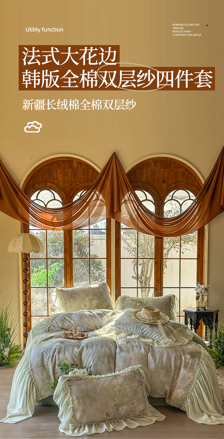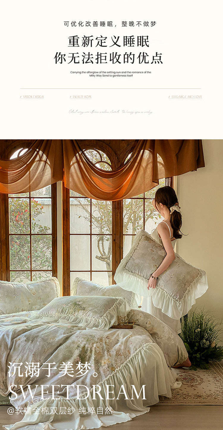 商品名称:(总)2026高端韩版法式公主复古油画风全棉纯棉双层纱四件套赫本浪漫荷叶花边仙女风全棉双层纱四件套床上用品被套床单床笠