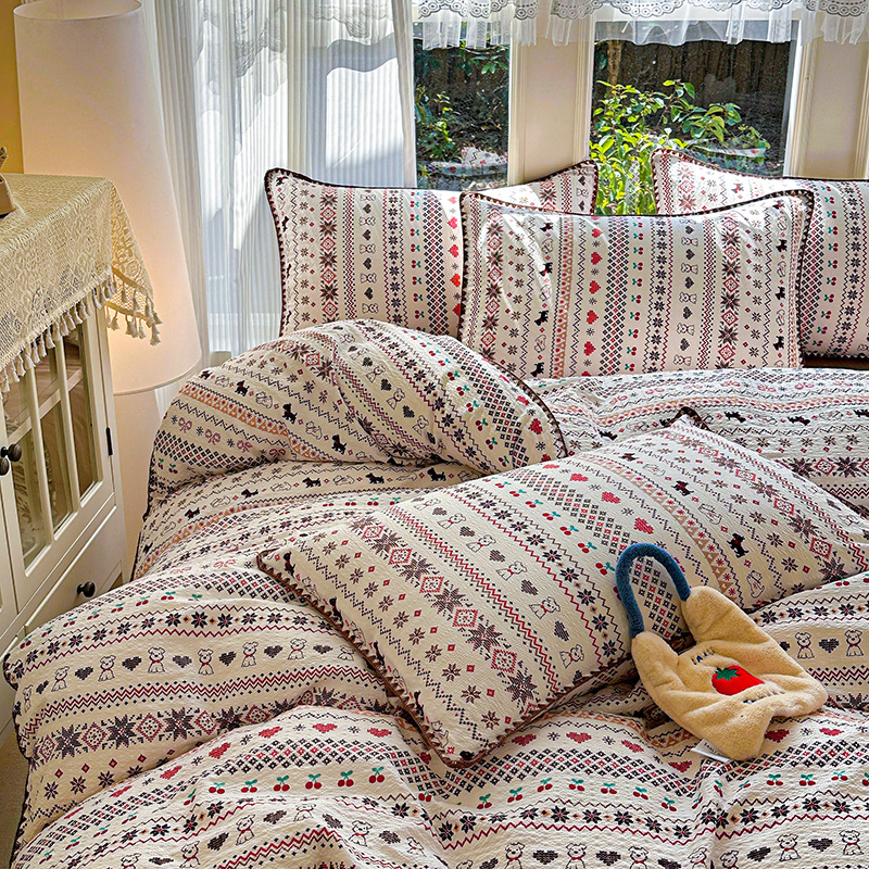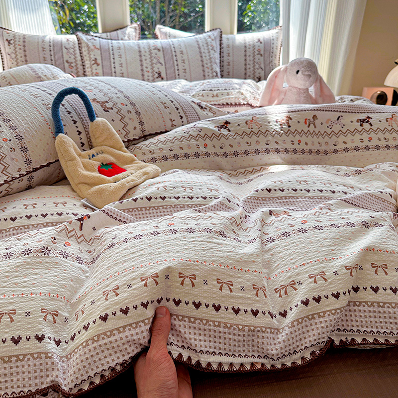 当前位置: 91家纺网 > 商品网购 > 床品套件 > 四件套 > 化纤普通四件套 > 梵希雅 2026新款费尔岛风贝壳边泡芙棉四件套床单被套宿舍三件套单品 棕蓝麋鹿