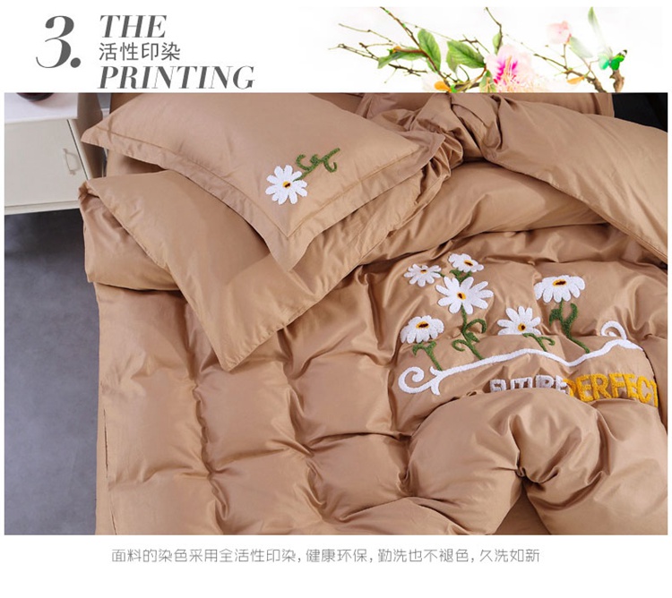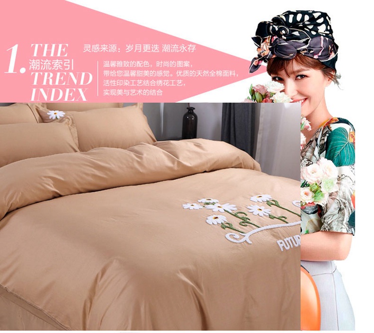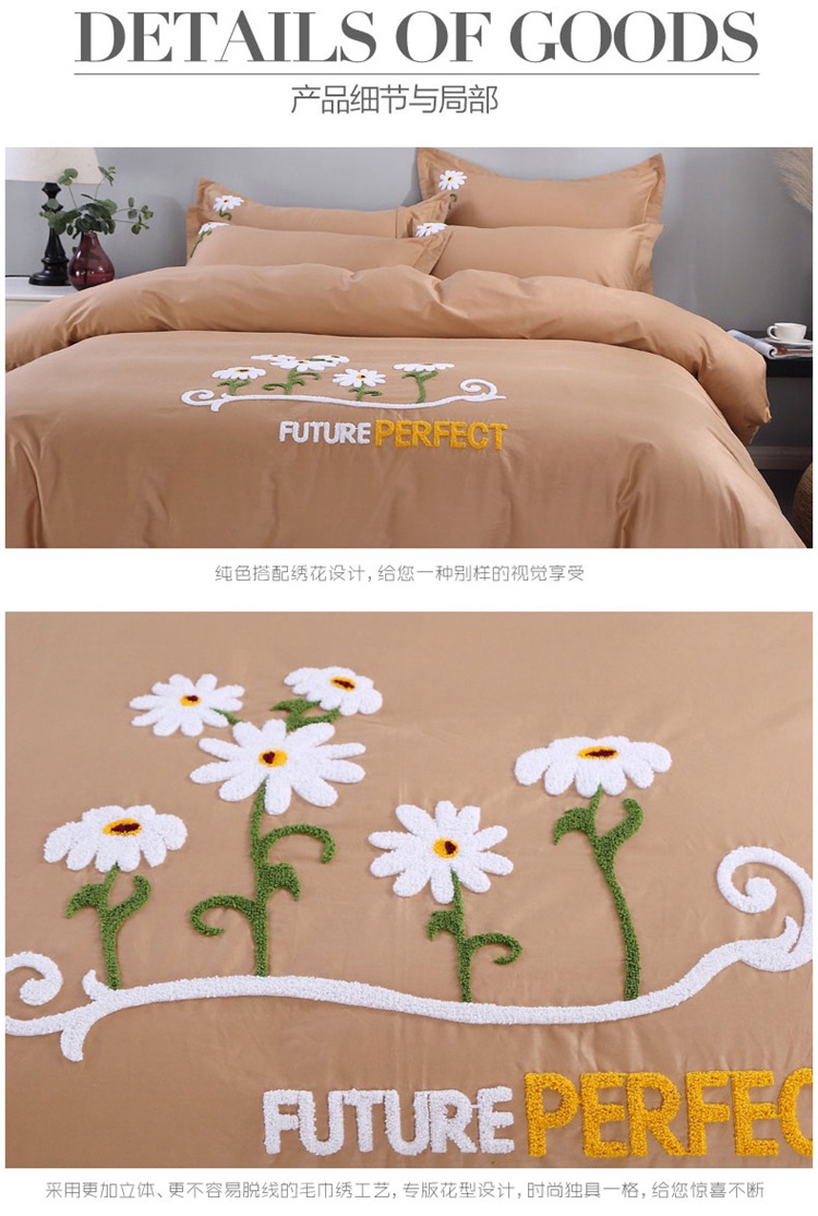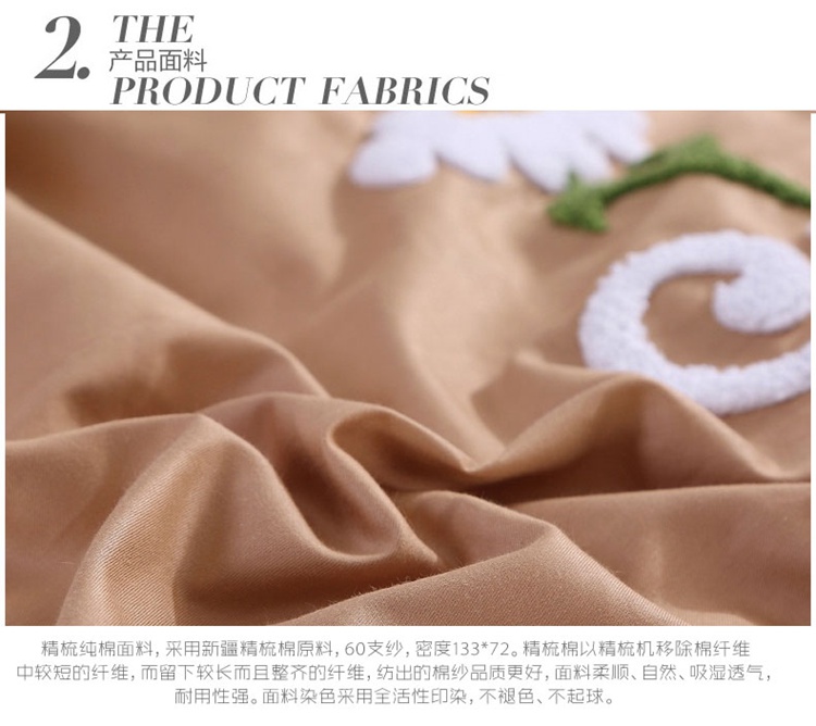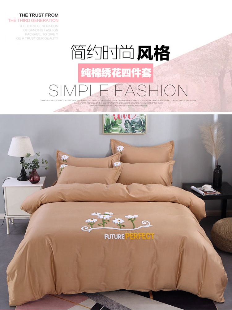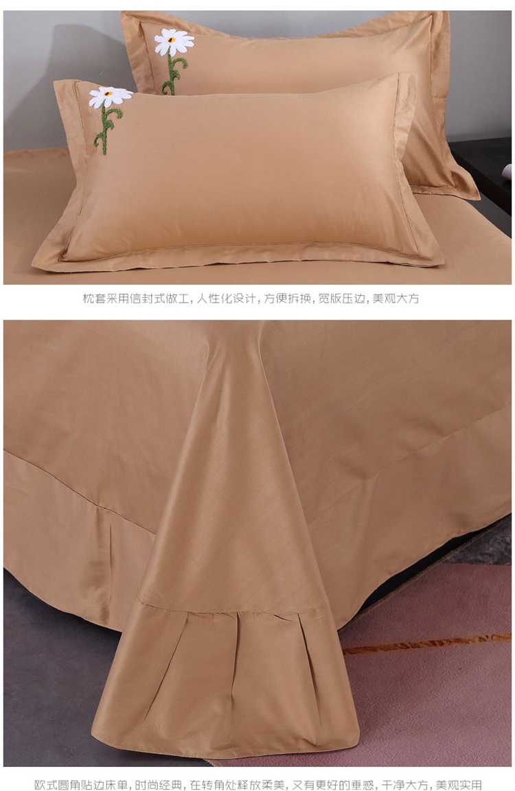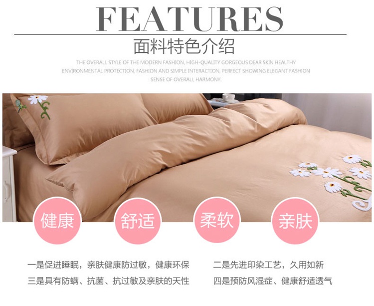 全棉133*72纯色绣花四件套,采用新疆精梳棉,60支纱,密度133*72。专版绣花花型设计,高精度、高密度立体毛巾绣工艺,相比普通绣花更加牢固不易脱线,美观又耐用。