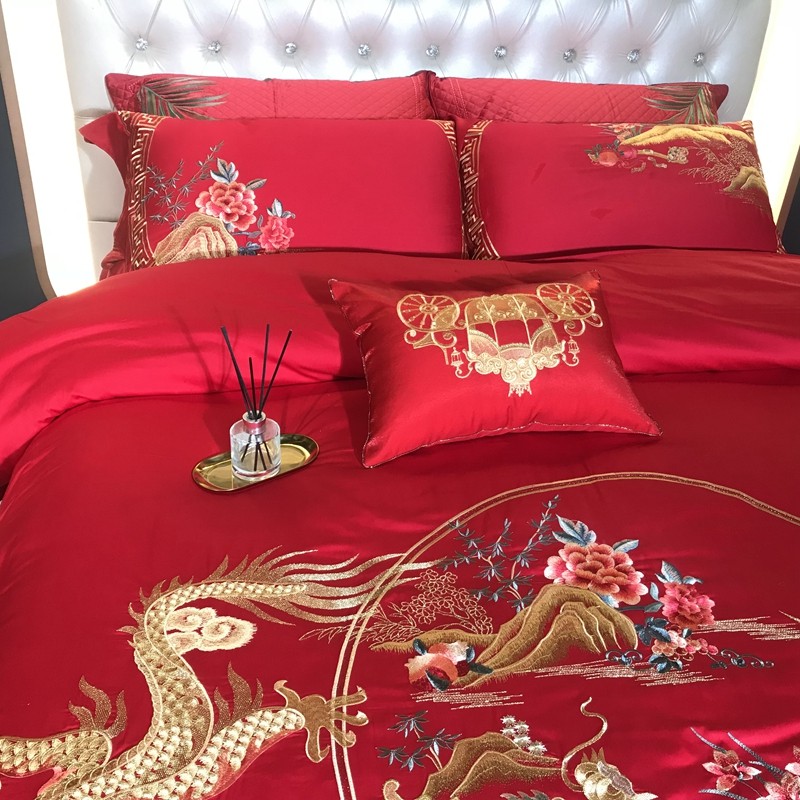 总玖玖爱家纺 新款轻奢风120支贡缎长绒棉高精密刺绣婚嫁系列四件套,欢喜人家,吉祥如意,金色婚典,情定一生,喜迎龙凤