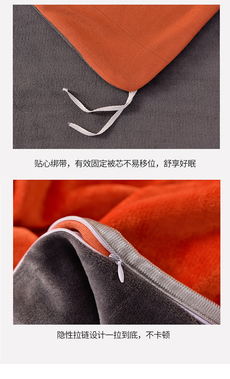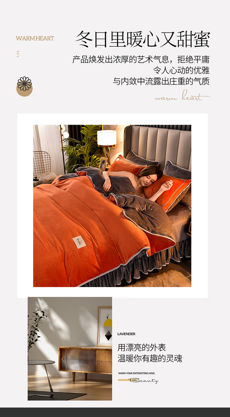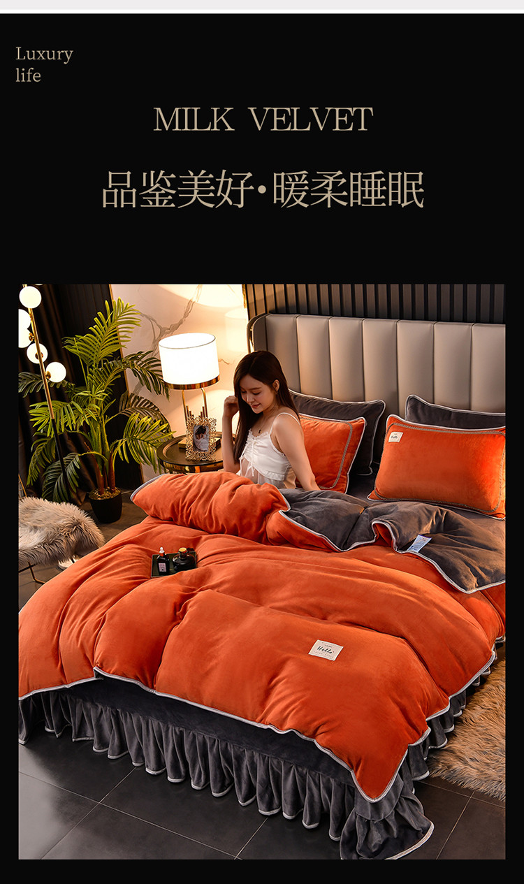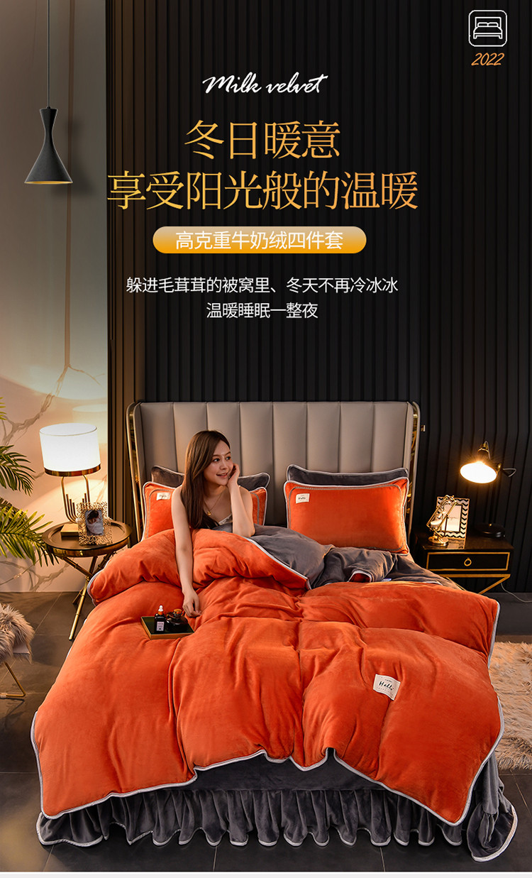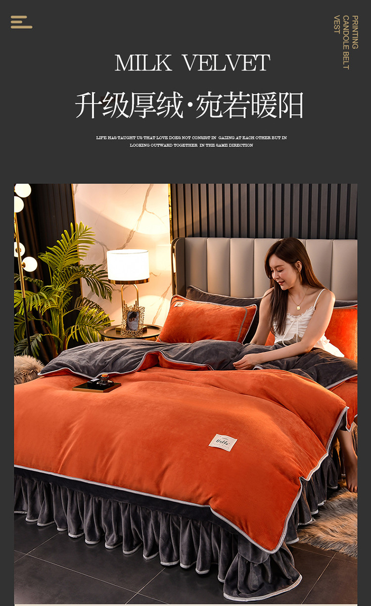 商品名称:牵梦萦纯色加厚牛奶绒法莱绒四件套秋冬季加绒床裙款 桔色+深灰
