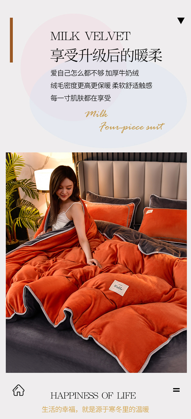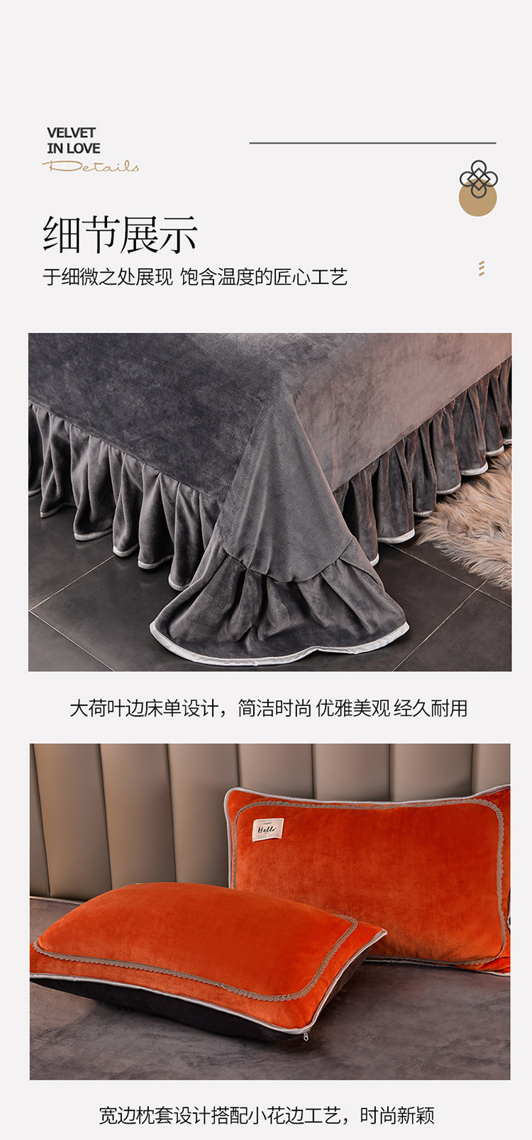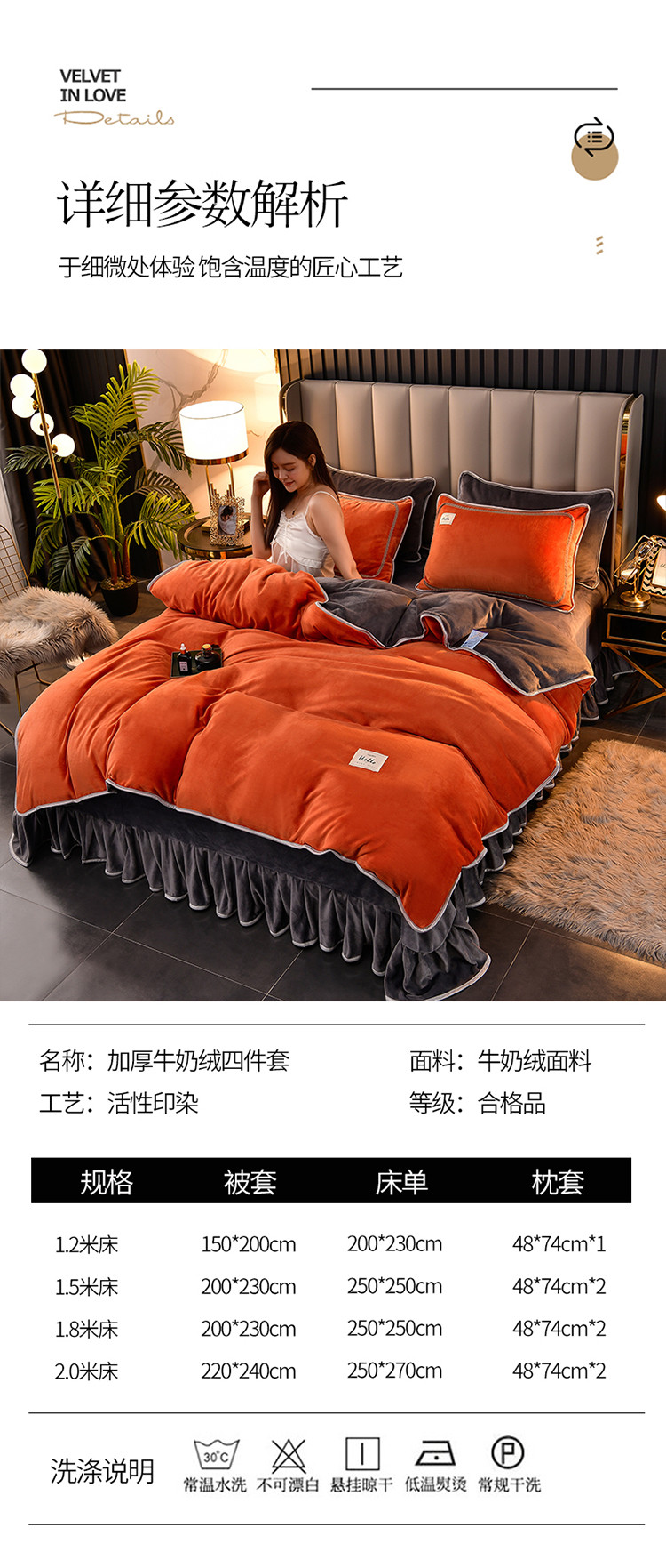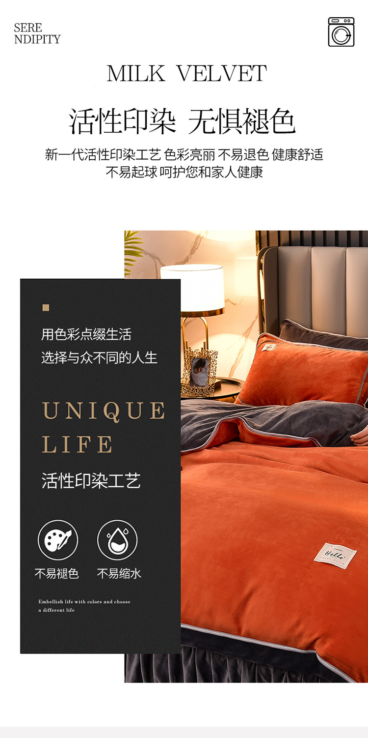 商品名称:牵梦萦纯色加厚牛奶绒法莱绒四件套秋冬季加绒床裙款 桔色+深灰