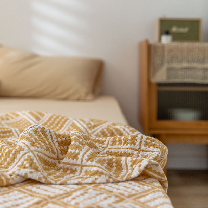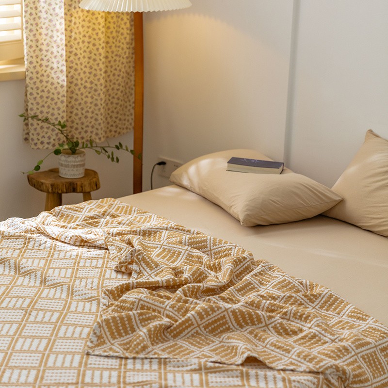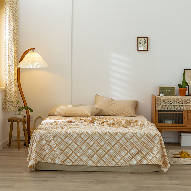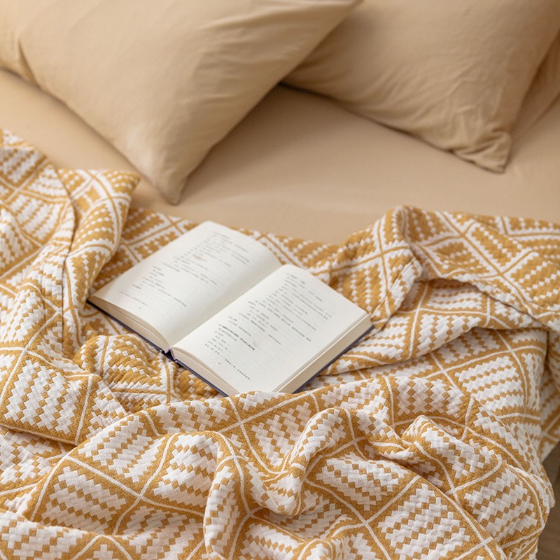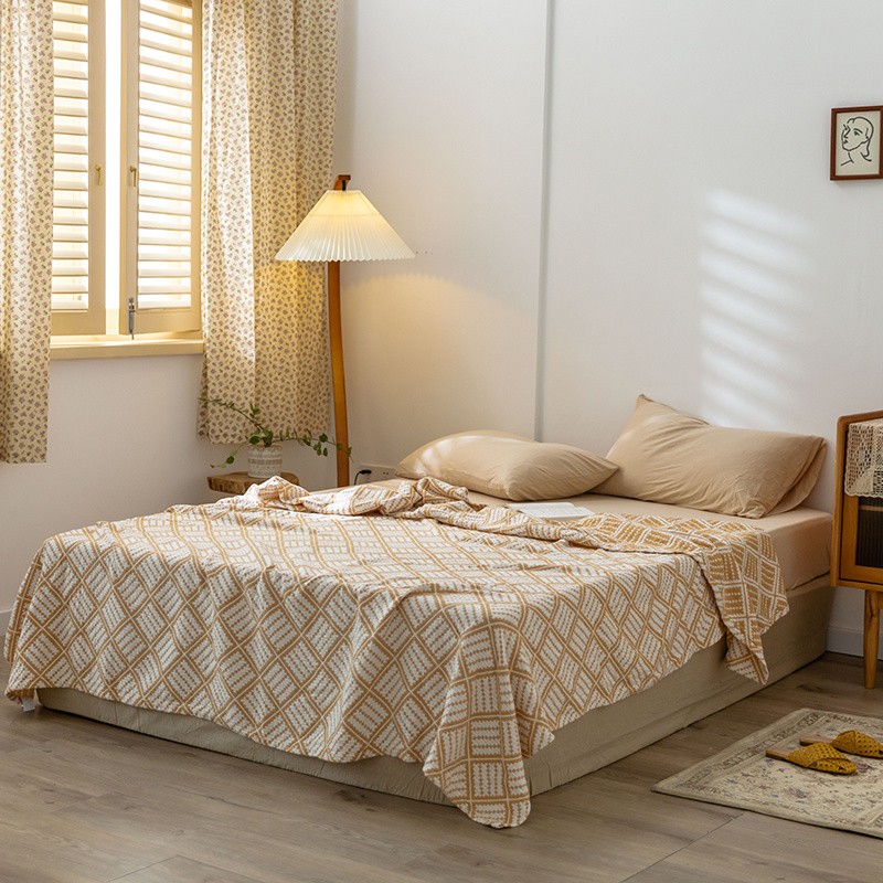 雯雨 2022新款无印风纱布毛巾被夏被直播方格圆点黄