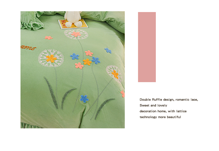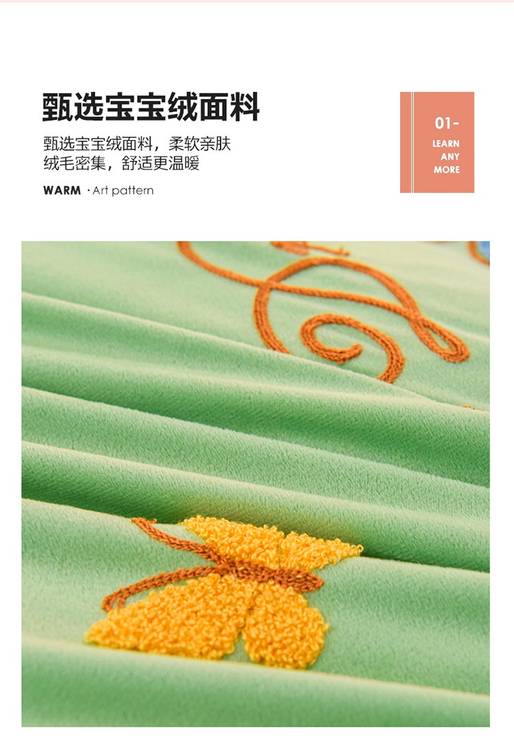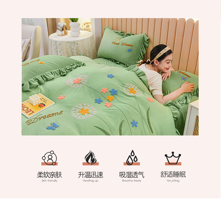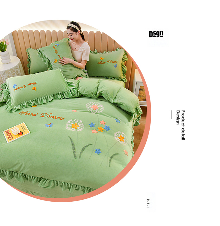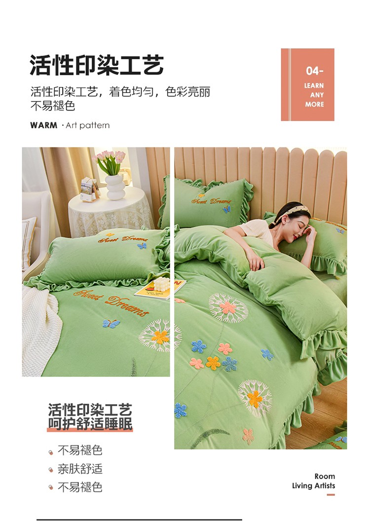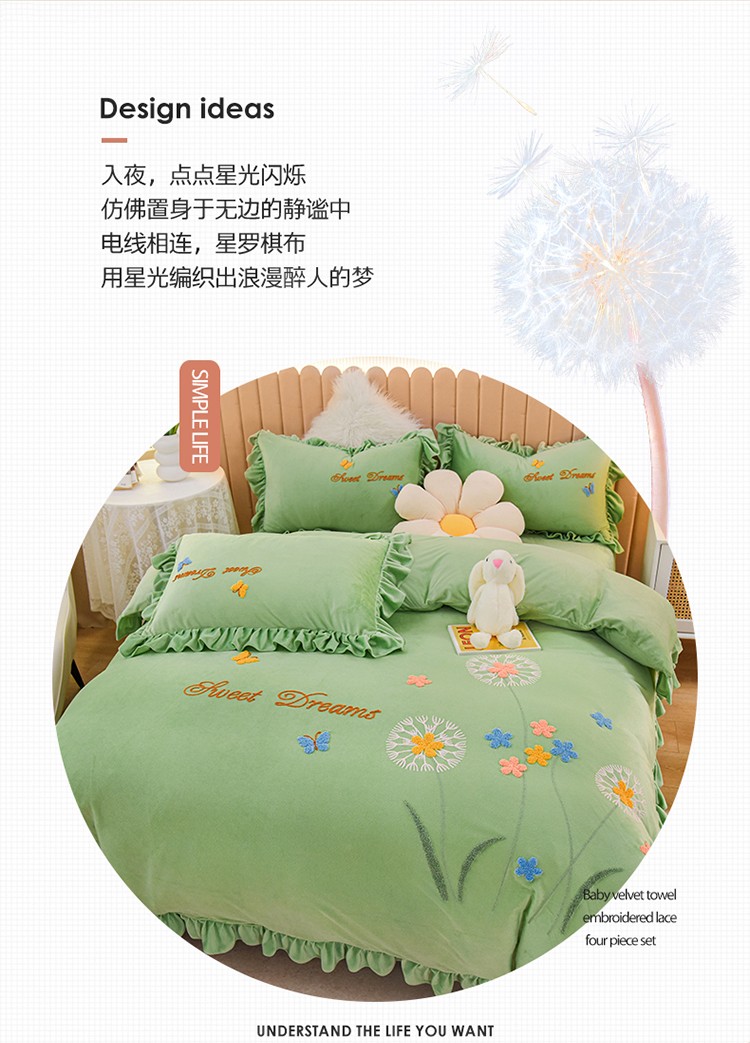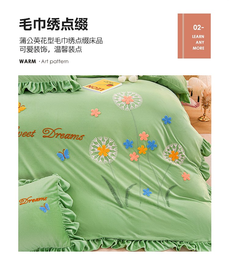 商品名称:唐人居 2025新款宝宝绒毛巾绣花边四件套-蒲公英之恋-绿
