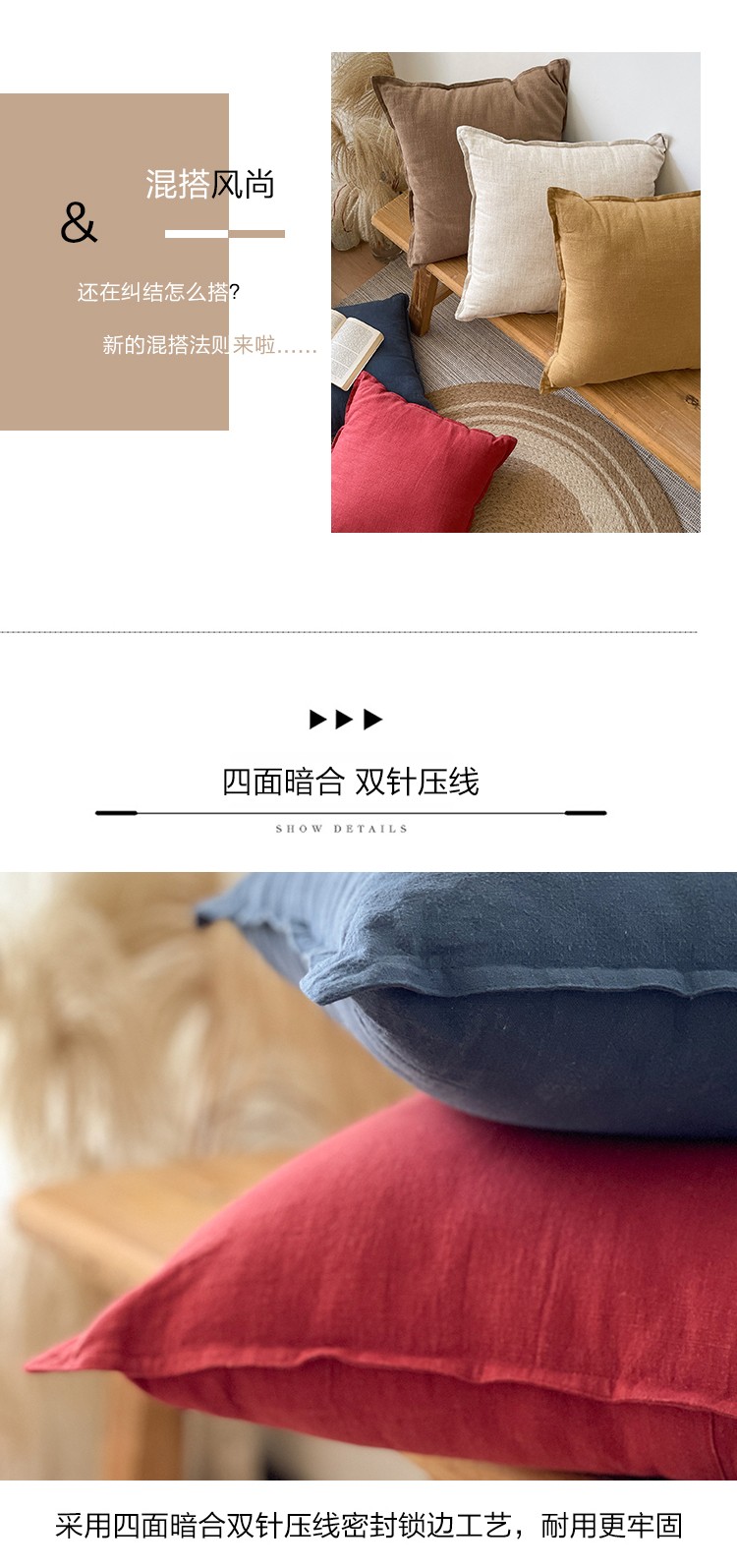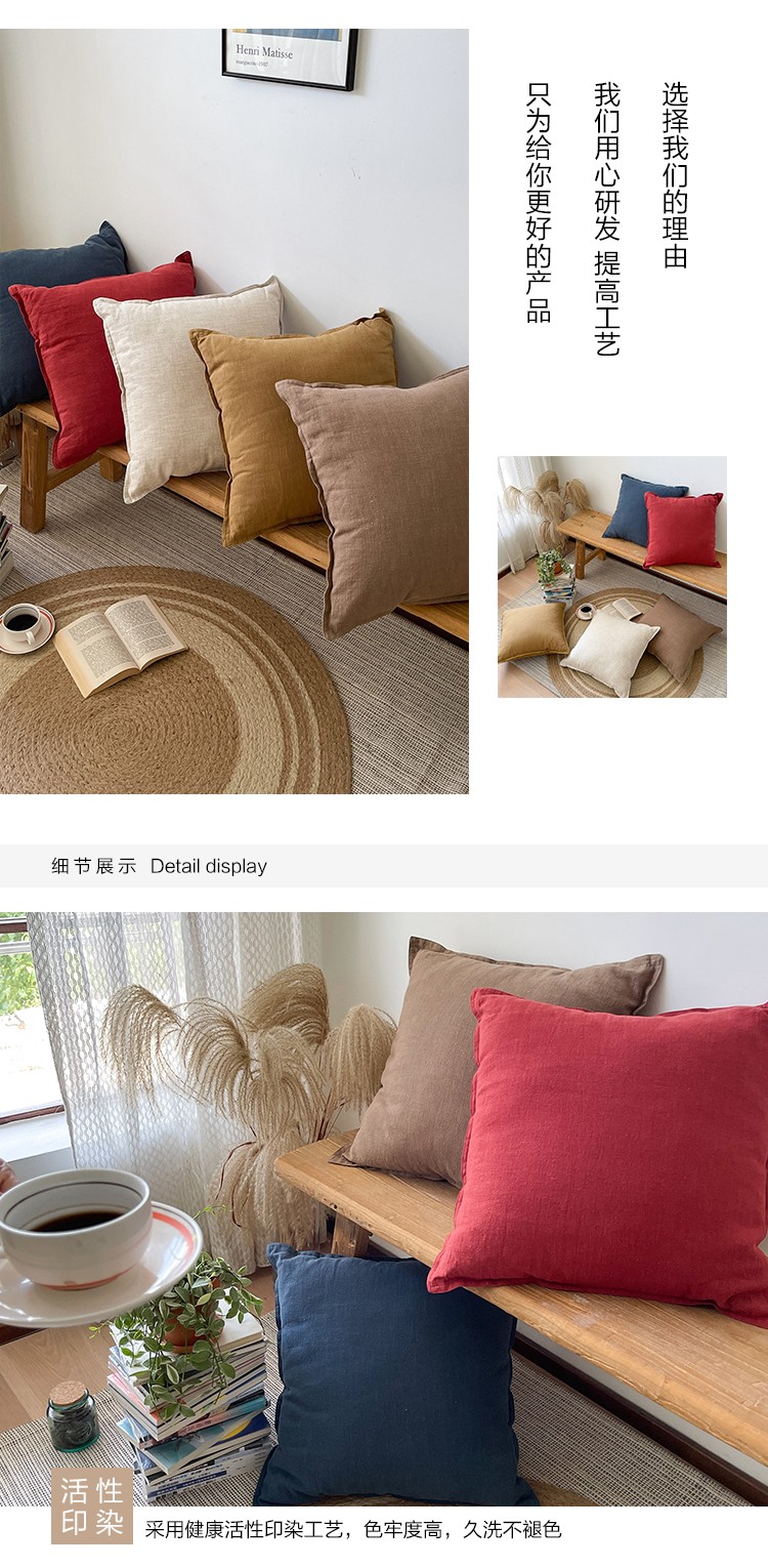 (总)美茉家居 2023新款棉麻双针抱枕,湖蓝,酒红,麻本,摩卡棕,土褐
