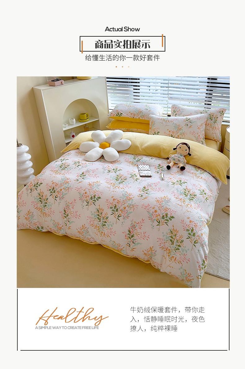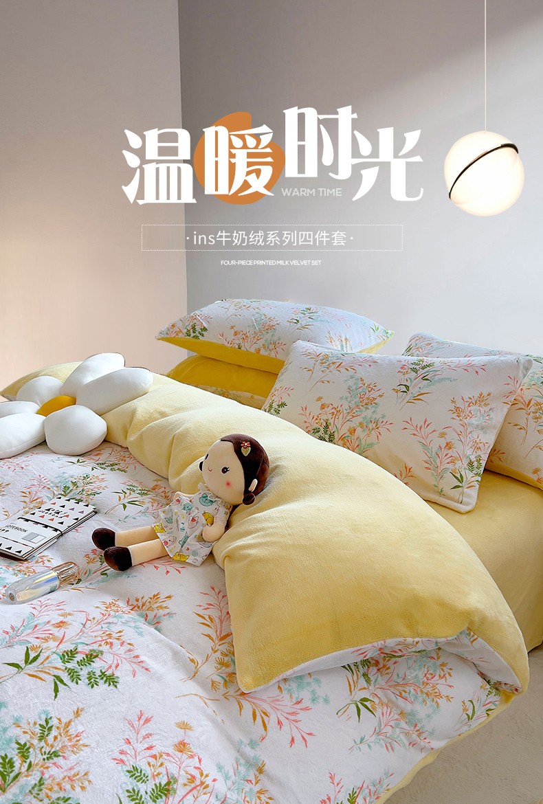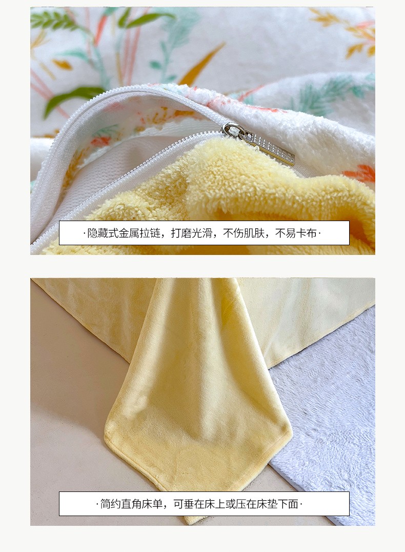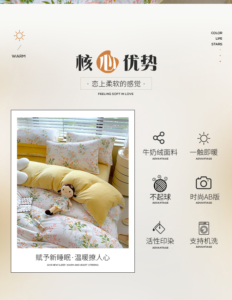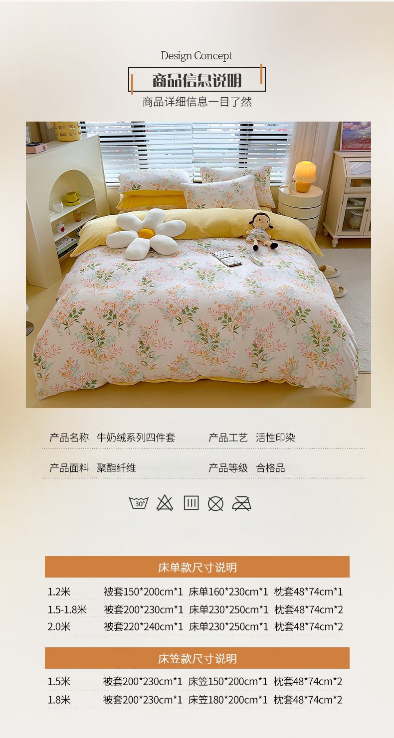 当前位置: 91家纺网 > 商品网购 > 床品套件 > 四件套 > 牛奶绒四件套 > 麦瑞家纺 2024新款水晶绒牛奶绒四件套 花花世界