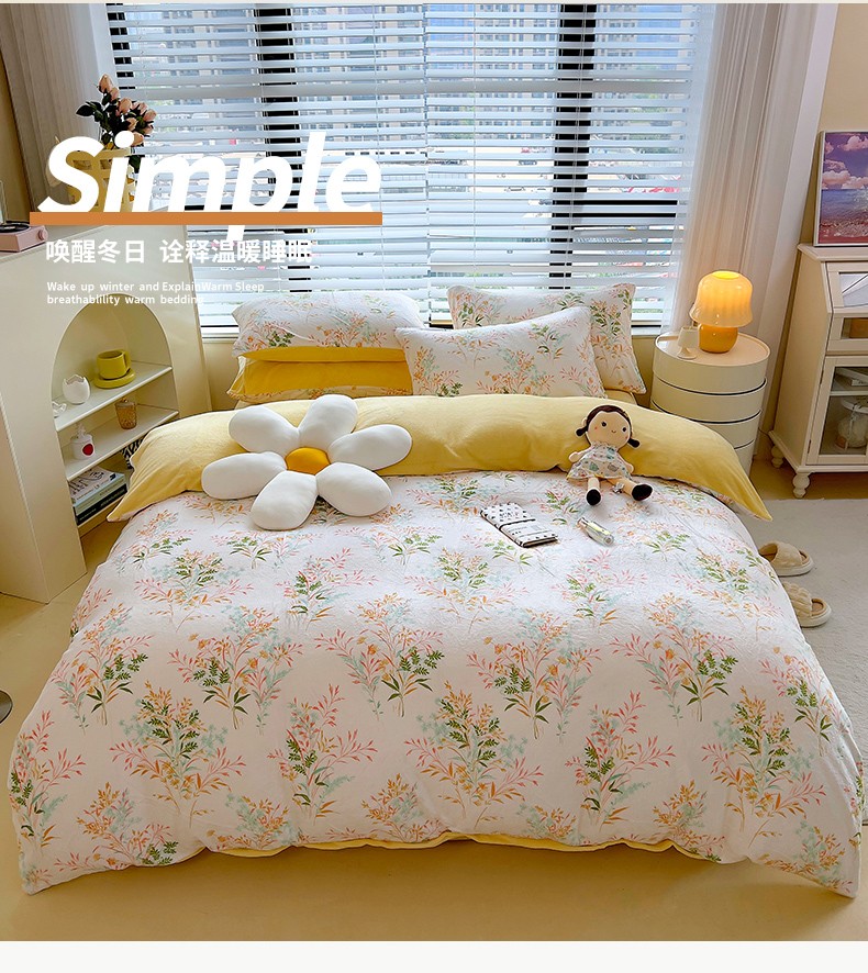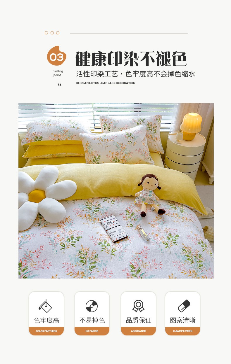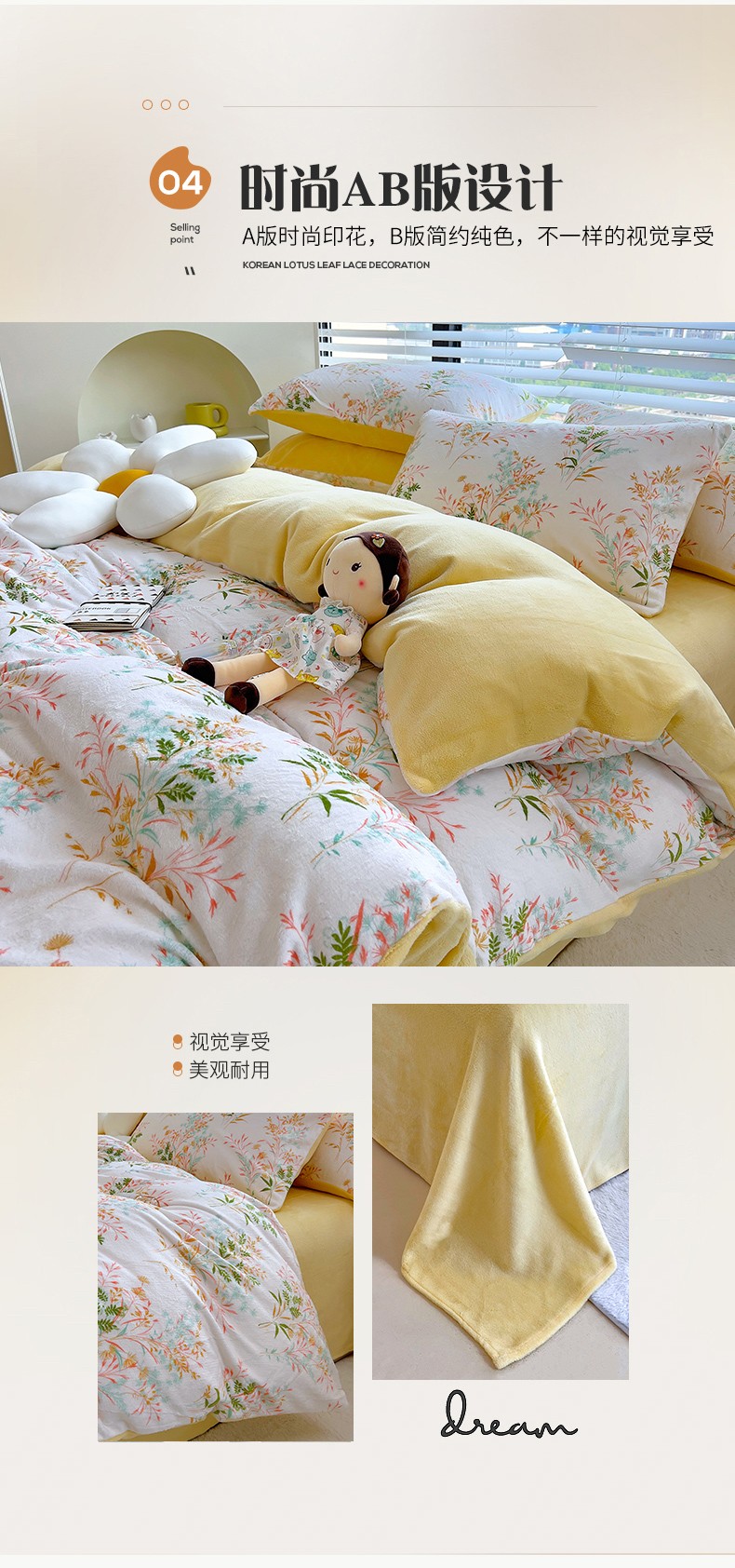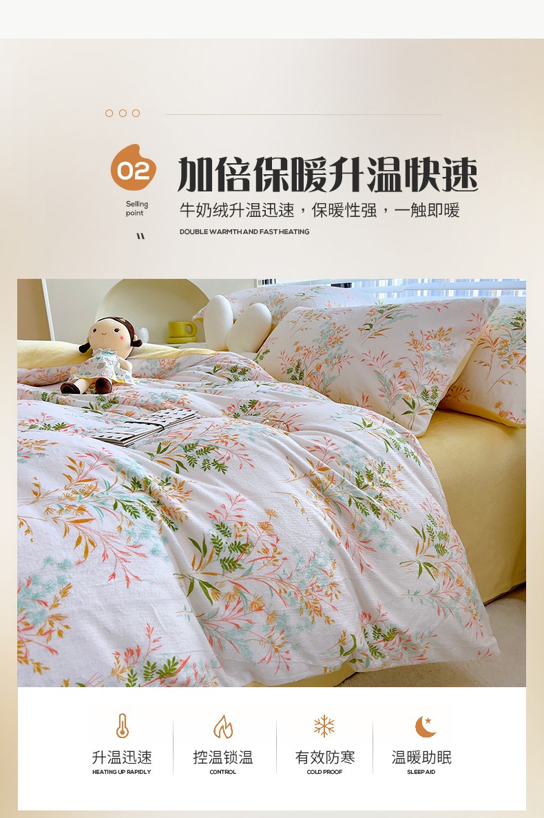 当前位置: 91家纺网 > 商品网购 > 床品套件 > 四件套 > 牛奶绒四件套 > 麦瑞家纺 2024新款水晶绒牛奶绒四件套 花花世界