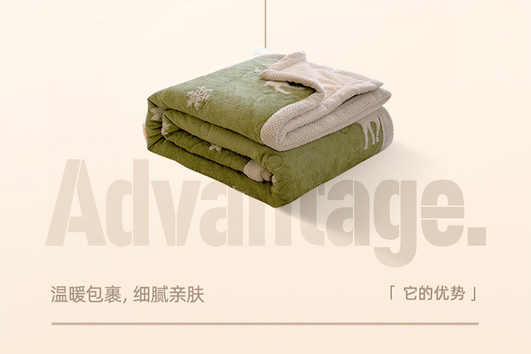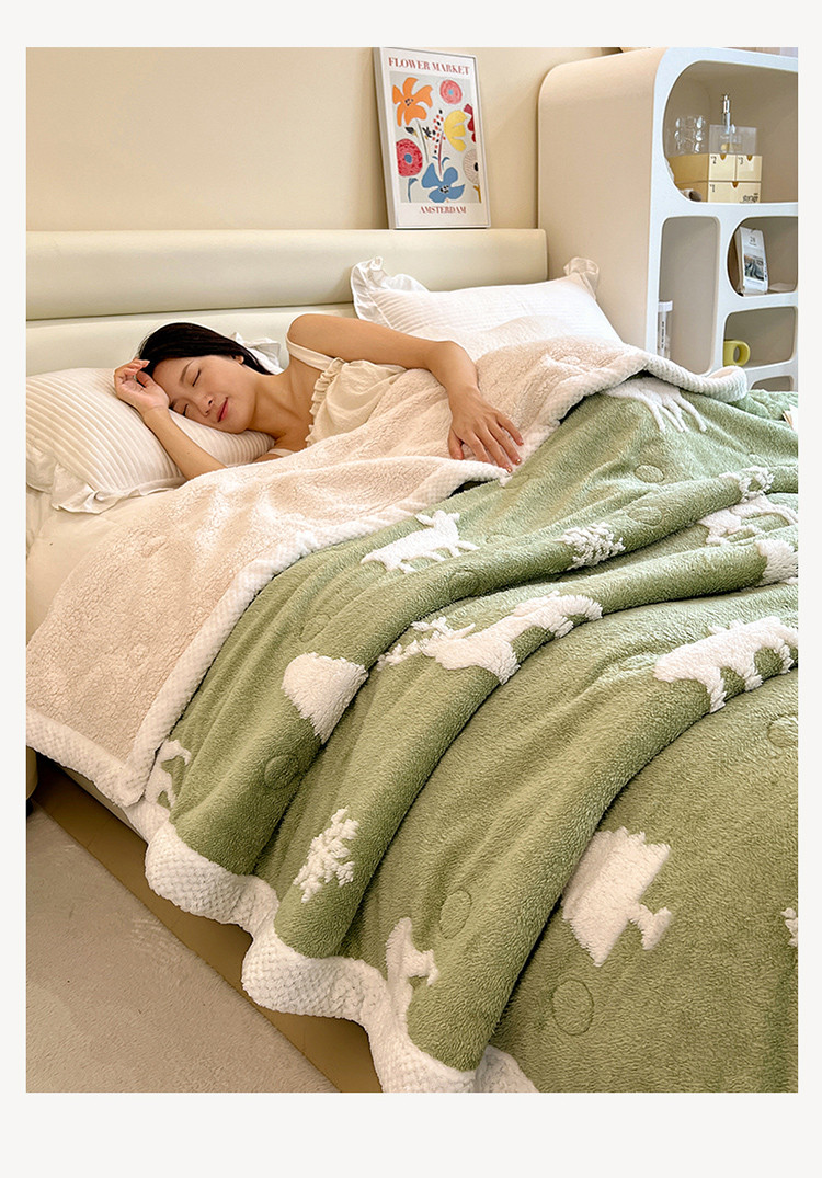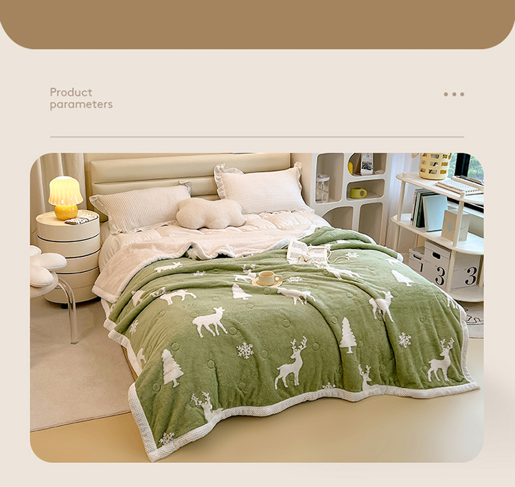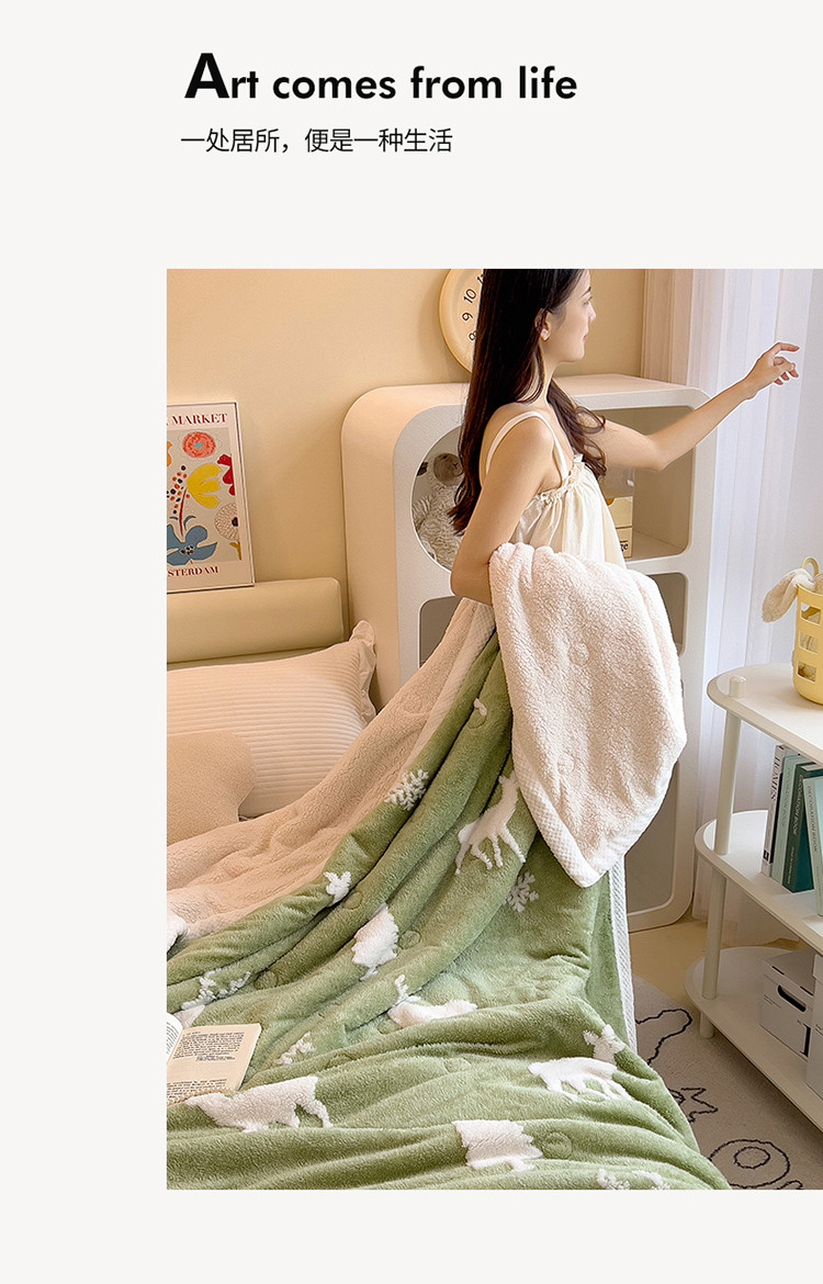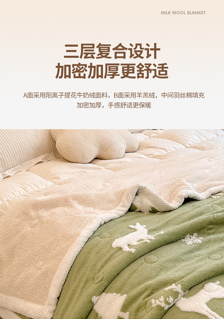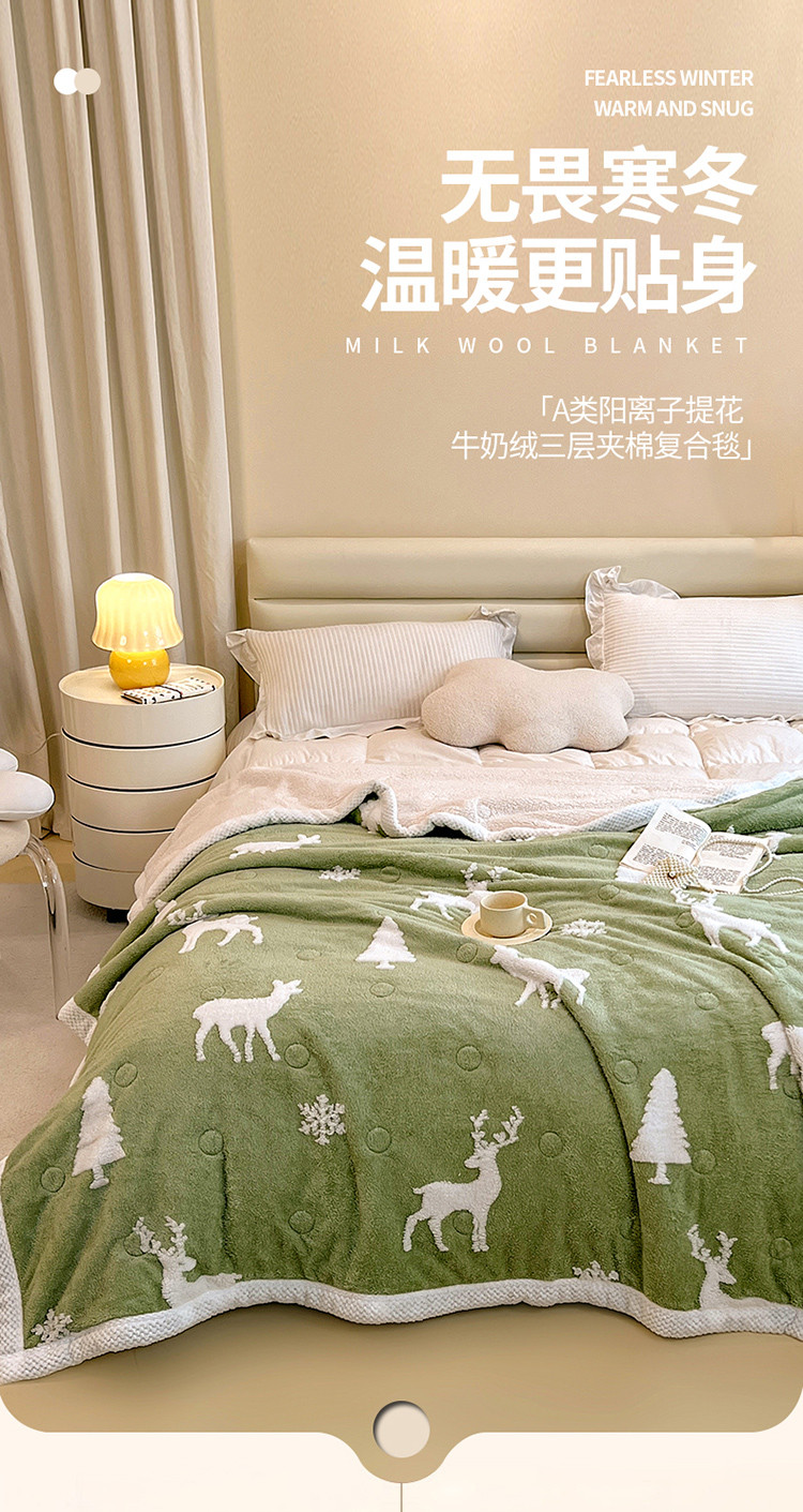 慕木22新款保暖A类阳离子提花牛奶绒三层夹棉复合毯麋鹿森林绿