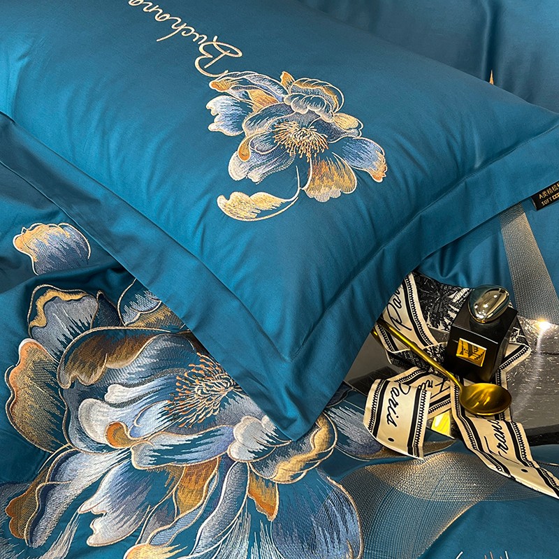 商品名称:莱阁亿 2023新款高支高密精疏长绒棉A类刺绣床单款四件套 烟雨赋-蓝