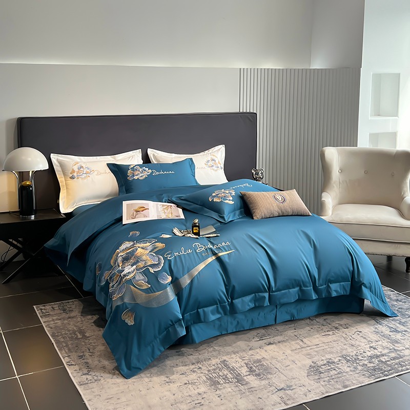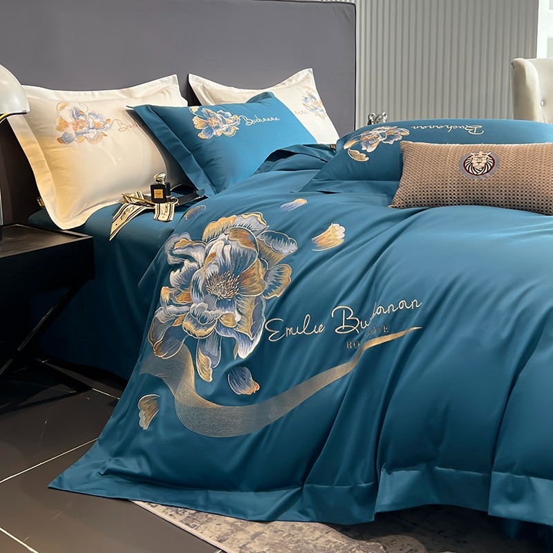 莱阁亿 2023新款高支高密精疏长绒棉A类刺绣床单款四件套 烟雨赋-蓝