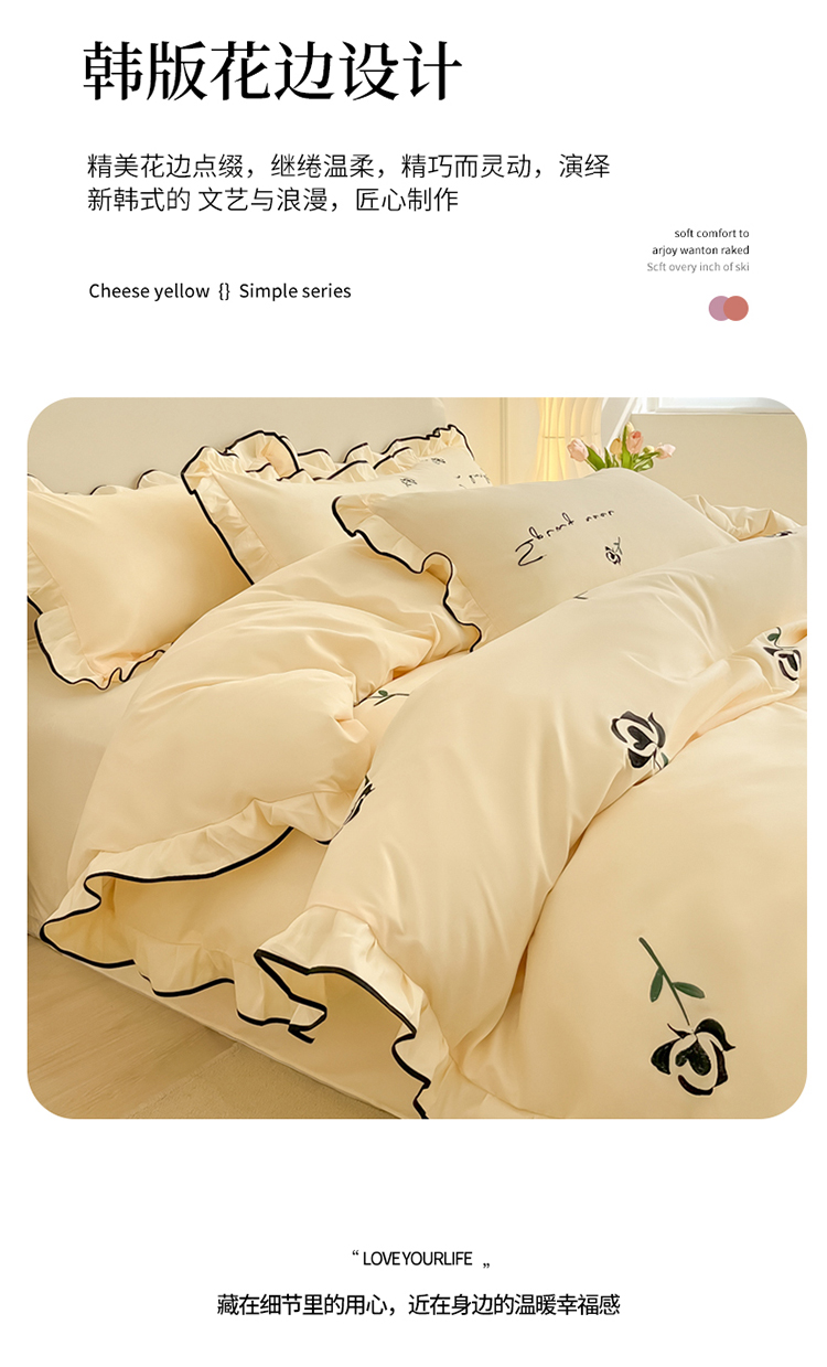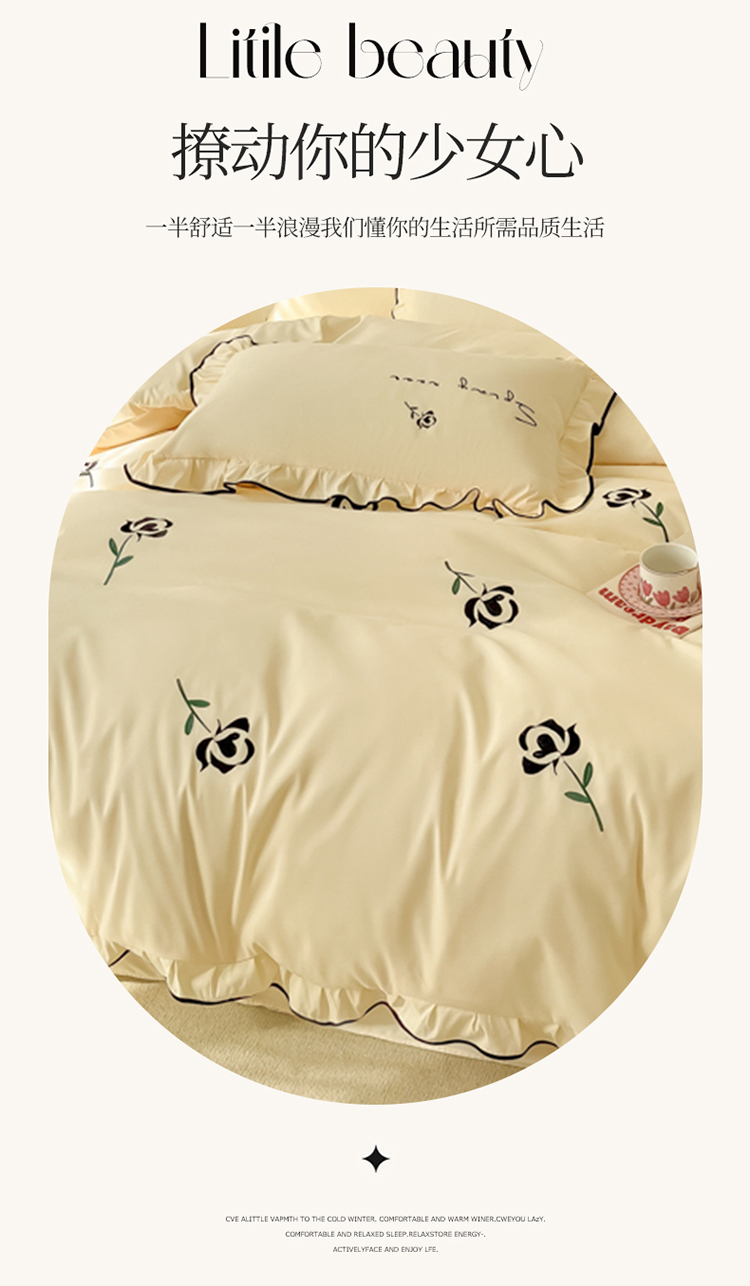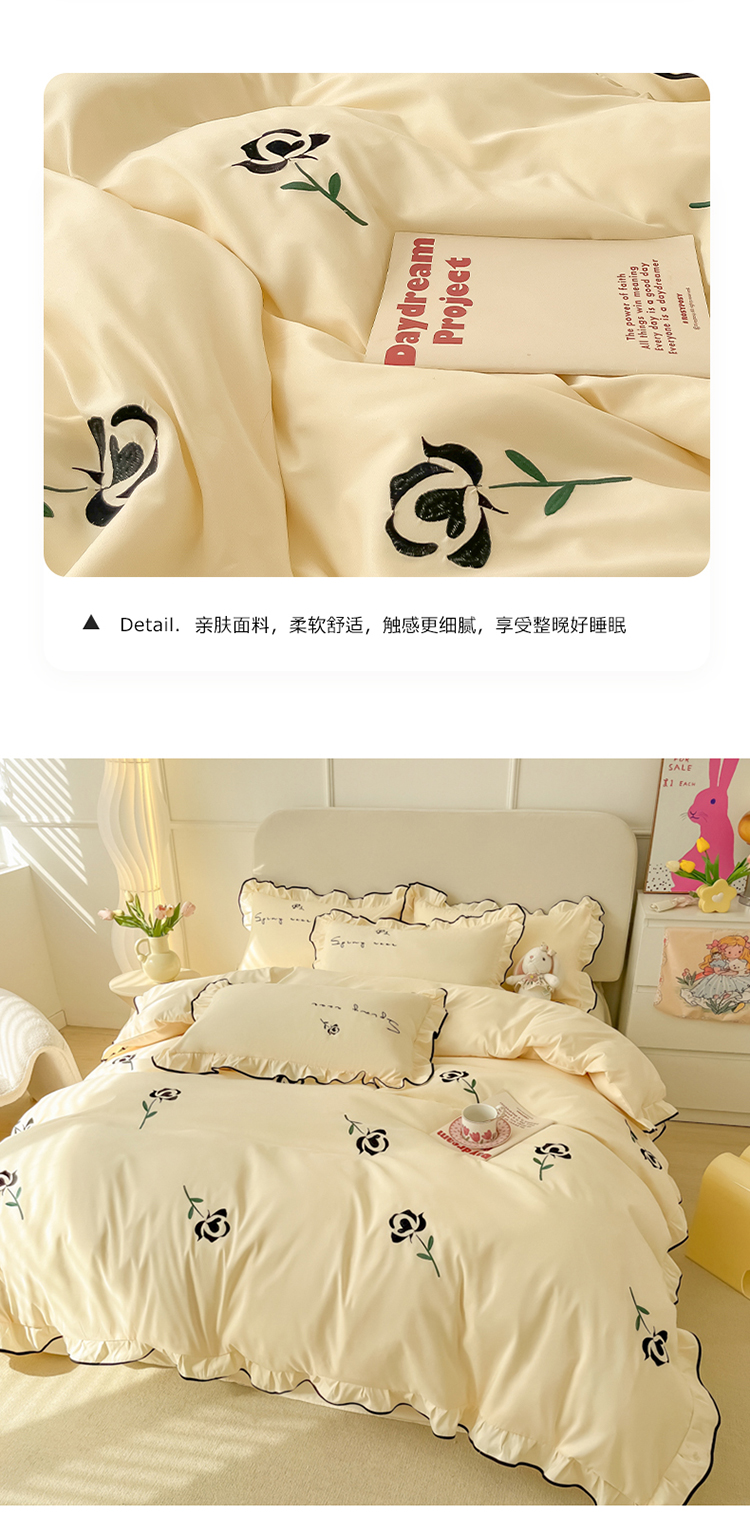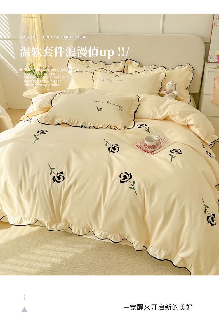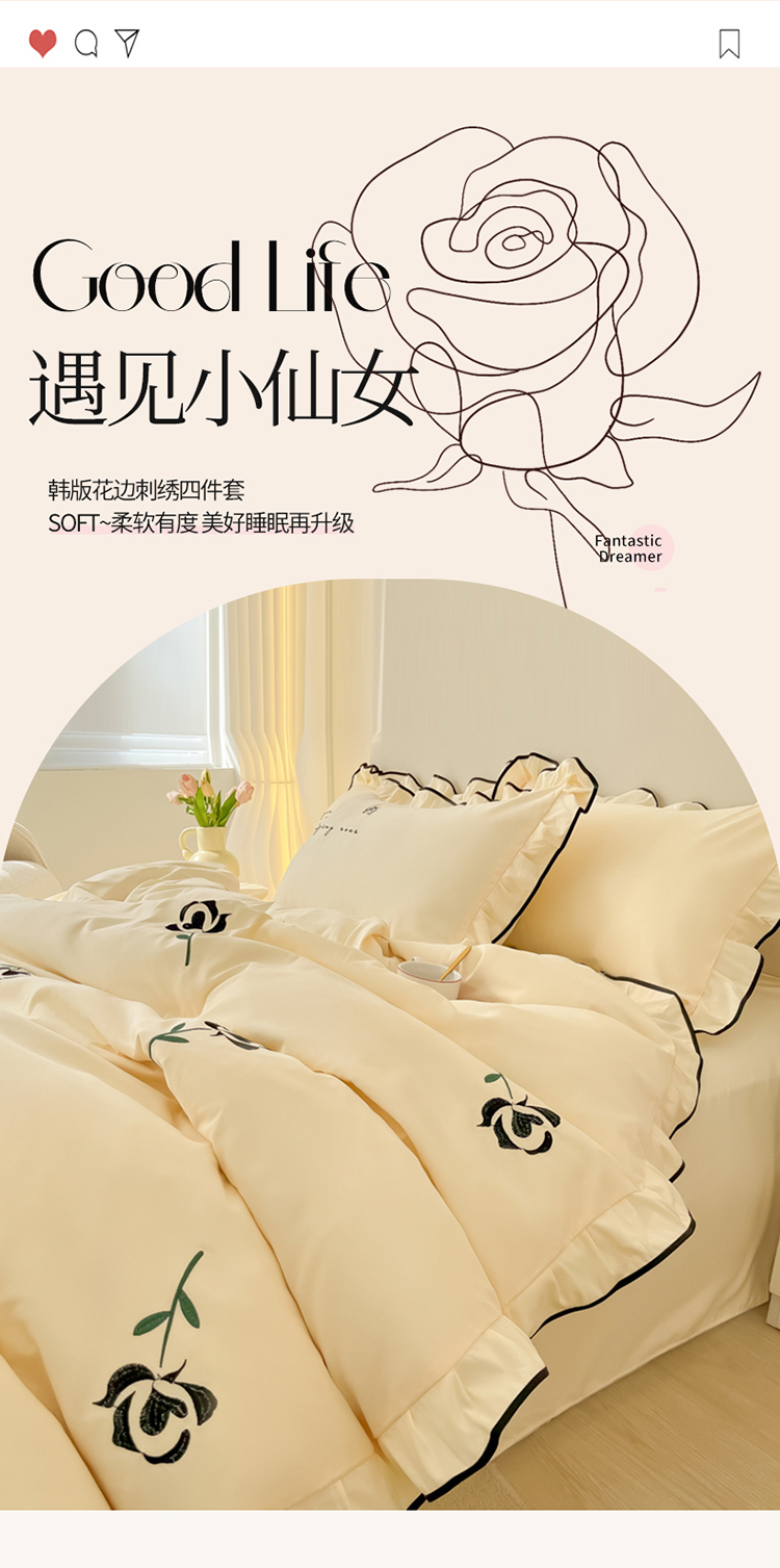 (总)韩都家居 2023新款花边刺绣玫瑰之约系列四件套,小情歌-奶白,小情歌-藕粉,玫瑰之约-红,玫瑰之约-黑