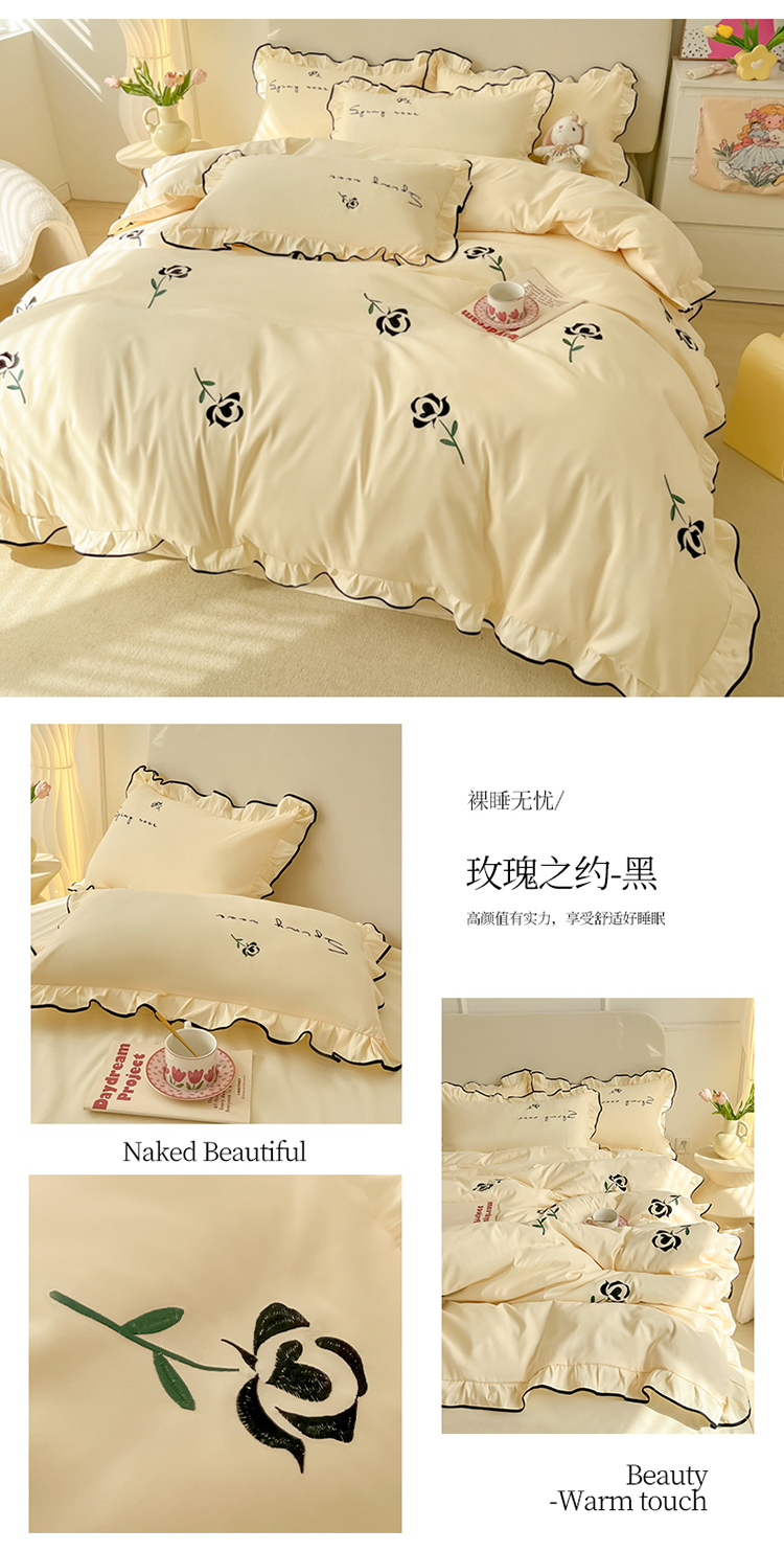 商品名称:韩都家居 2023新款花边刺绣玫瑰之约系列四件套 玫瑰之约-黑
