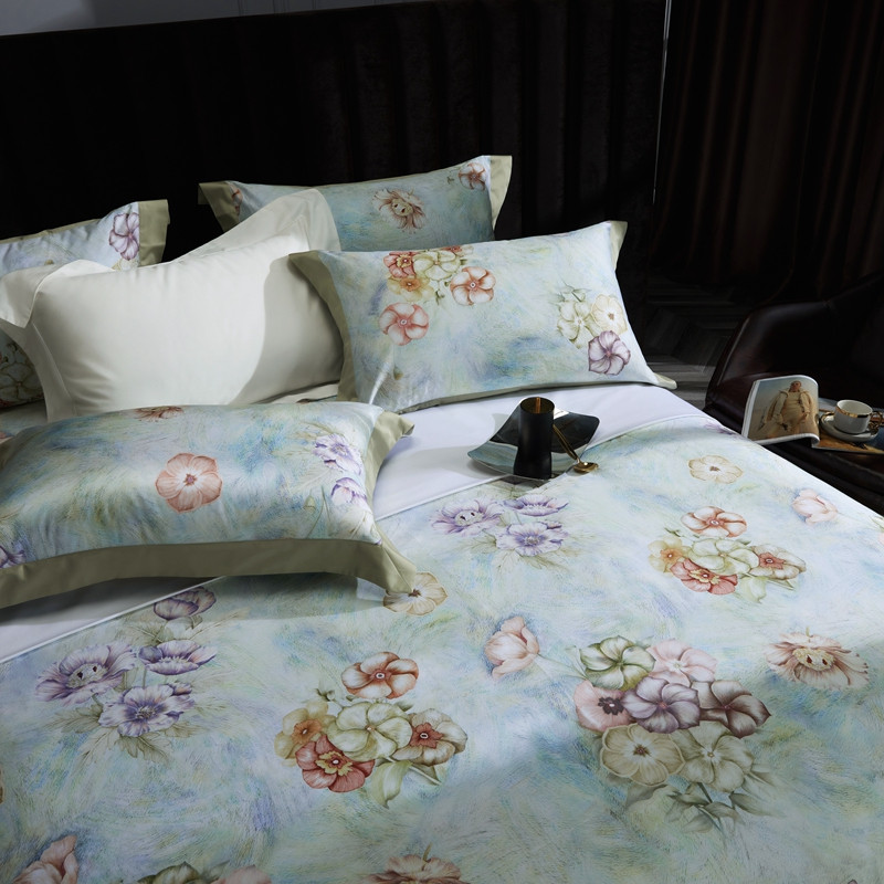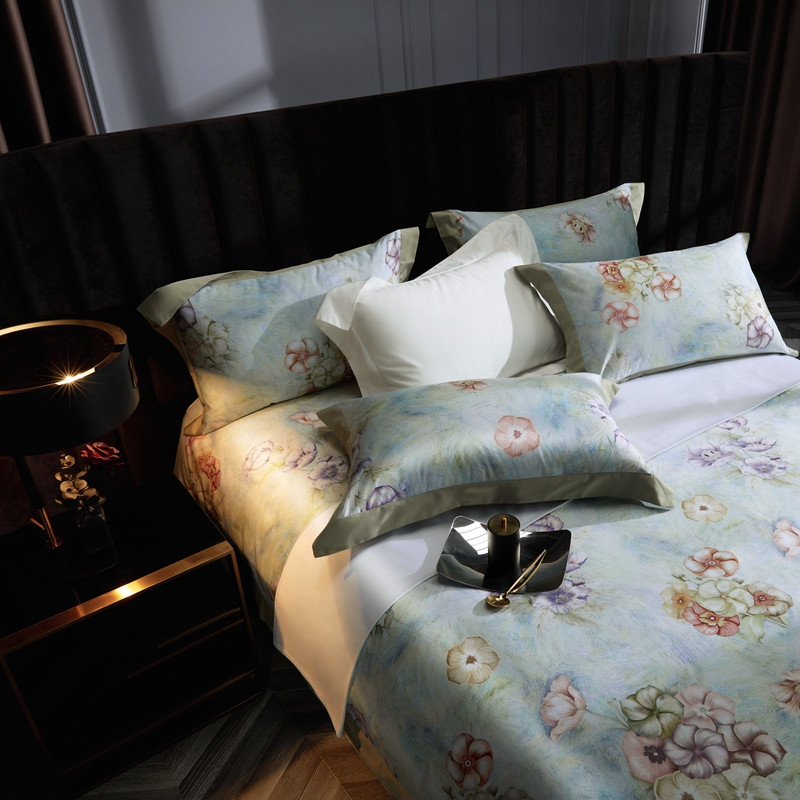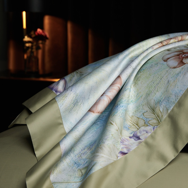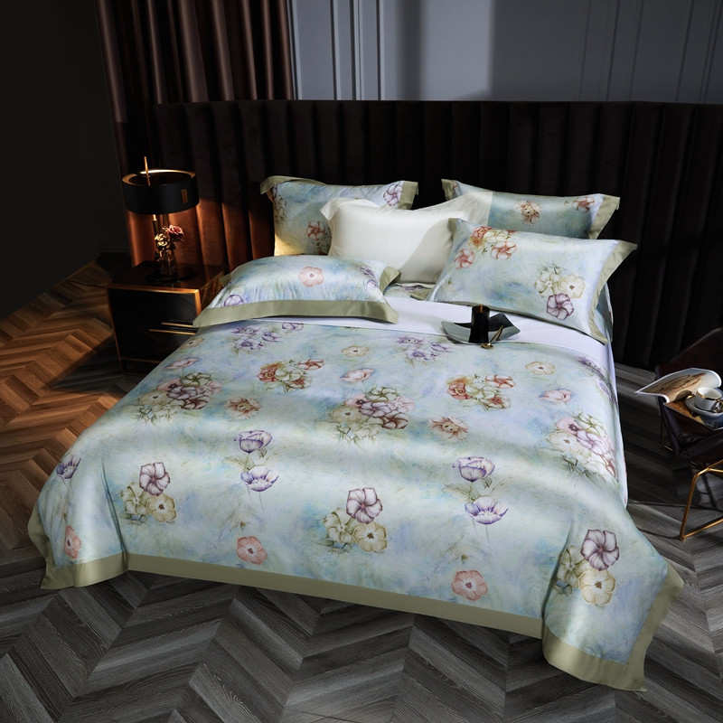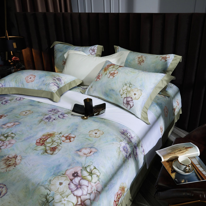 商品名称:缔缦 2023新款100s长绒棉拼角款数码印花四件套 旖旎-绿