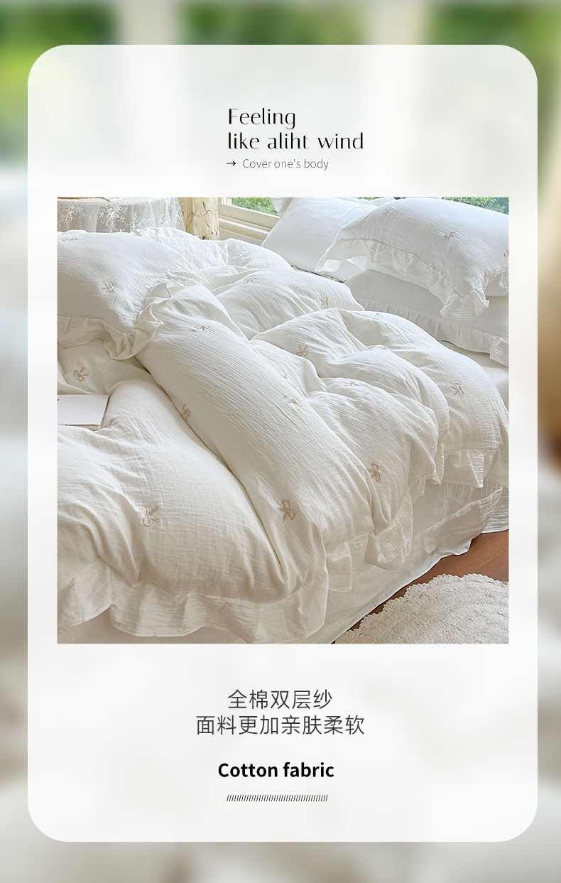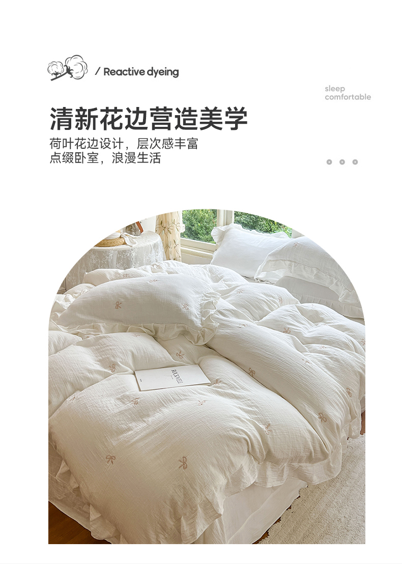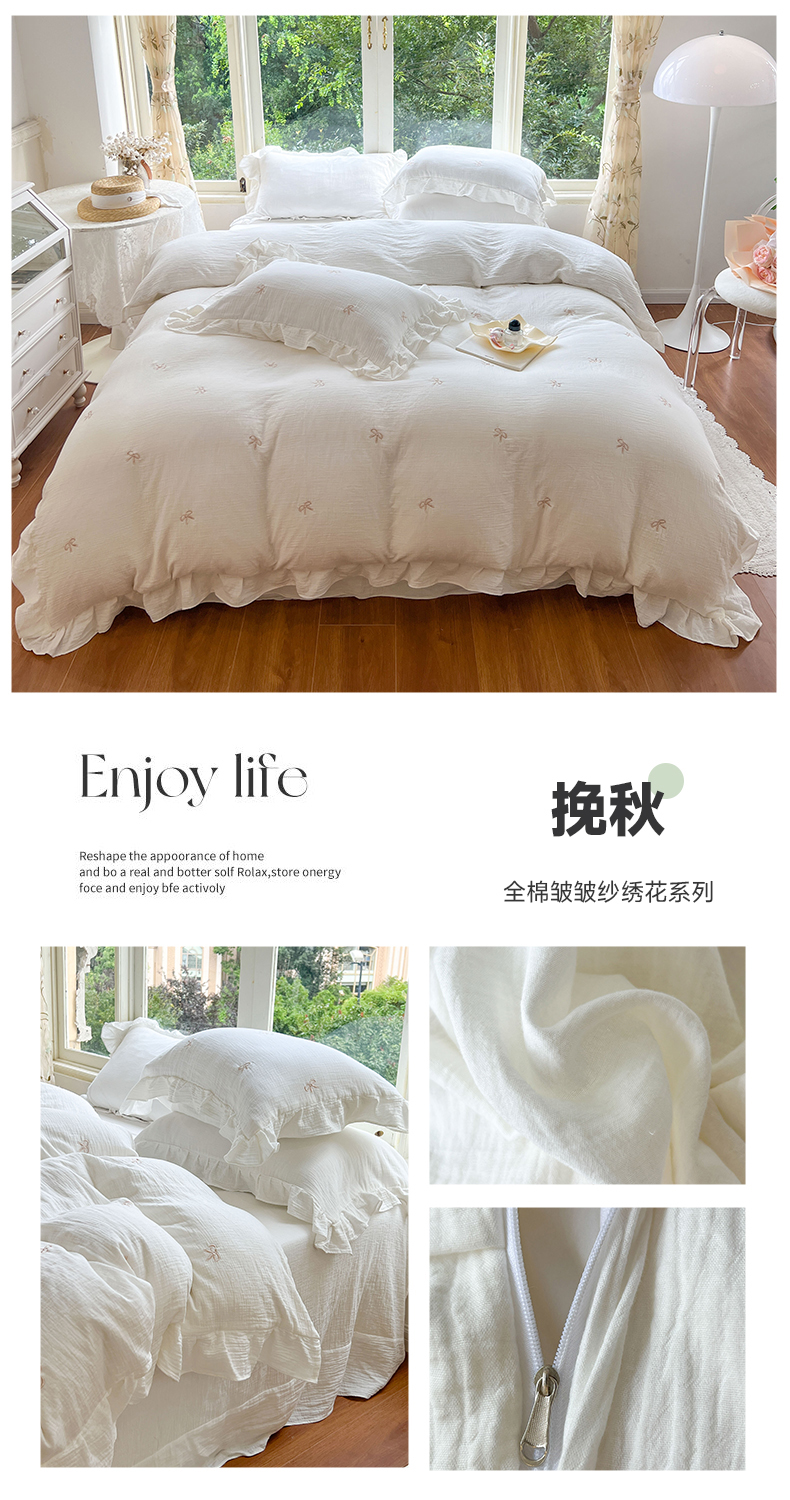 商品名称:木楌家居 2024秋冬全棉皱皱纱荷叶边刺绣工艺款四件套 挽秋