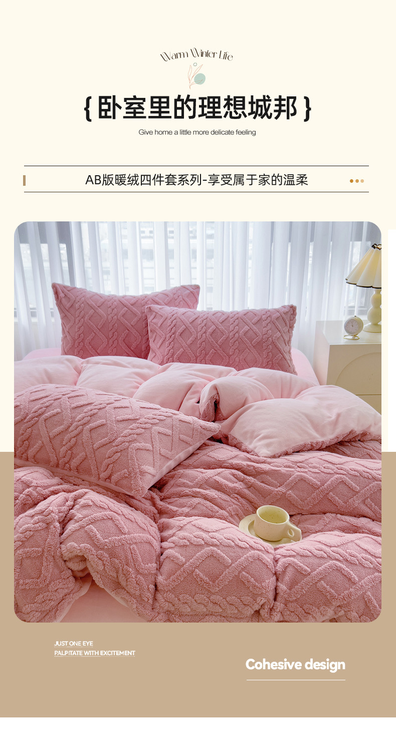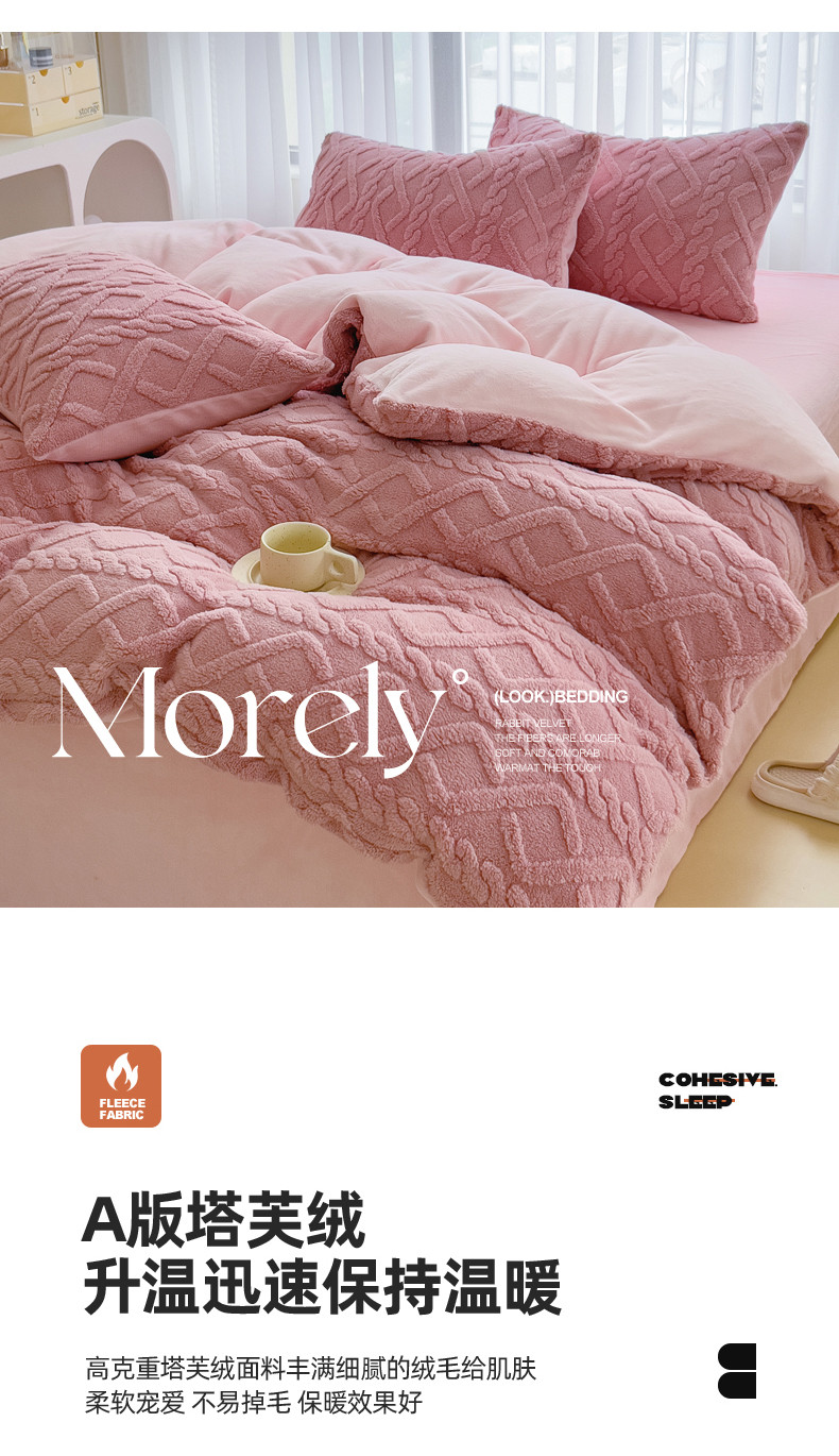 绒世界 2024秋冬新款加厚塔芙绒简约款牛奶绒四件套 甜粉
