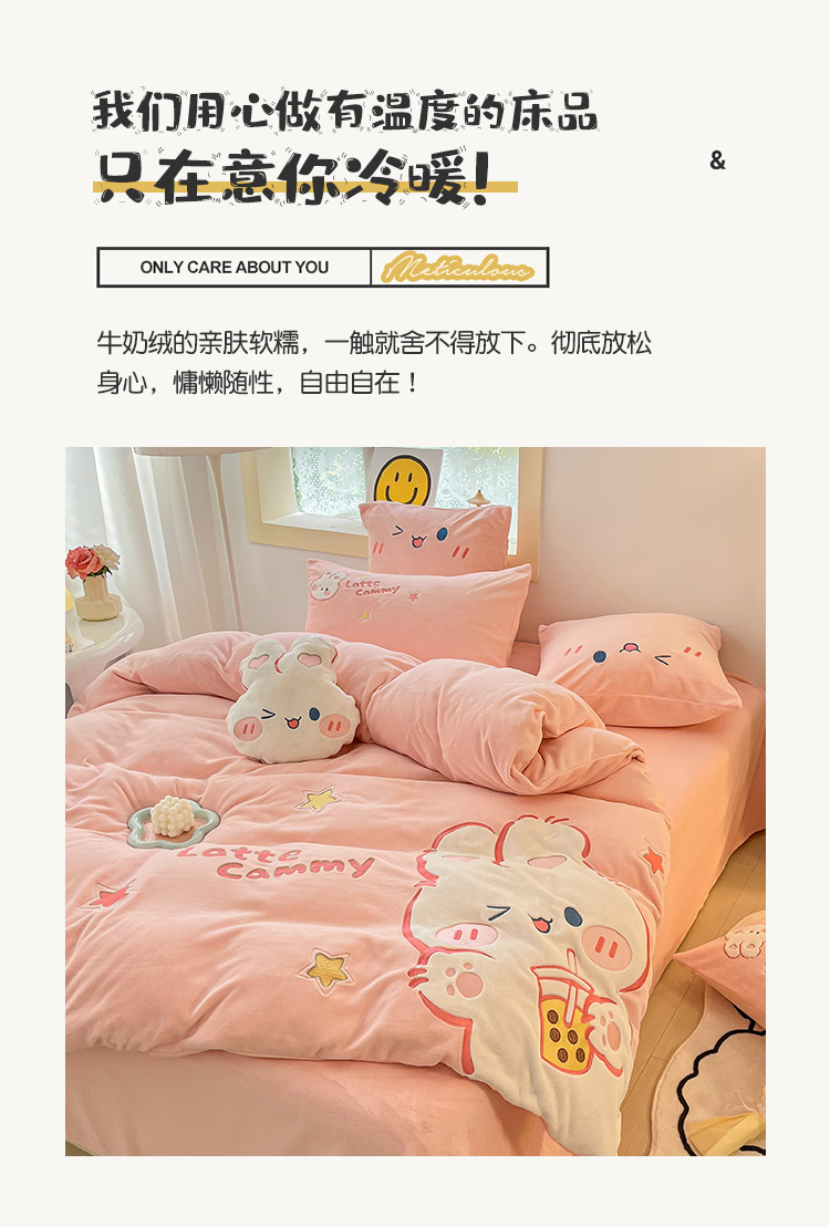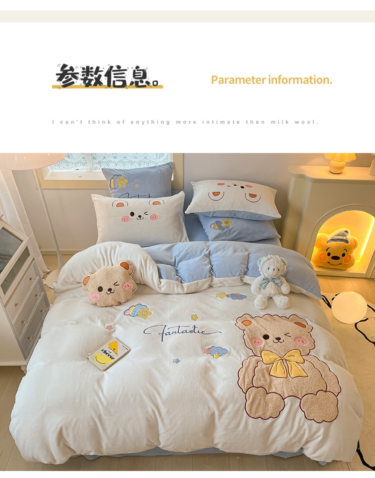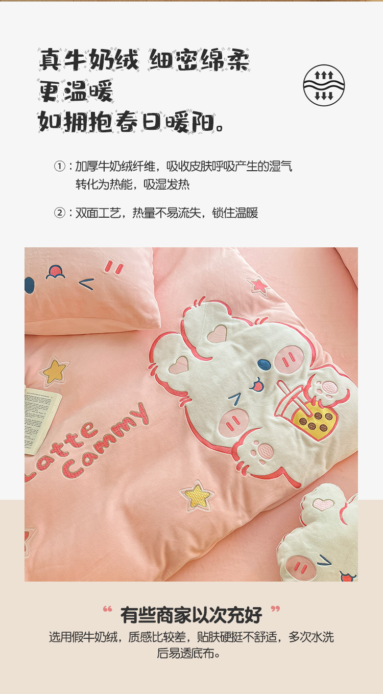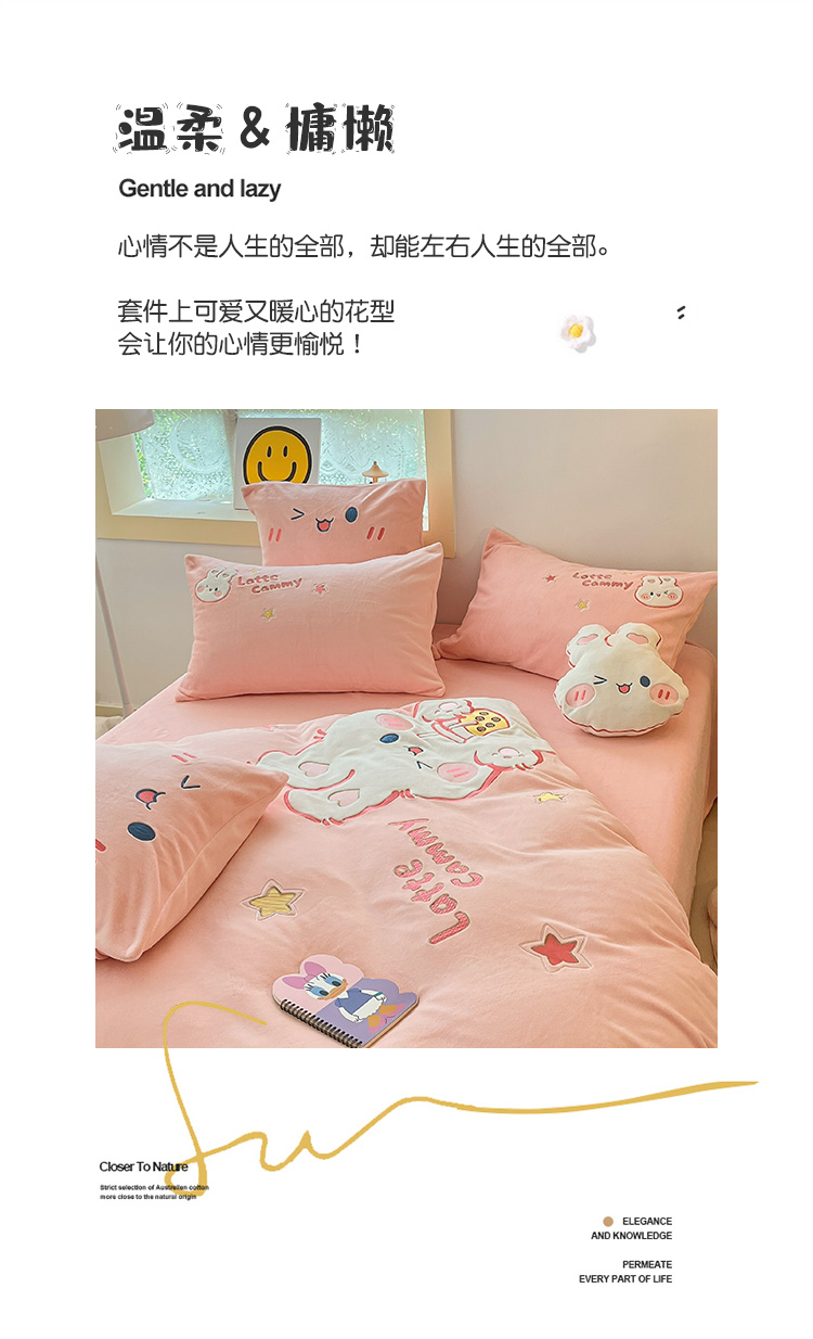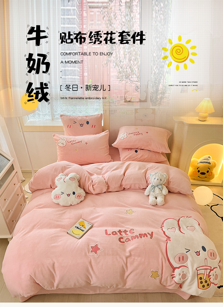 当前位置: 91家纺网 > 商品网购 > 床品套件 > 四件套 > 牛奶绒四件套 > 绒梦里 230g牛奶绒贴布绣花四件套加厚绒四件套儿童卡通三件套保暖套件