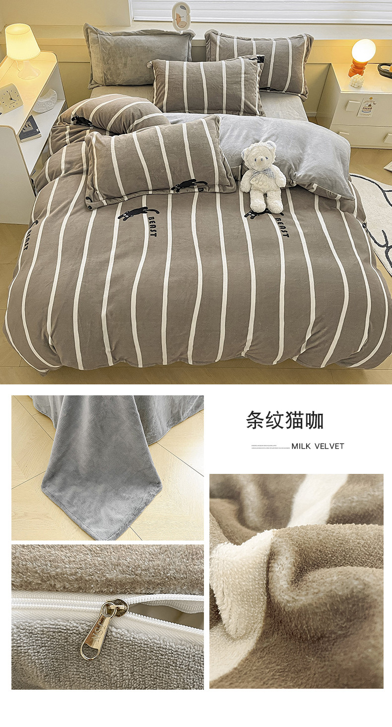 商品名称:金丝鸟家纺 2023新款220g全消光简约款牛奶绒四件套 条纹猫咖