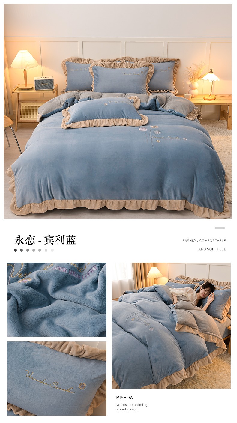 商品名称:湘雪家居 2025新款纯色双层花边牛奶绒四件套 永恋-宾利蓝(浅)