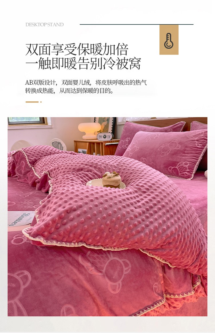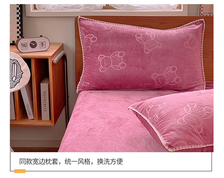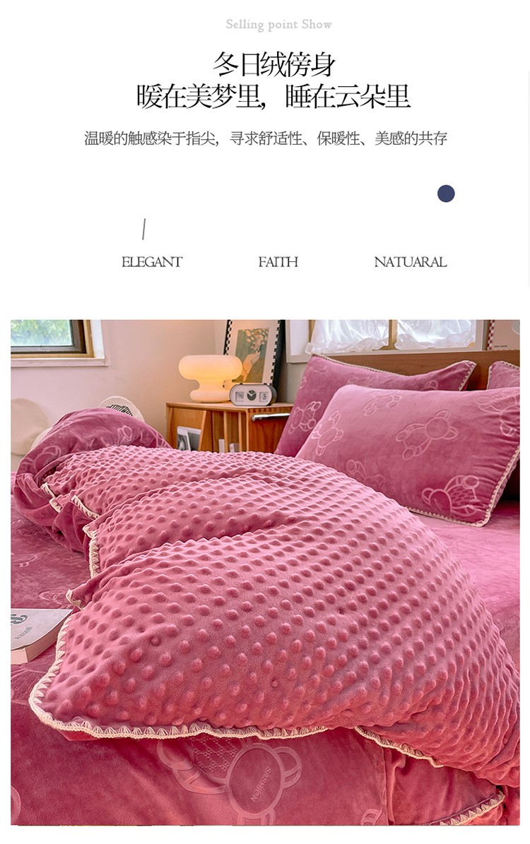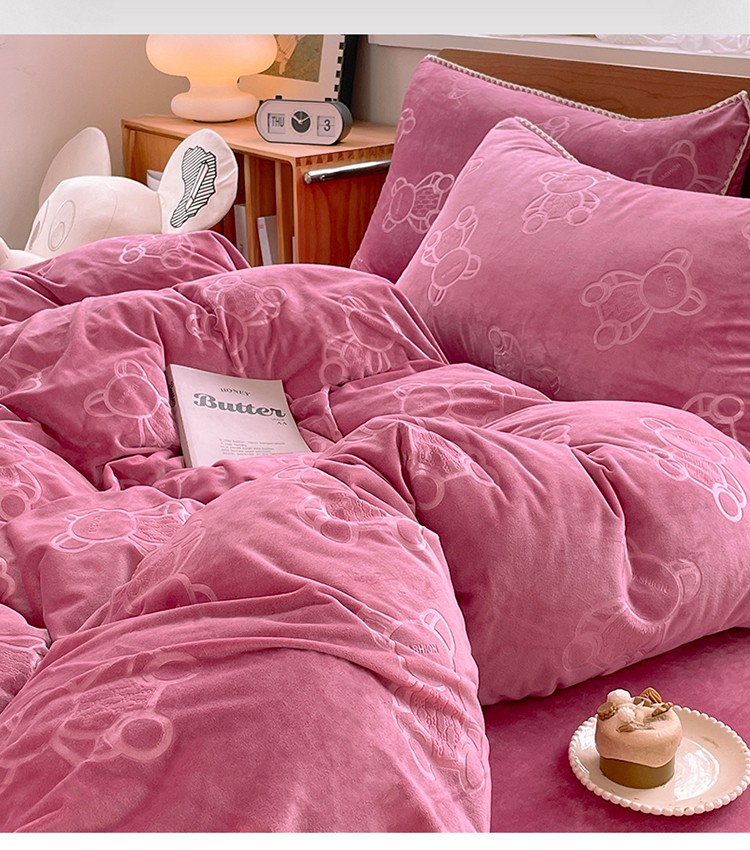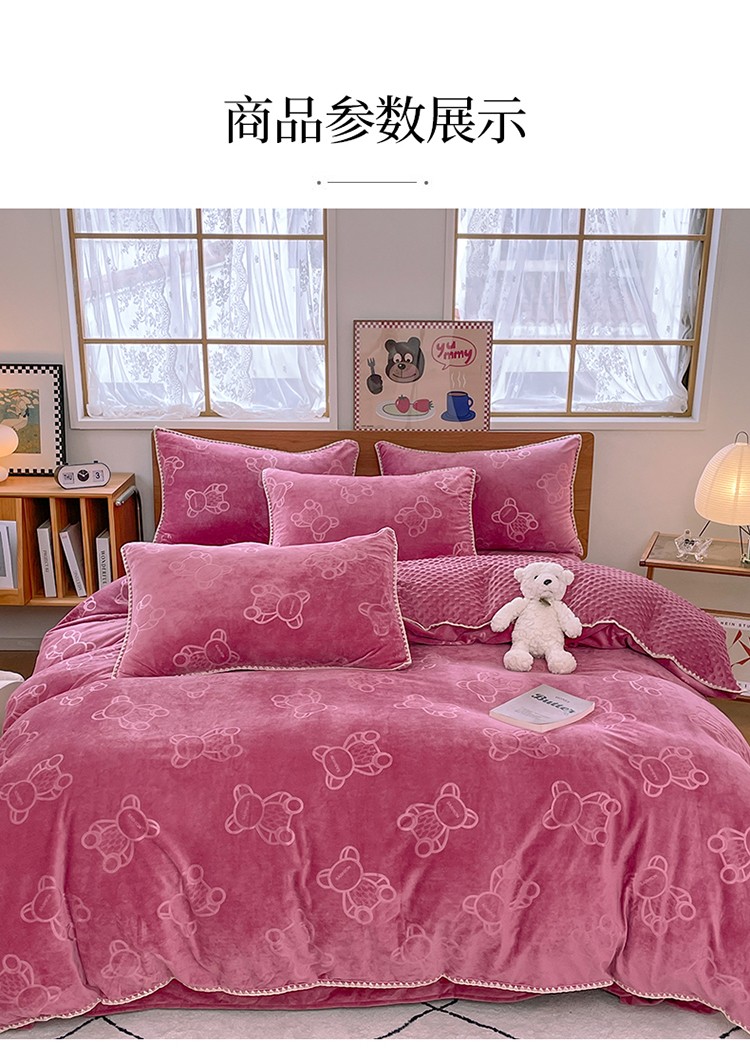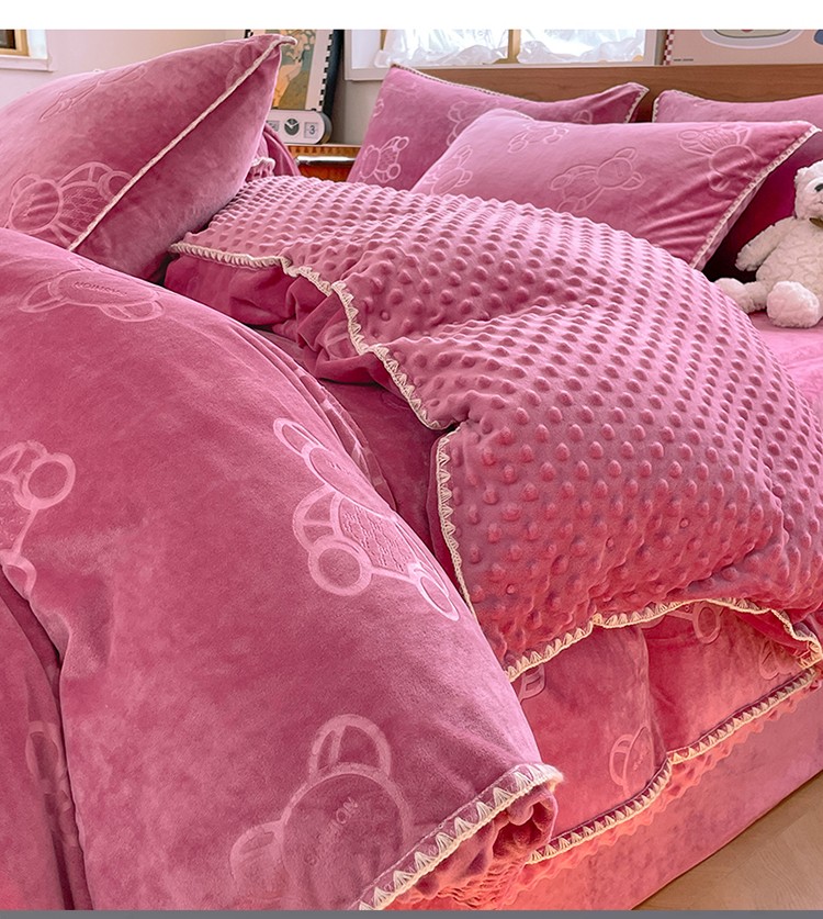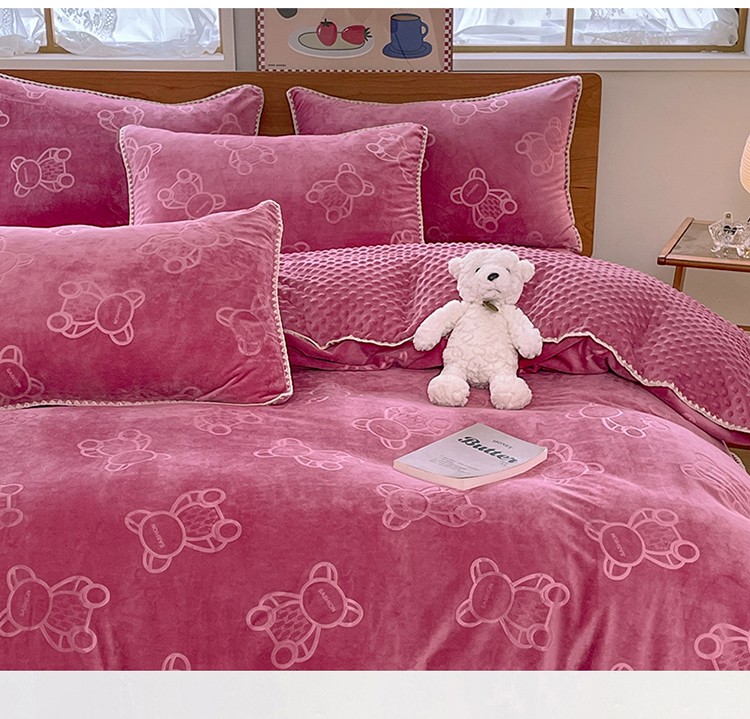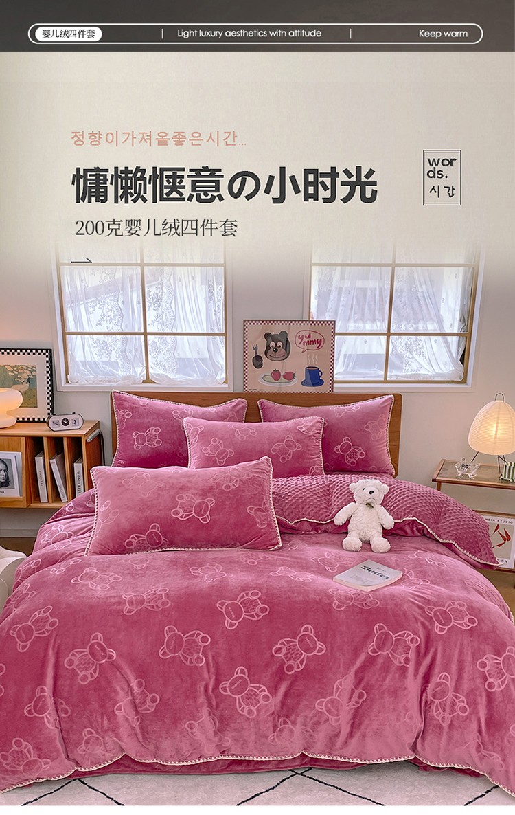 慕希2024新款贝壳边婴儿绒牛奶豆豆绒提花保暖绒四件套 胖胖熊-粉