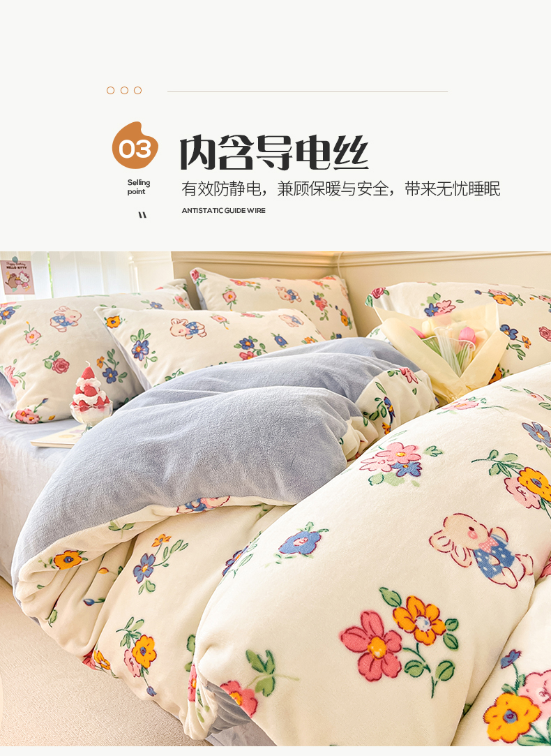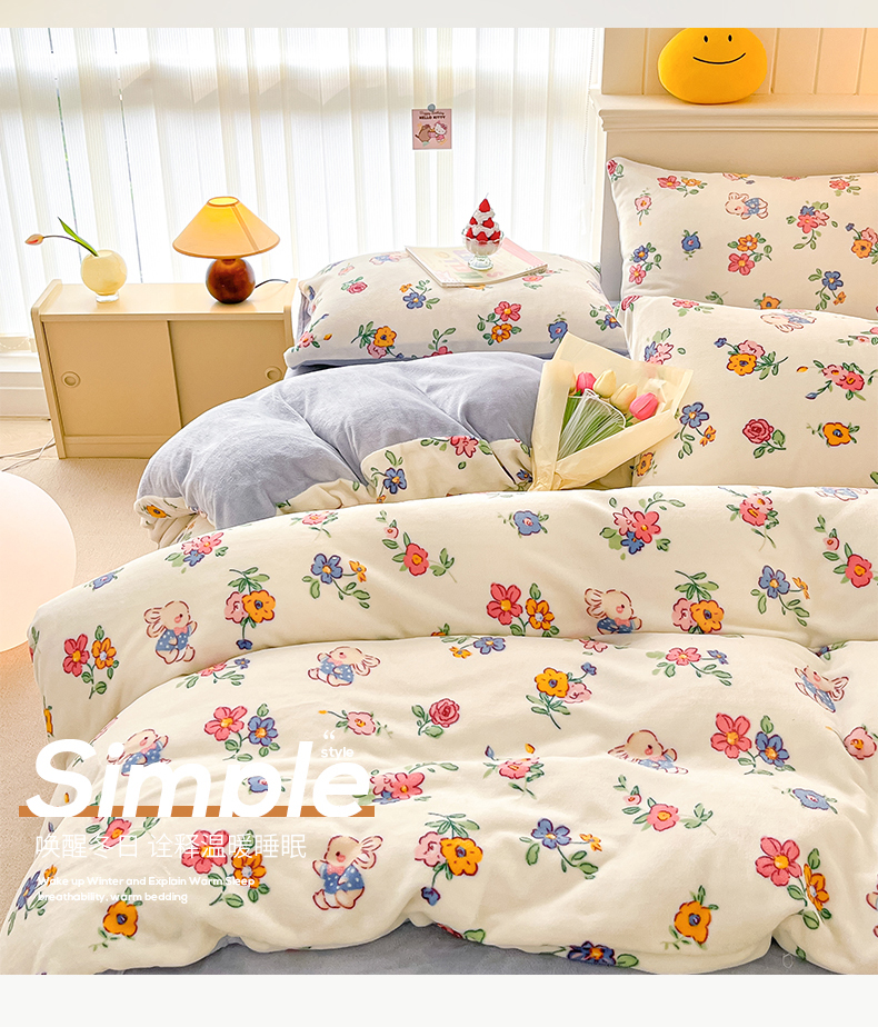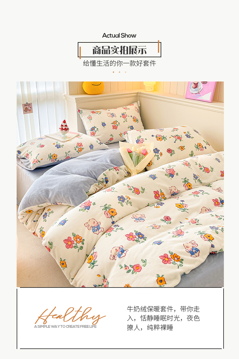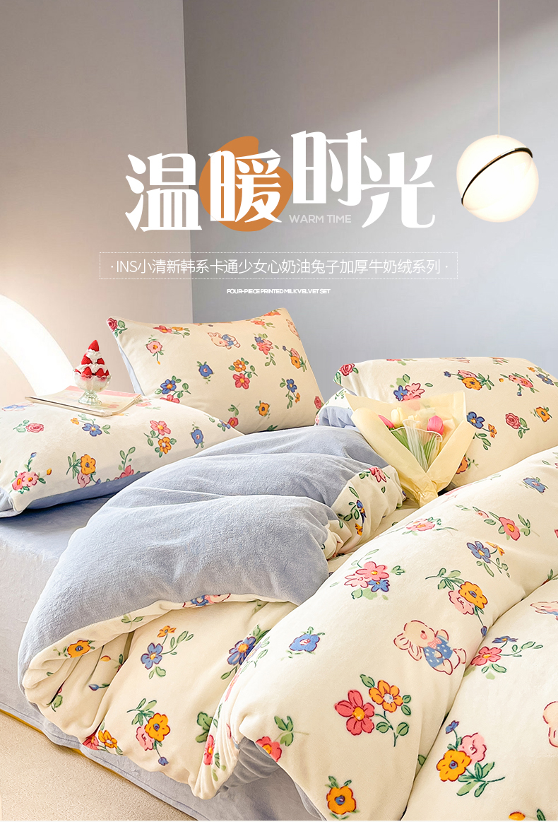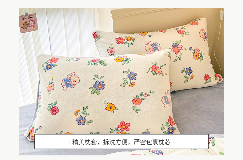 商品名称:桃子 2023新款ins小清新韩系卡通少女心奶油兔子加厚牛奶绒系列四件套-第一批 绒-花田兔