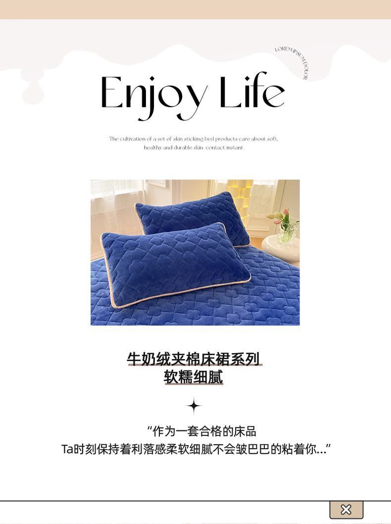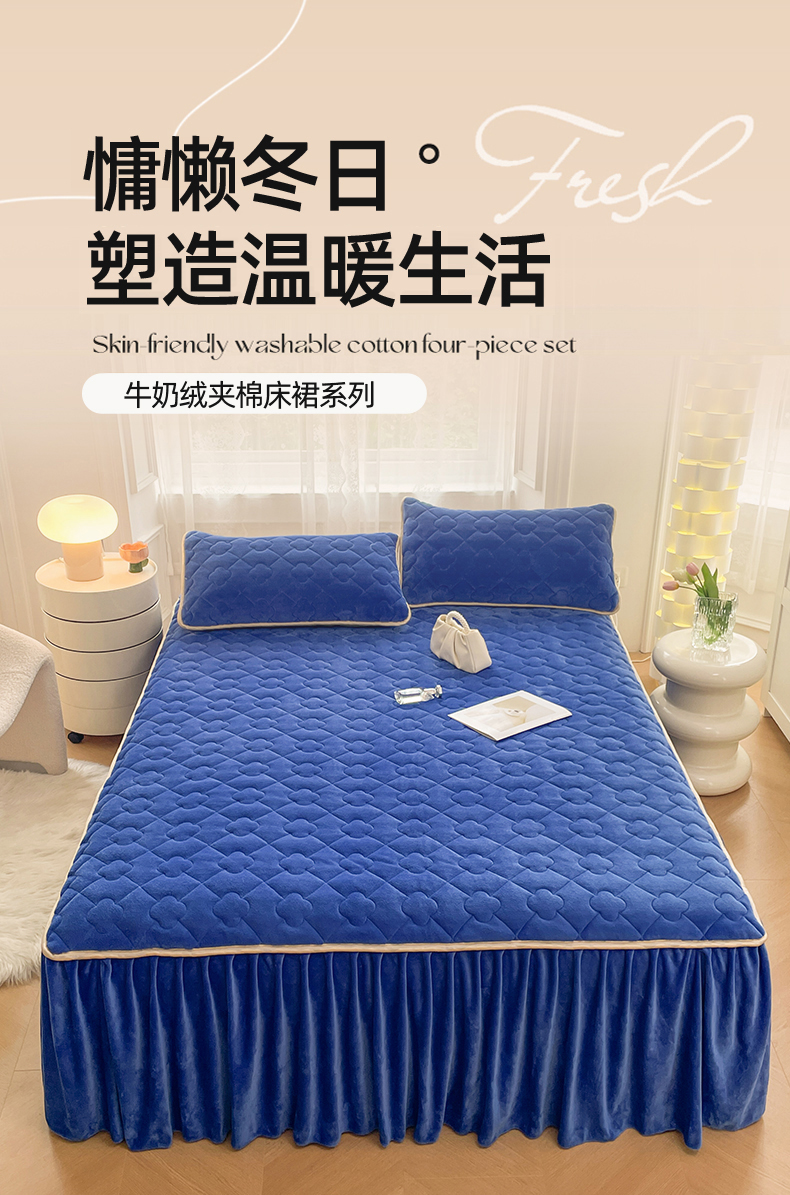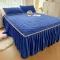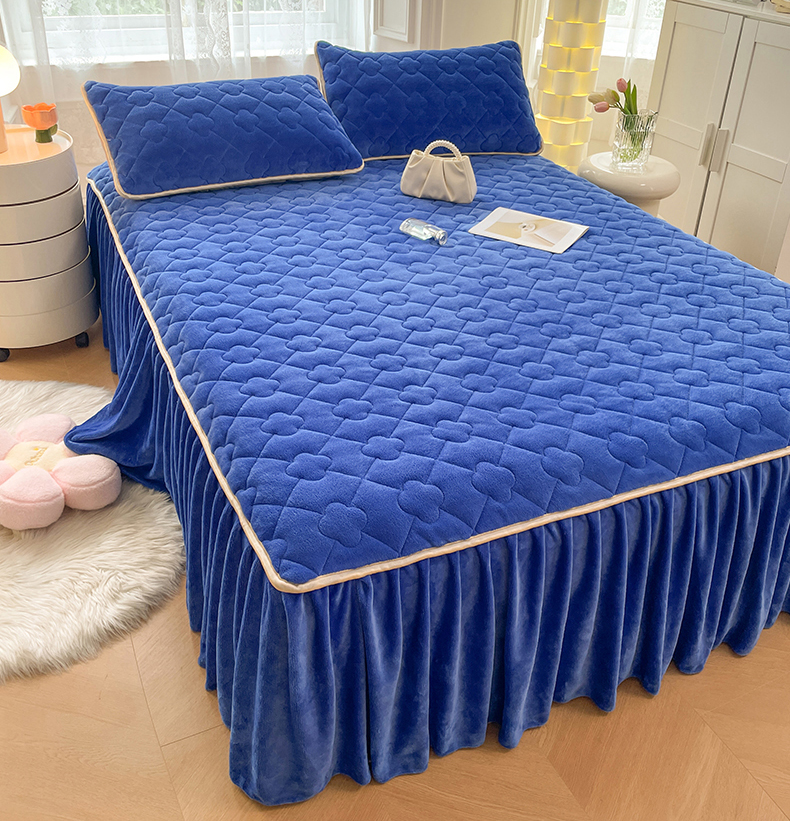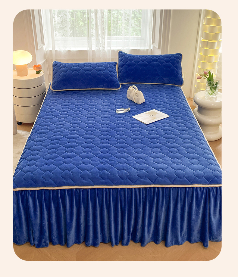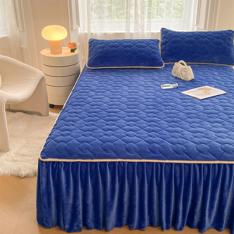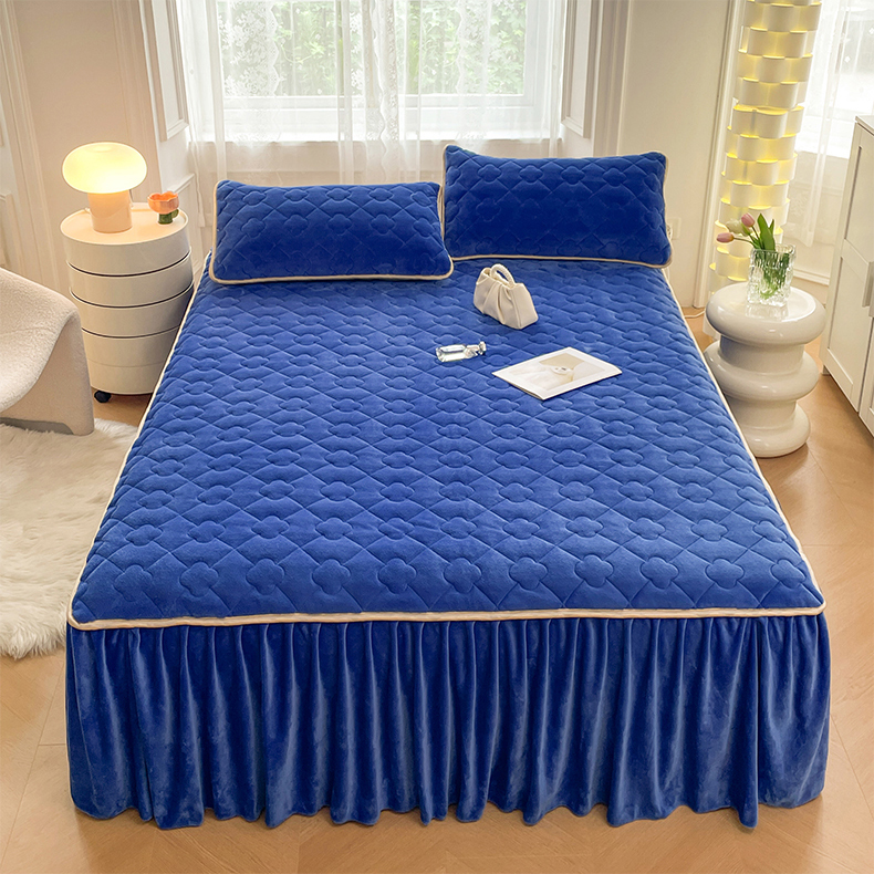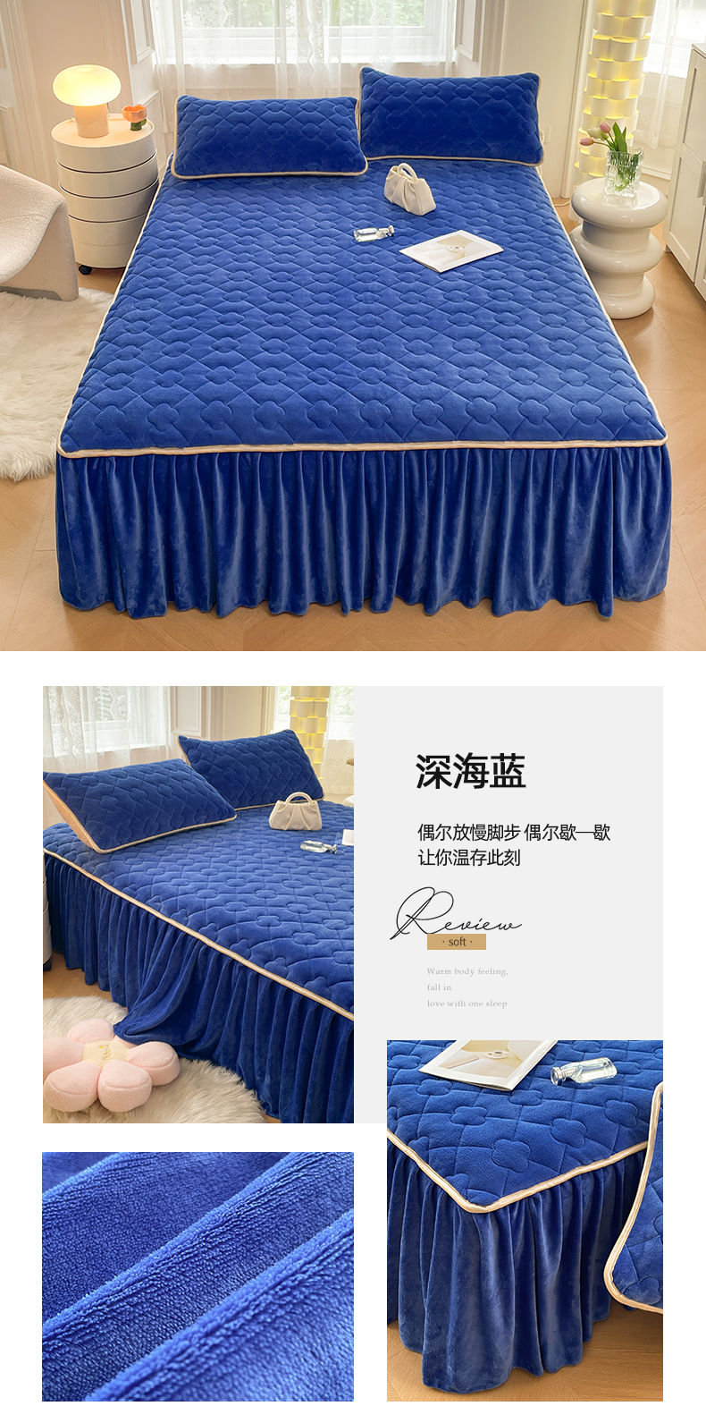 梦舒羽 牛奶绒夹棉床裙床罩床单床盖床护垫套三件套 深海蓝