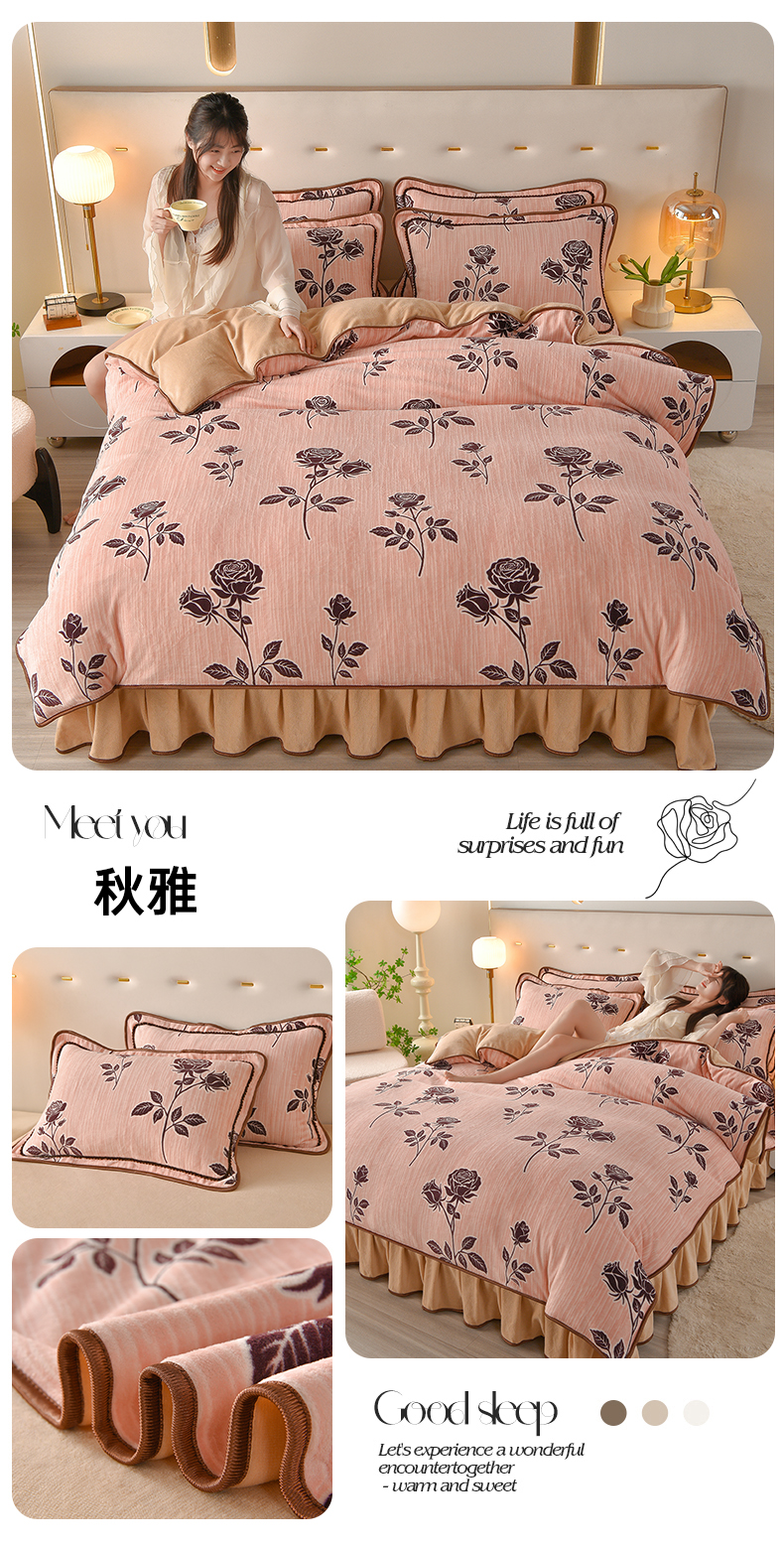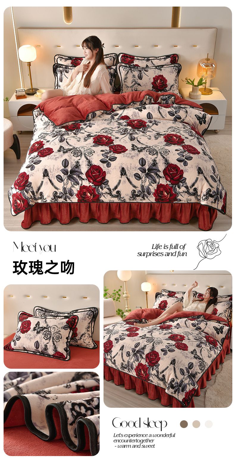 佳一 2025新款高克重8-9斤 印花牛奶绒四件套 玫瑰之吻,玫瑰之吻