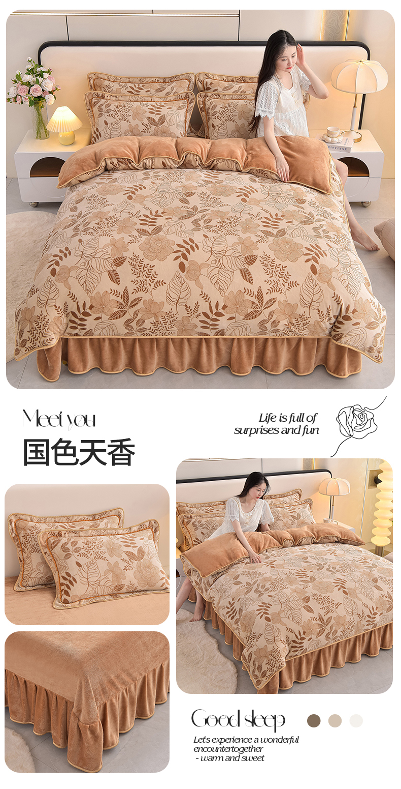 佳一 2025新款高克重8-9斤印花牛奶绒四件套 国色天香,国色天香