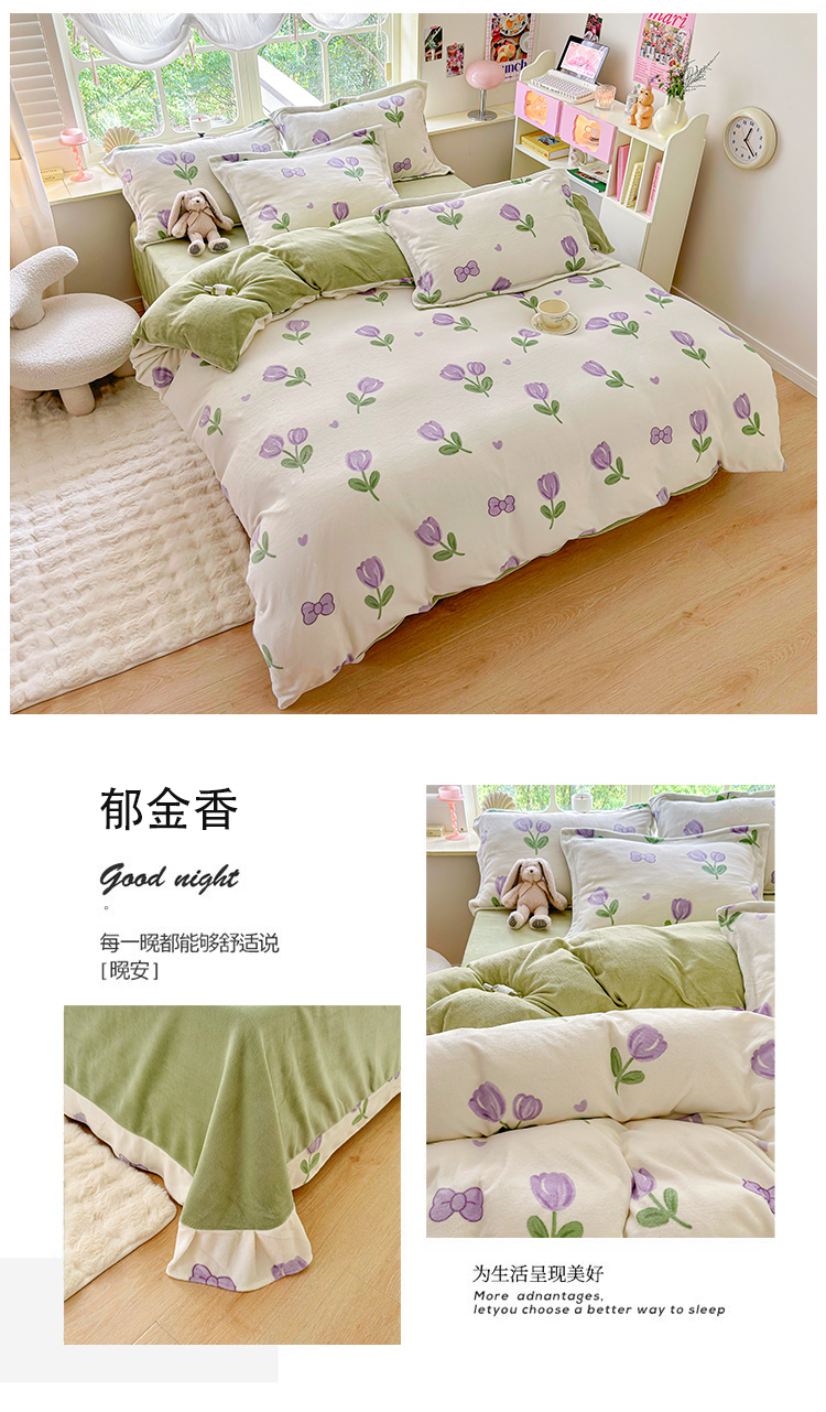 呗旺鹿 2023新款高克重加厚印花牛奶绒四件套直播 郁金香