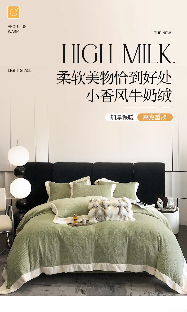 (总)万盛家纺 2025新款牛奶绒简约绣花四件套,艾草绿,豆沙色,高级灰,奶油黄,香草白,杏仁色,悠悠粉