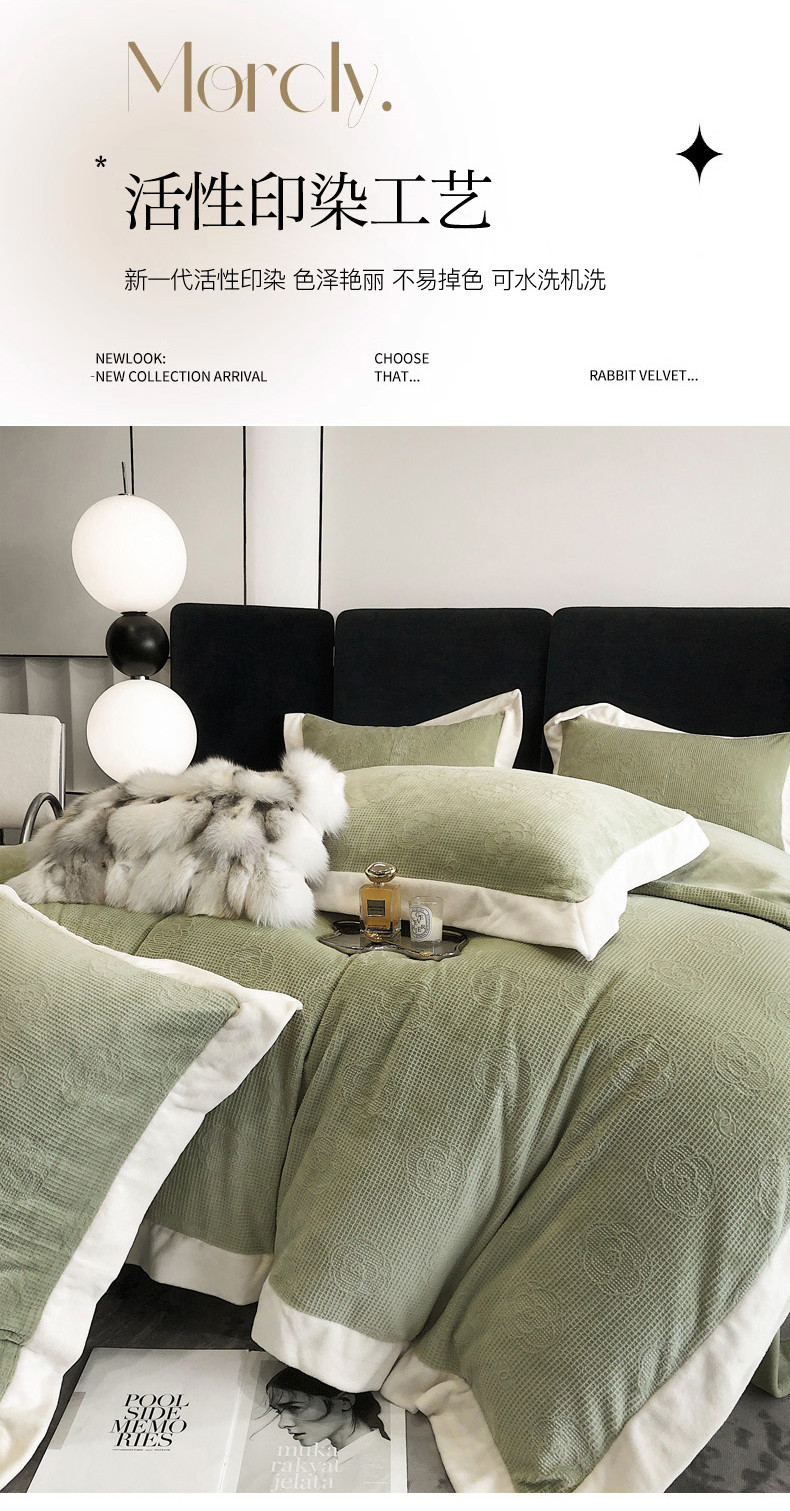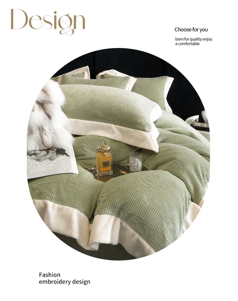 商品名称:万盛家纺 2025新款小香风山茶花牛奶绒四件套 山茶花—奶油绿