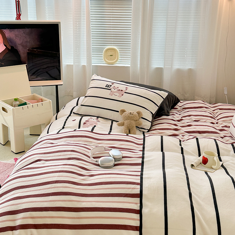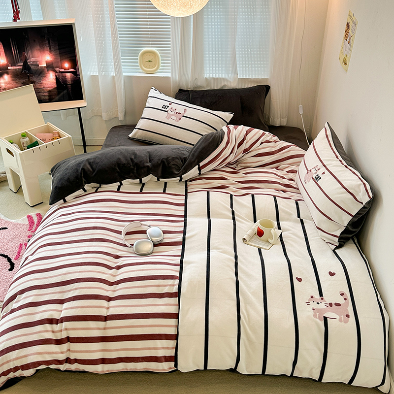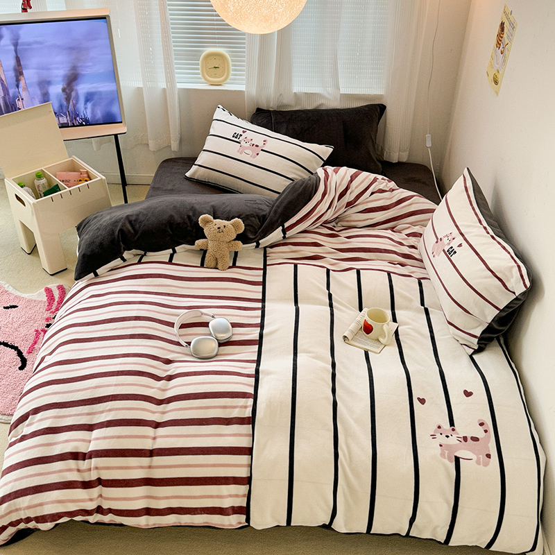 商品名称:昔可家纺 2023新款大版数码印花保暖牛奶绒四件套 拼接条纹爱心猫