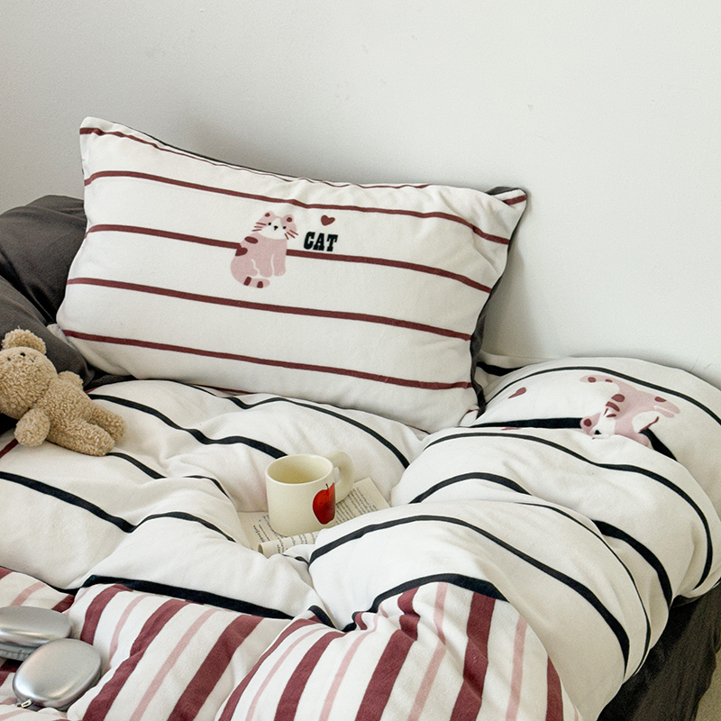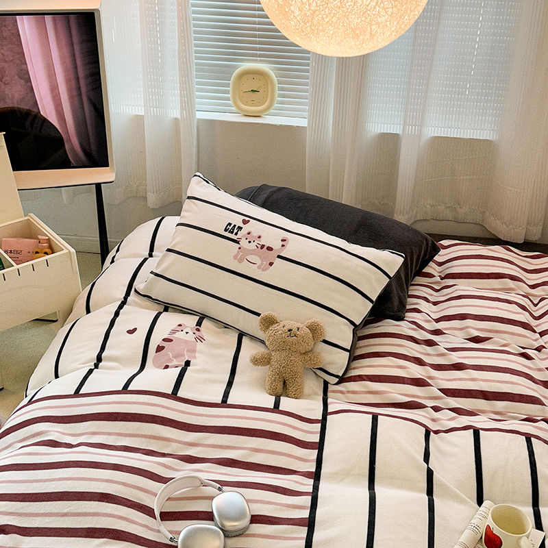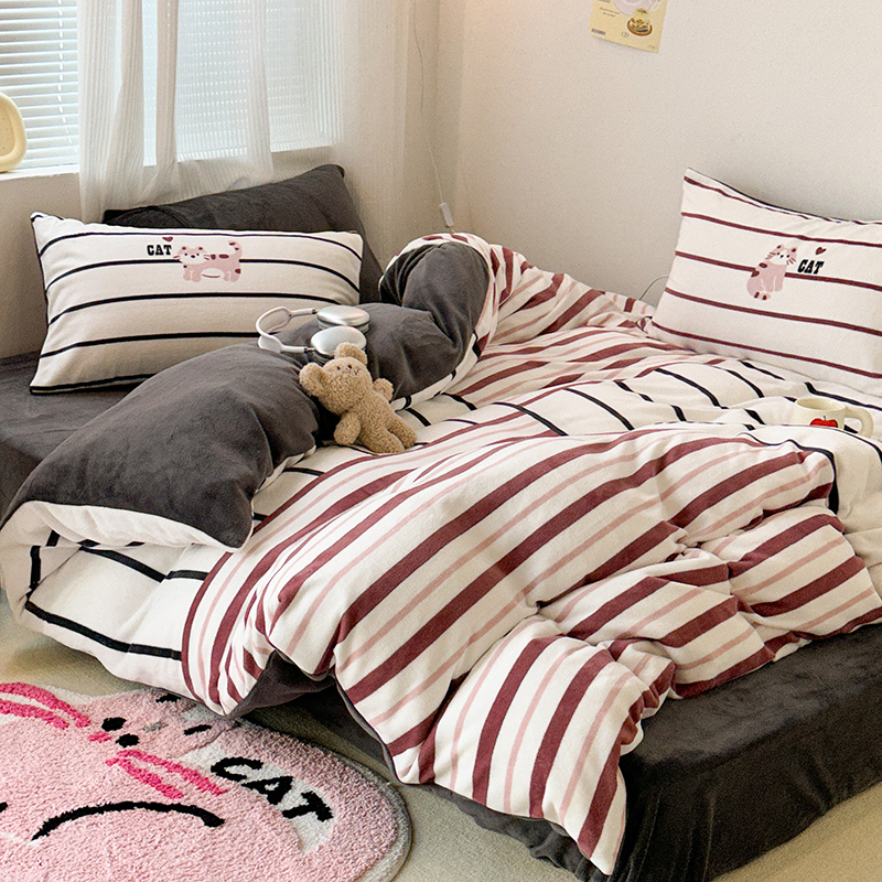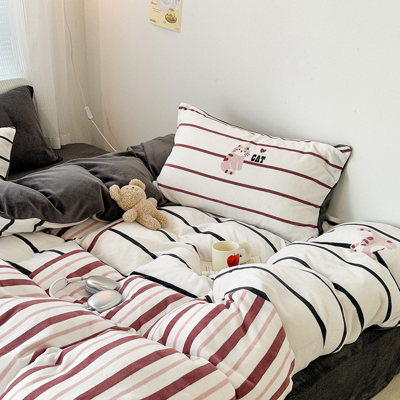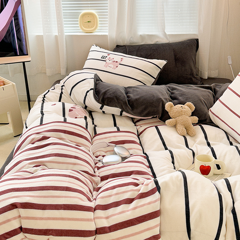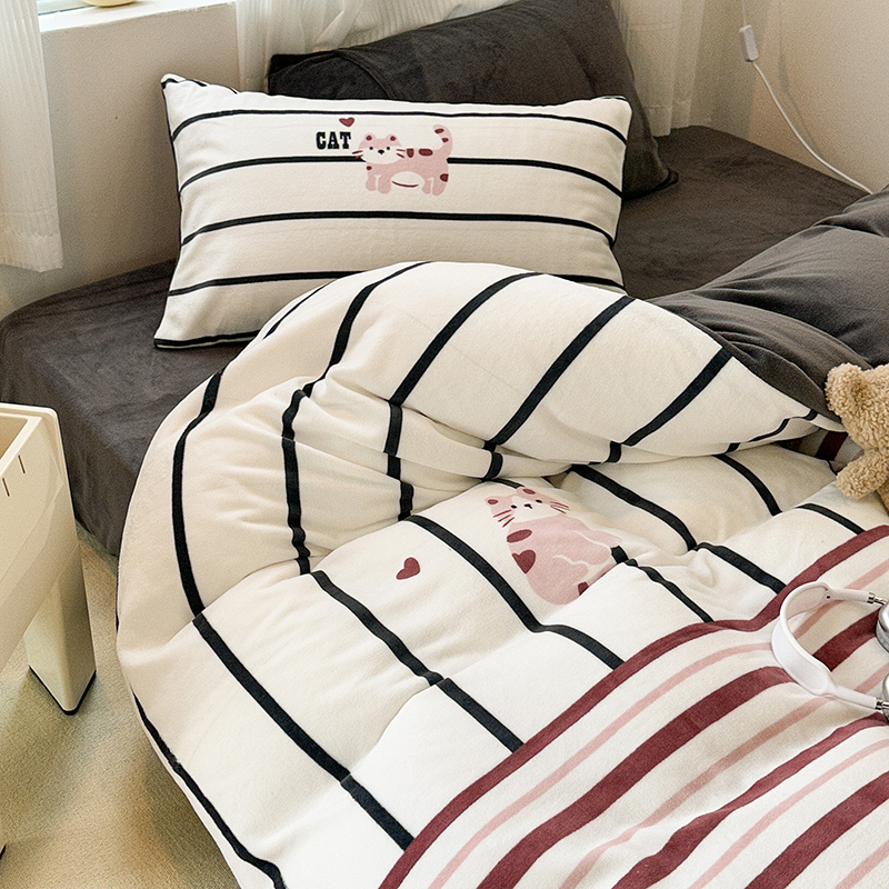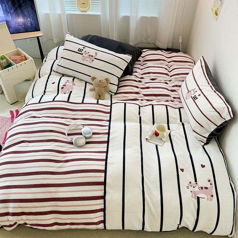 昔可家纺 2023新款大版数码印花保暖牛奶绒四件套 拼接条纹爱心猫