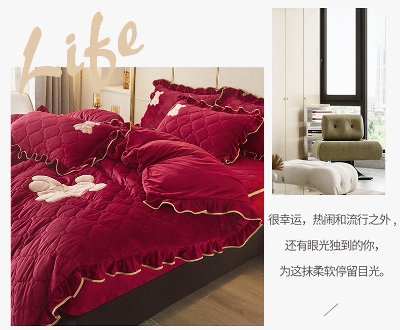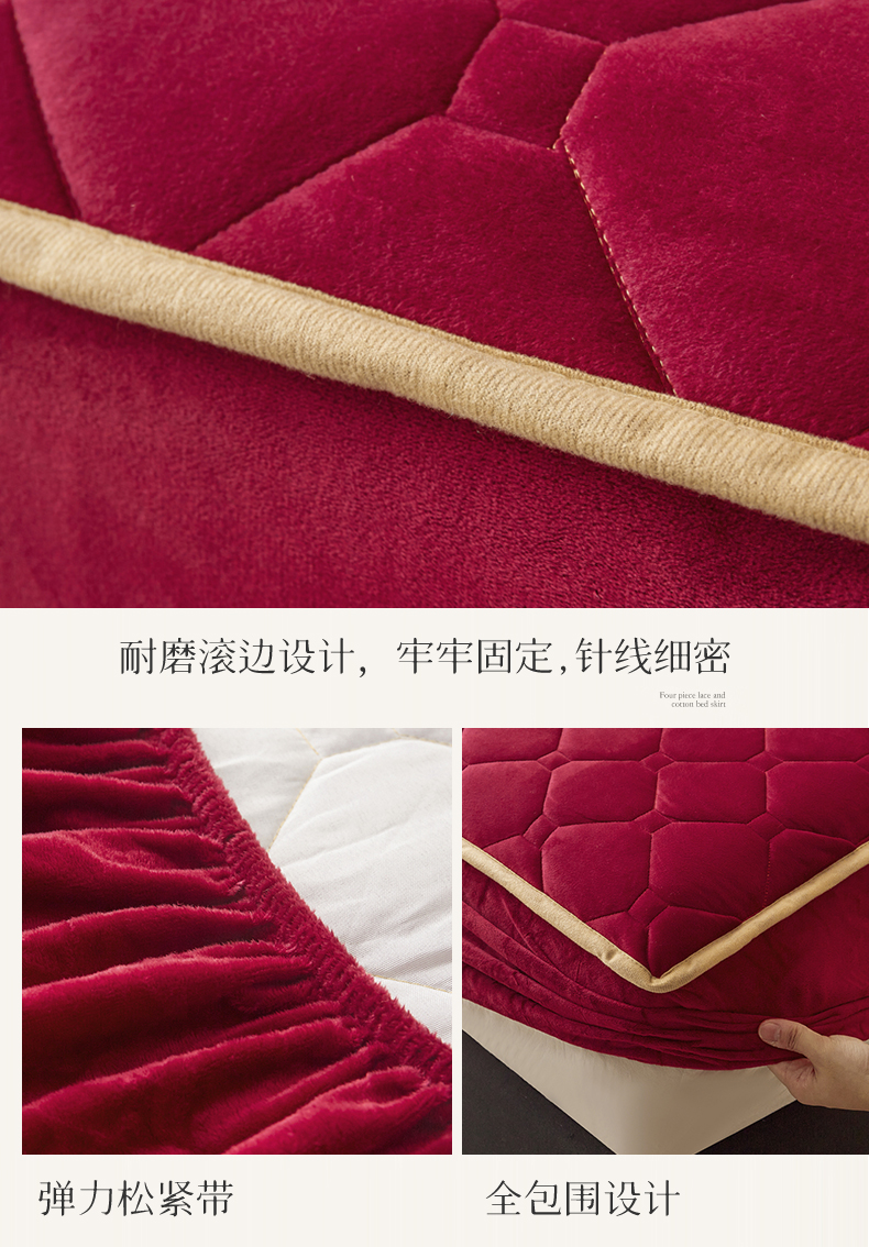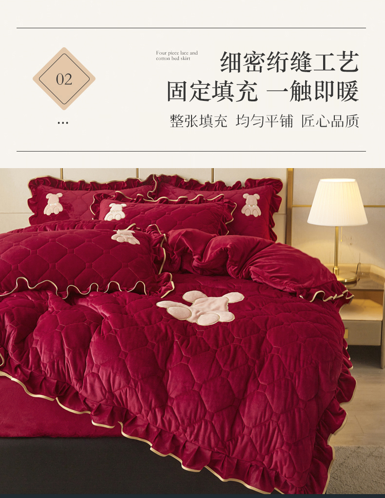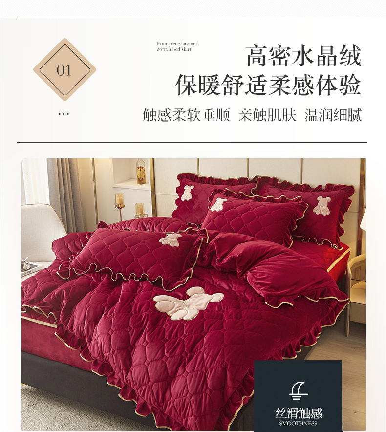 (总)屹成家纺2025新款水晶绒夹棉绗缝床裙四件套(塞纳河畔)四件套起售价不低于230元,大红,豆沙,翡翠绿,粉玉,橄榄绿,蔚蓝,银灰