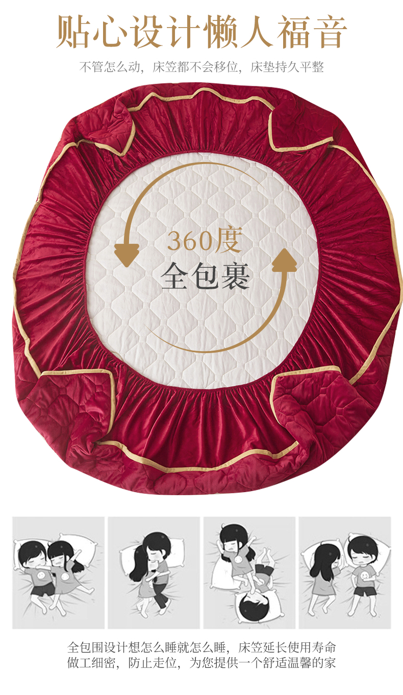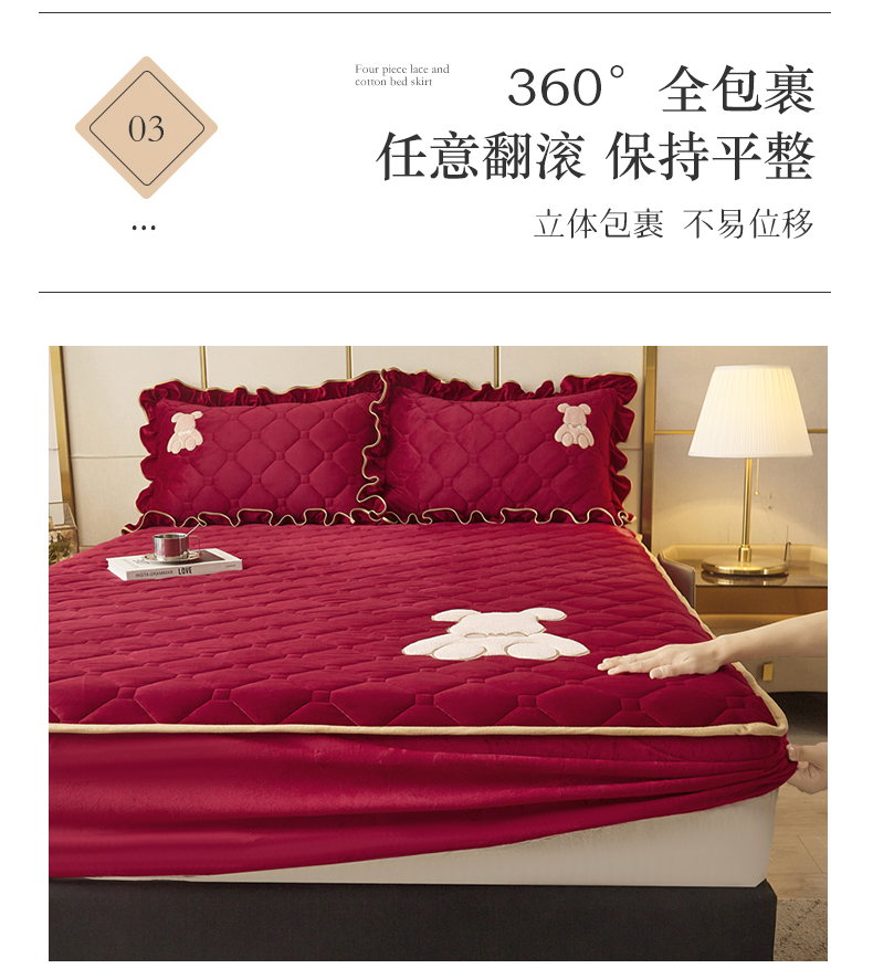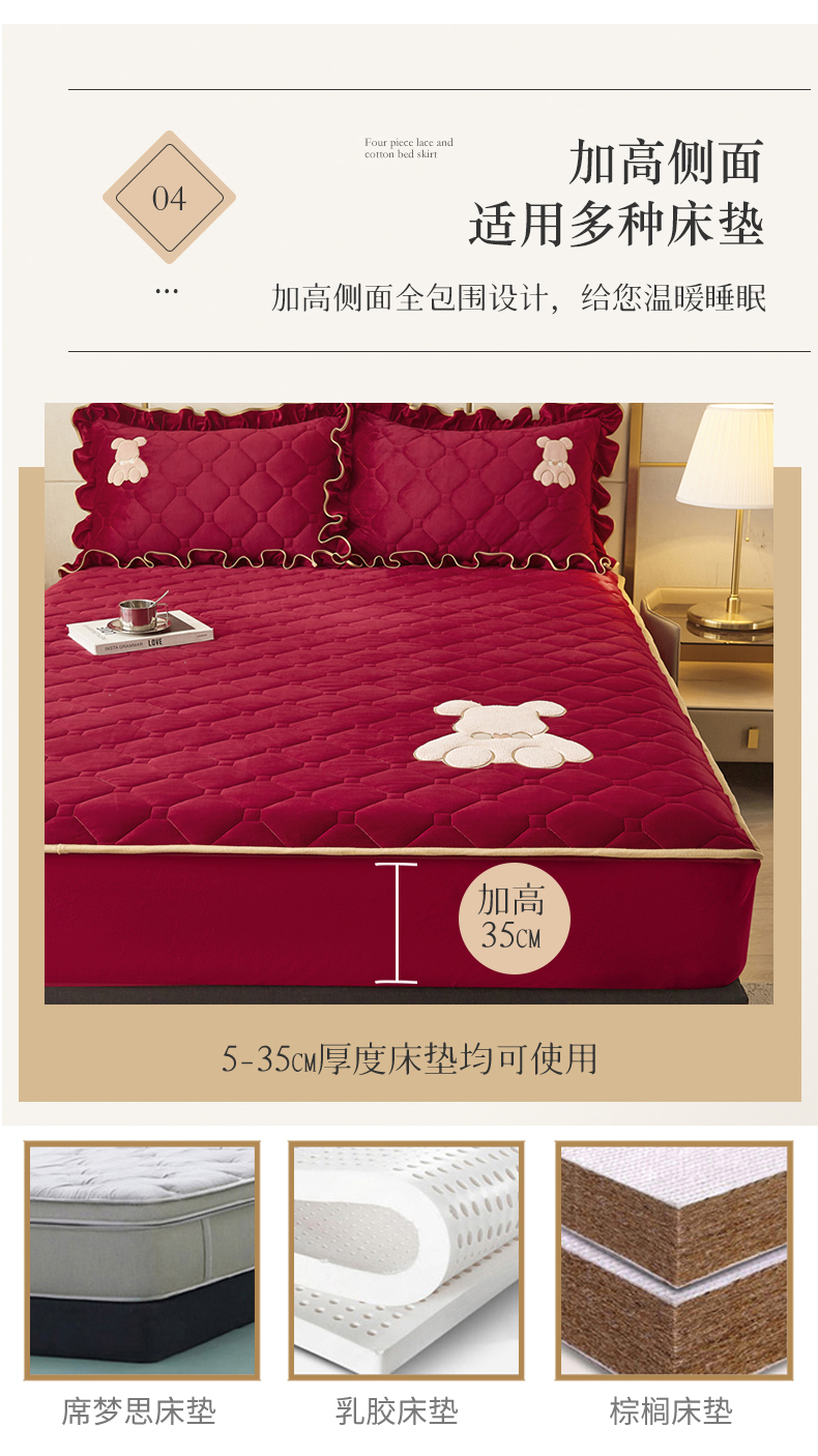 (总)屹成家纺2025新款水晶绒夹棉绗缝蕾丝床裙三件套(塞纳河畔)床裙单件起售价不低于105元,大红,豆沙,翡翠绿,粉玉,橄榄绿,蔚蓝,银灰