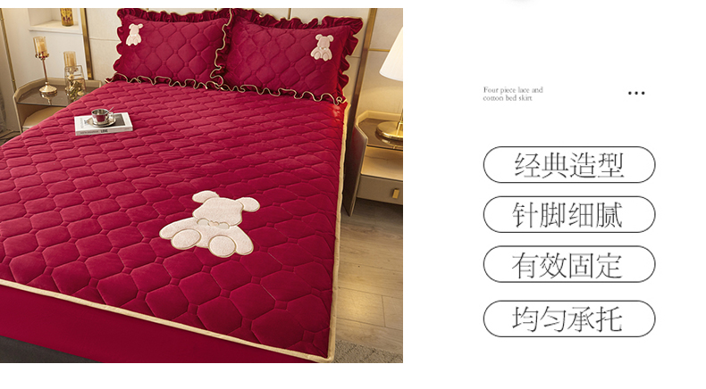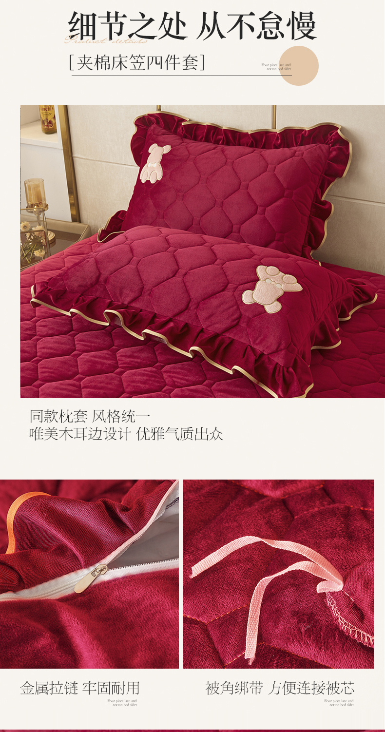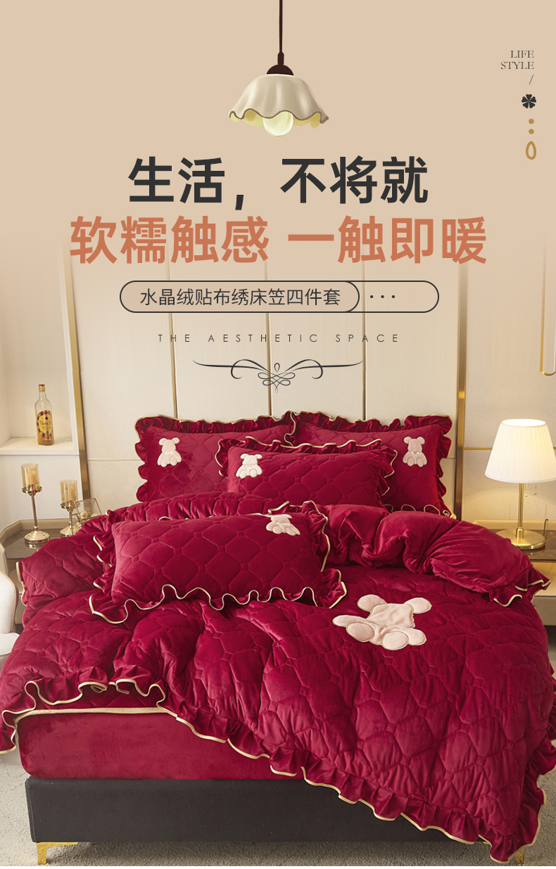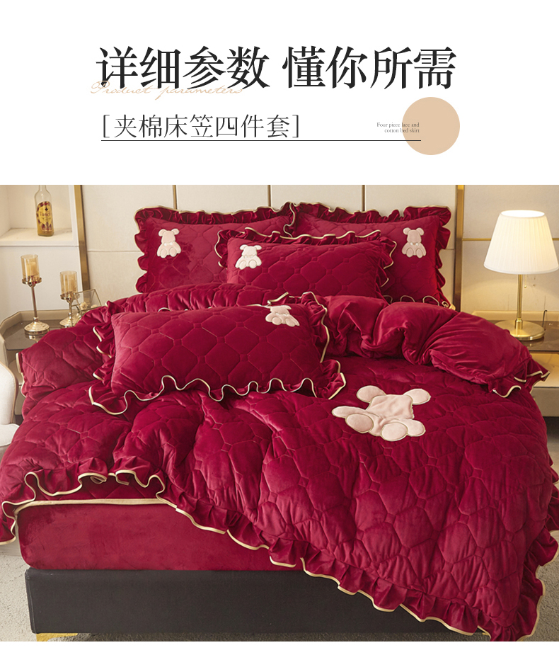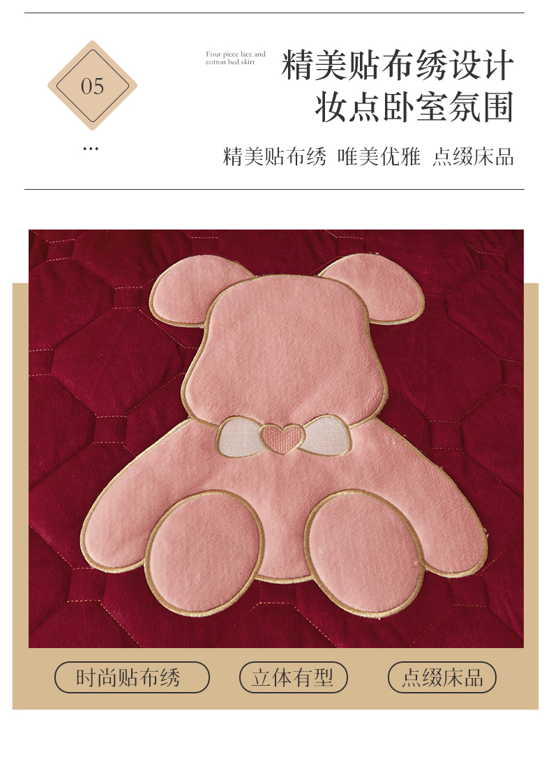 商品名称:屹成 2024新款水晶绒夹棉床笠款四件套贴布绣款-小熊款 酒红