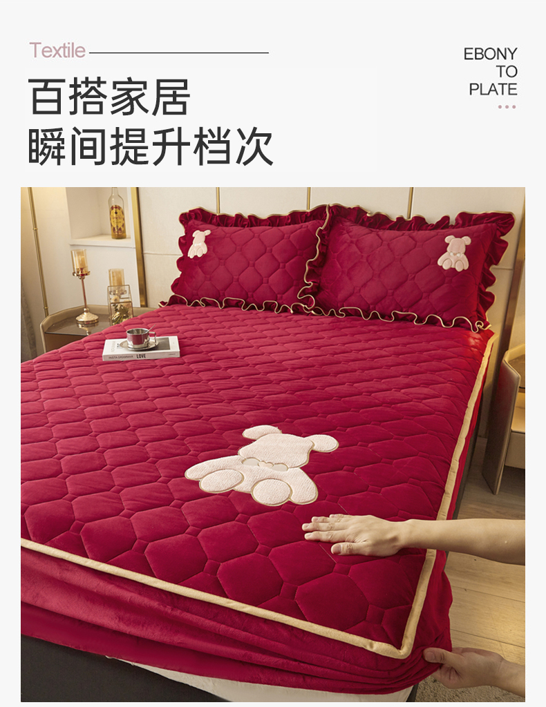屹成 2024新款水晶绒夹棉床笠款四件套贴布绣款-小熊款 酒红