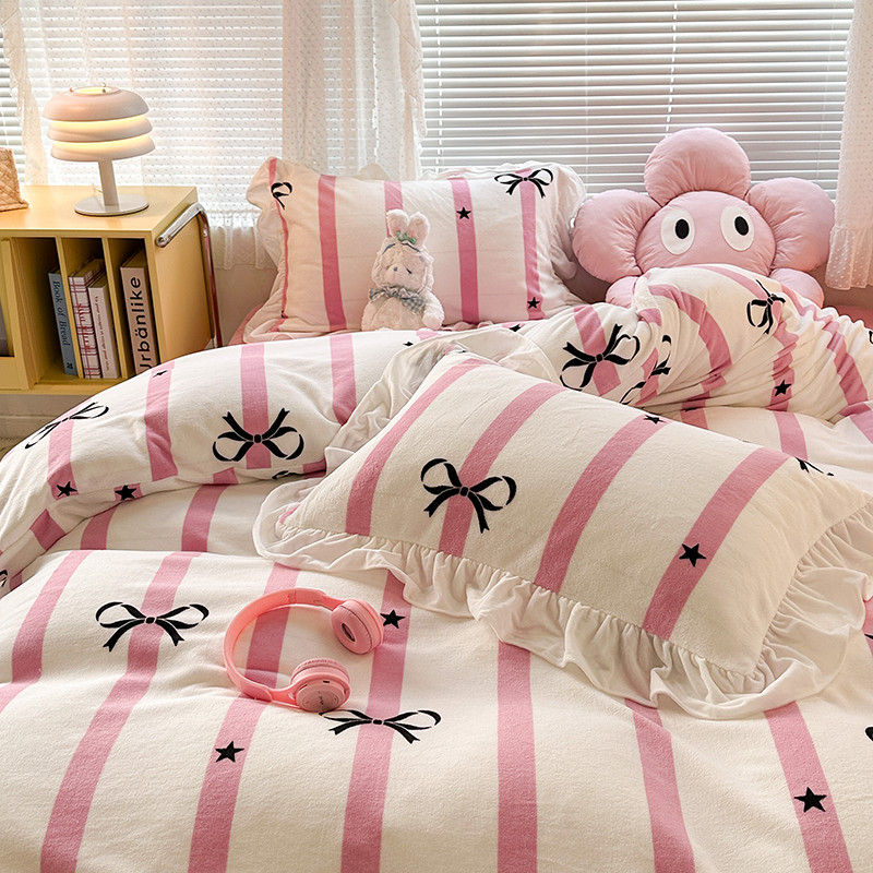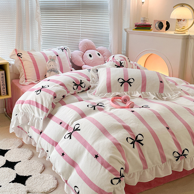 昔可 2023新款韩系ins花边款牛奶绒四件套 粉条星星蝴蝶结
