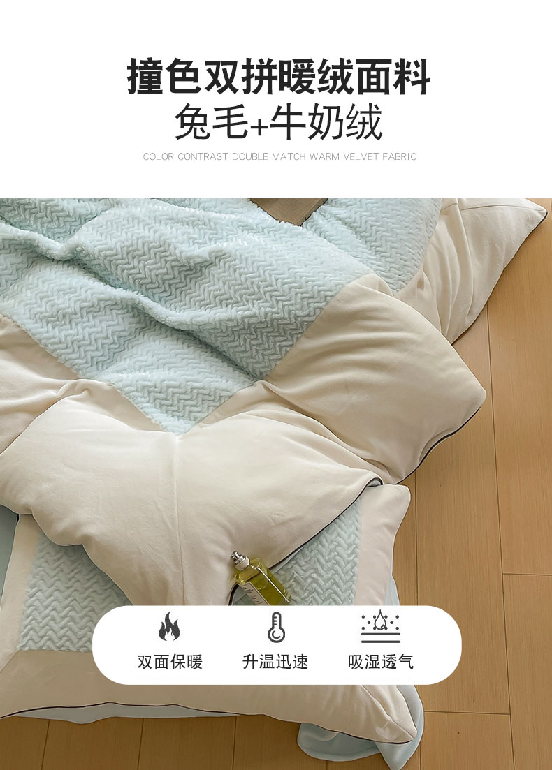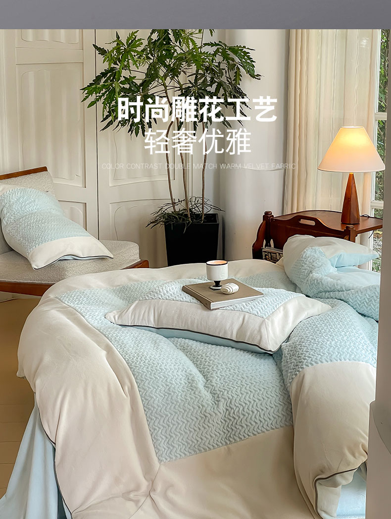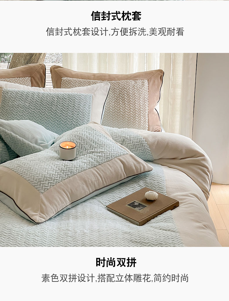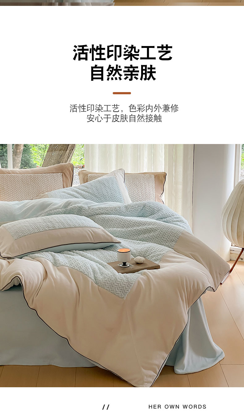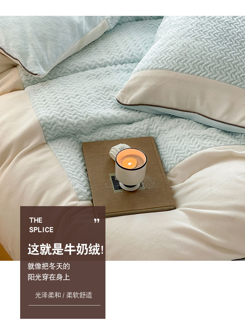 商品名称:FOR TWO家纺 2023新款兔毛拼接嵌线系列四件套 焦糖-浅蓝