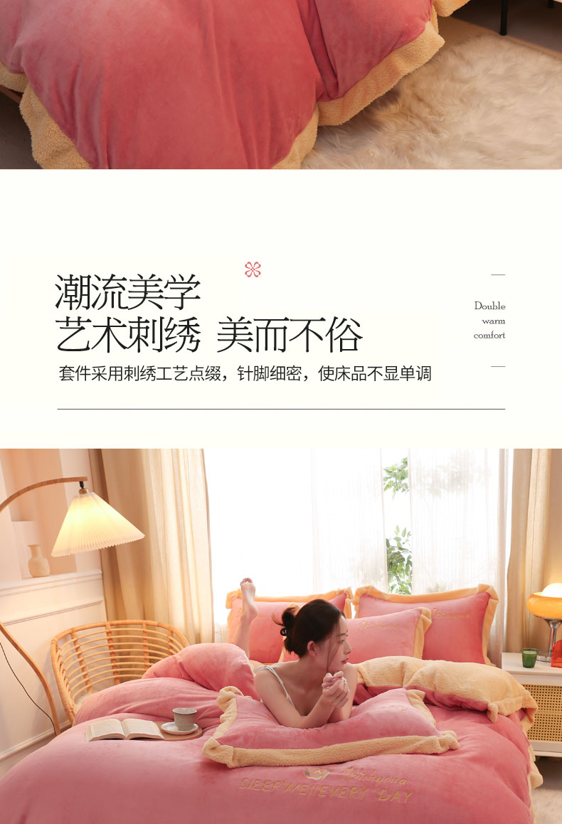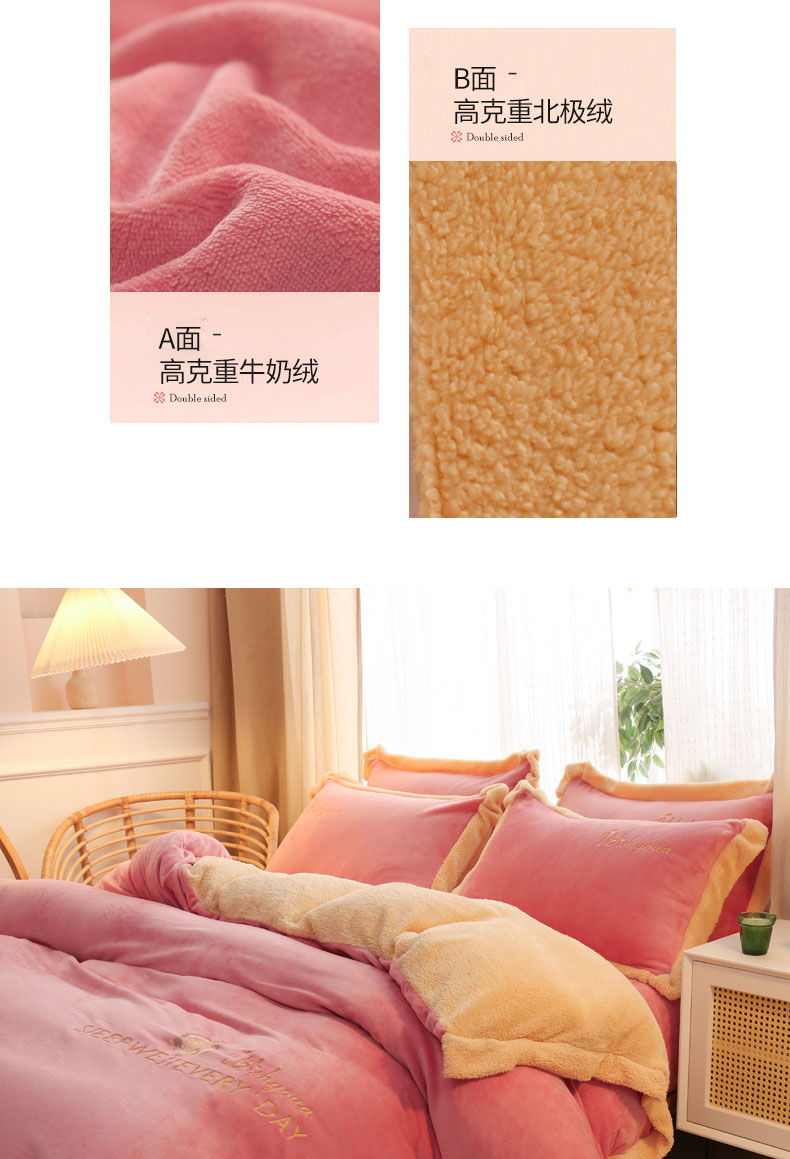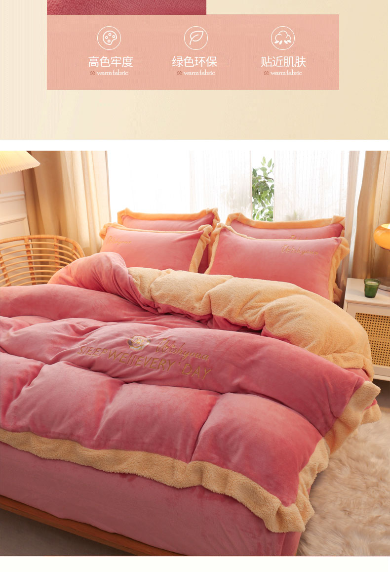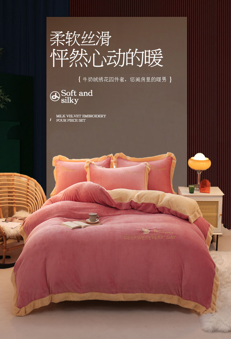 当前位置: 91家纺网 > 商品网购 > 床品套件 > 四件套 > 牛奶绒四件套 > 啊雅家居 2026新款绣花牛奶绒加羊羔绒四件套 玫红加米黄