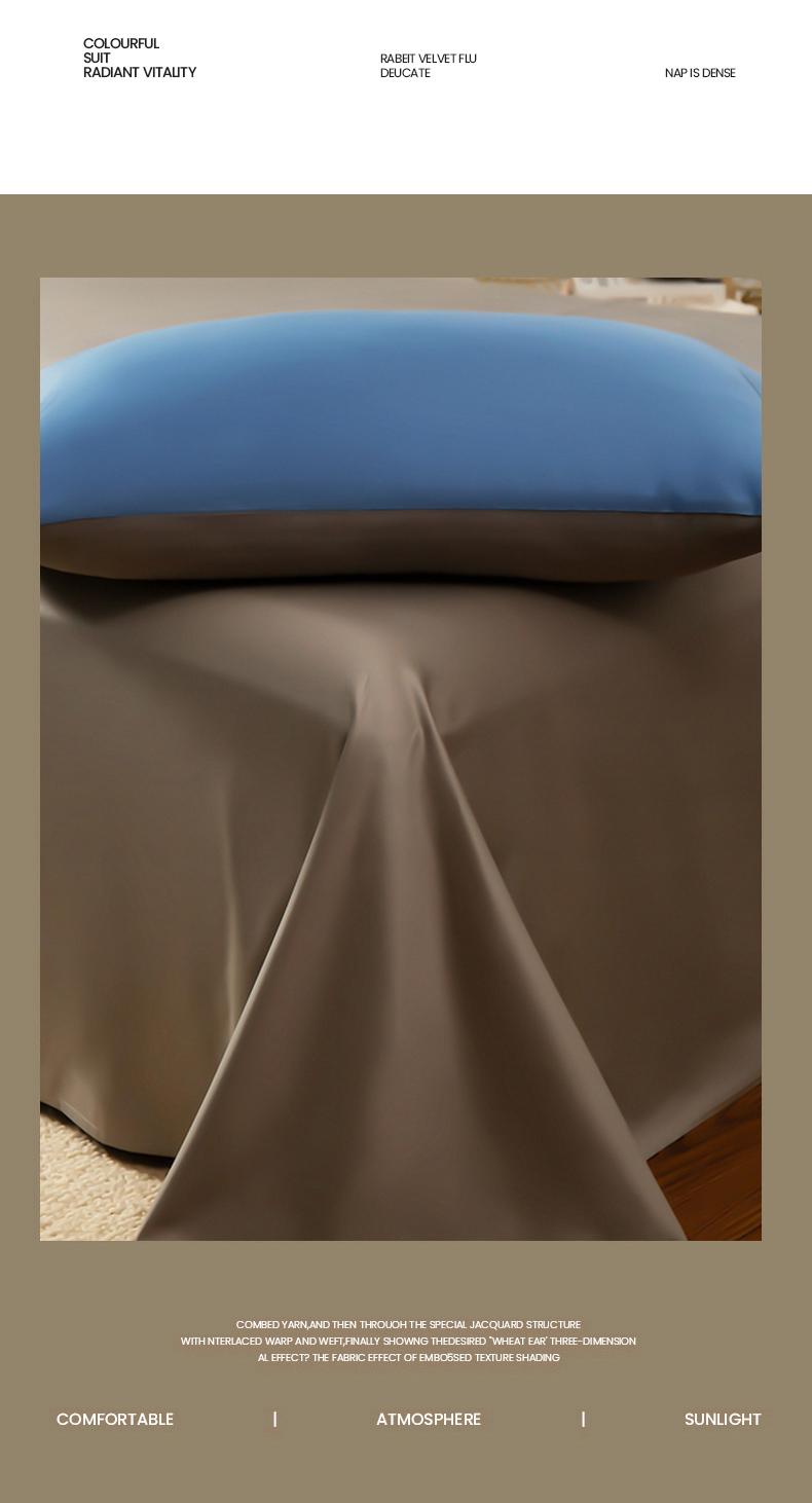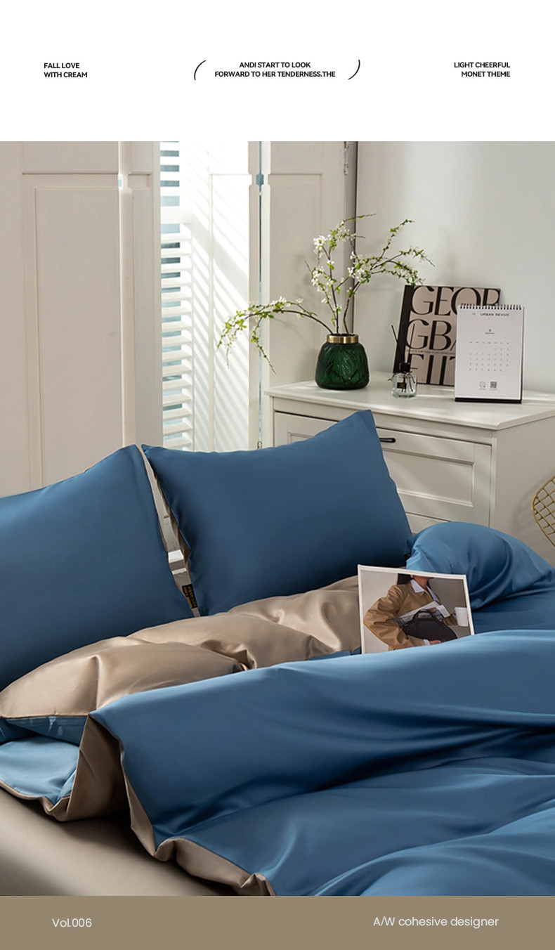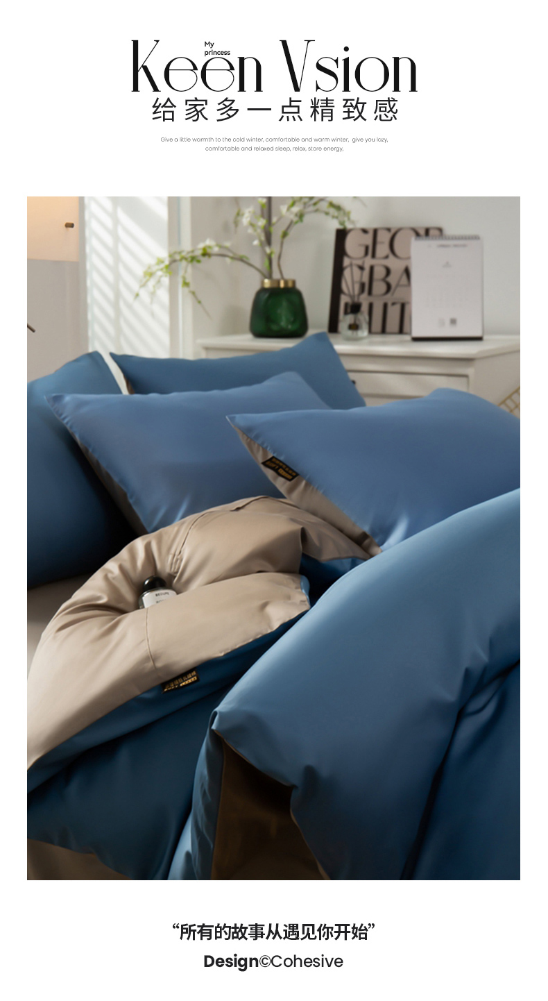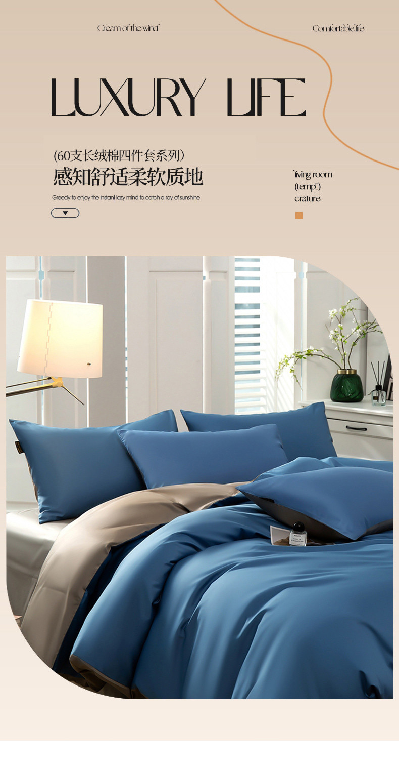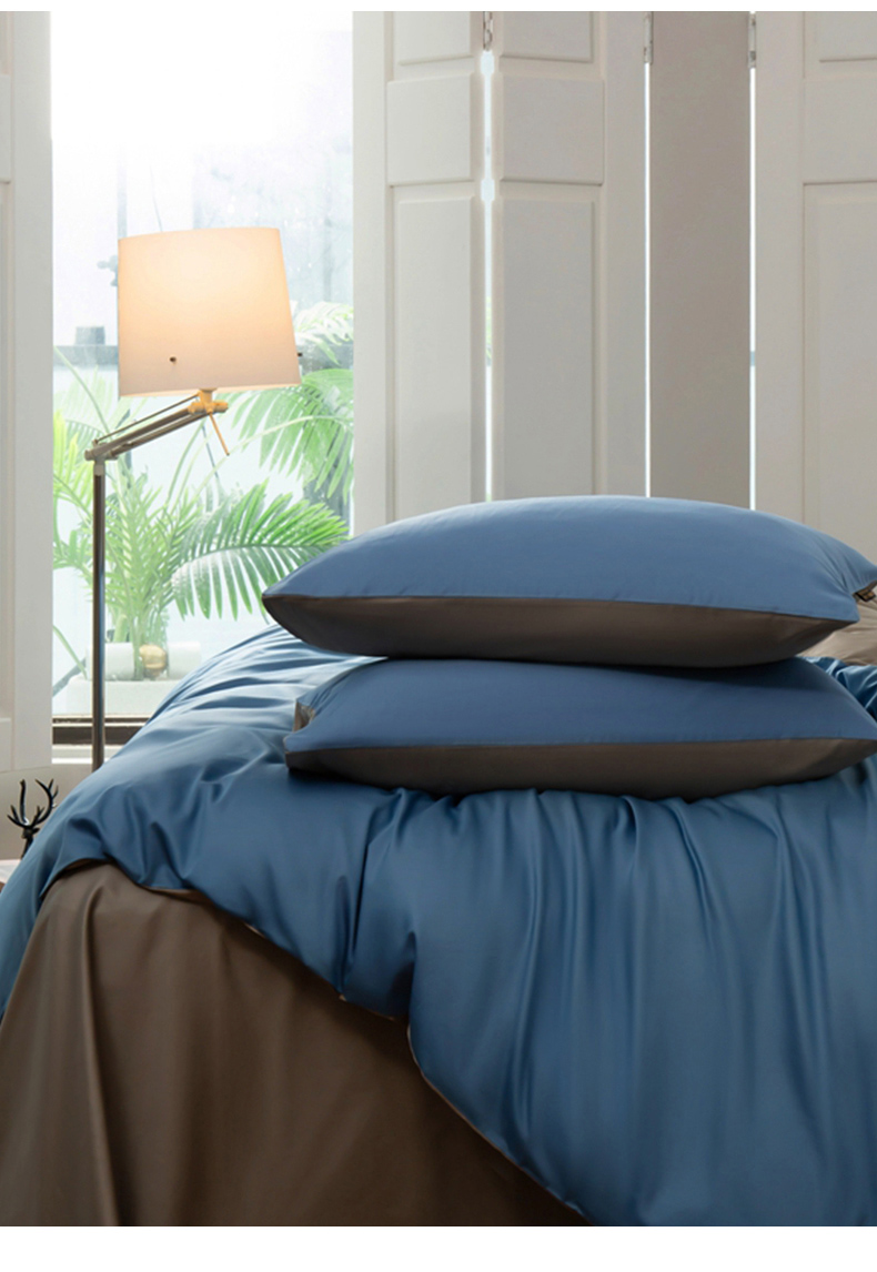 莱阁亿 2023新款长绒棉纯色双面四件套 蓝色+卡其