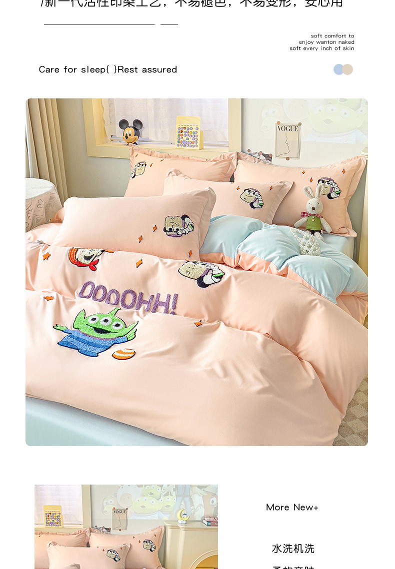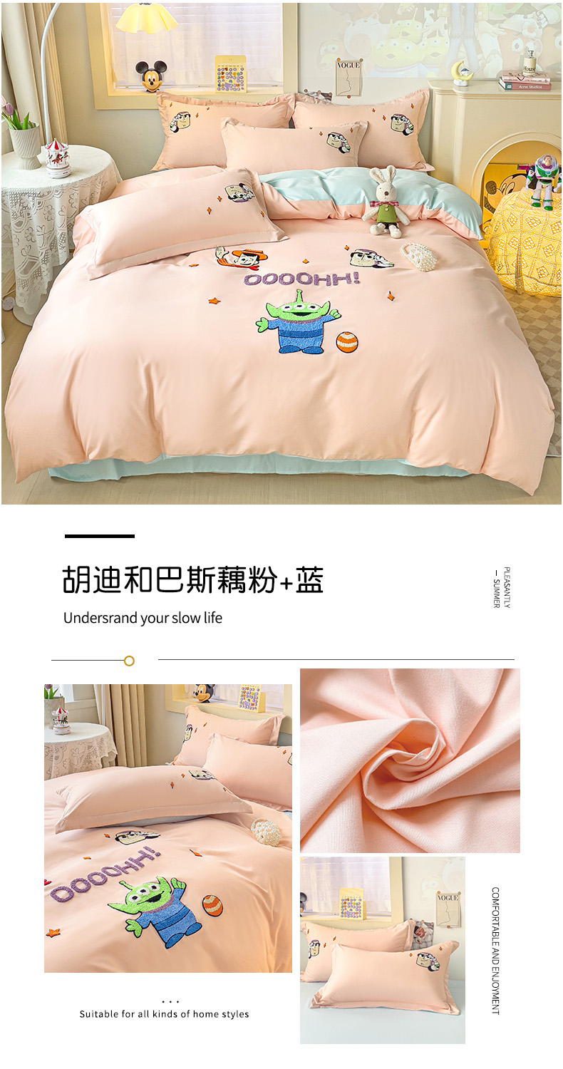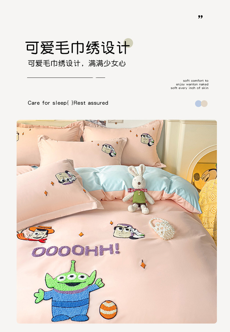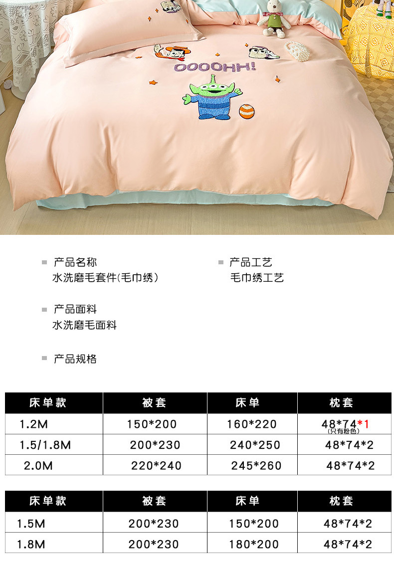 商品名称:娜娜 2023新款水洗磨毛毛巾绣四件套 胡迪和巴斯藕粉+蓝