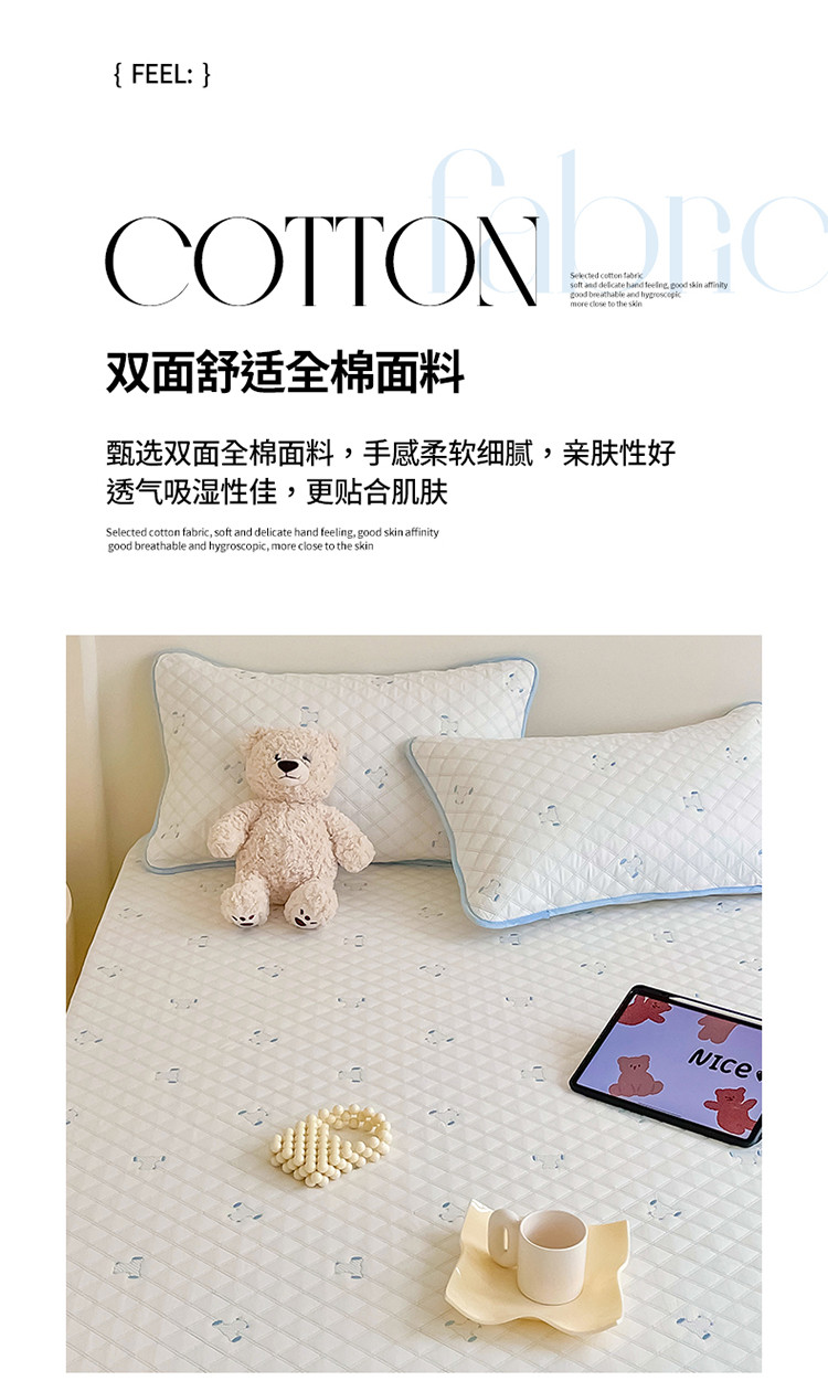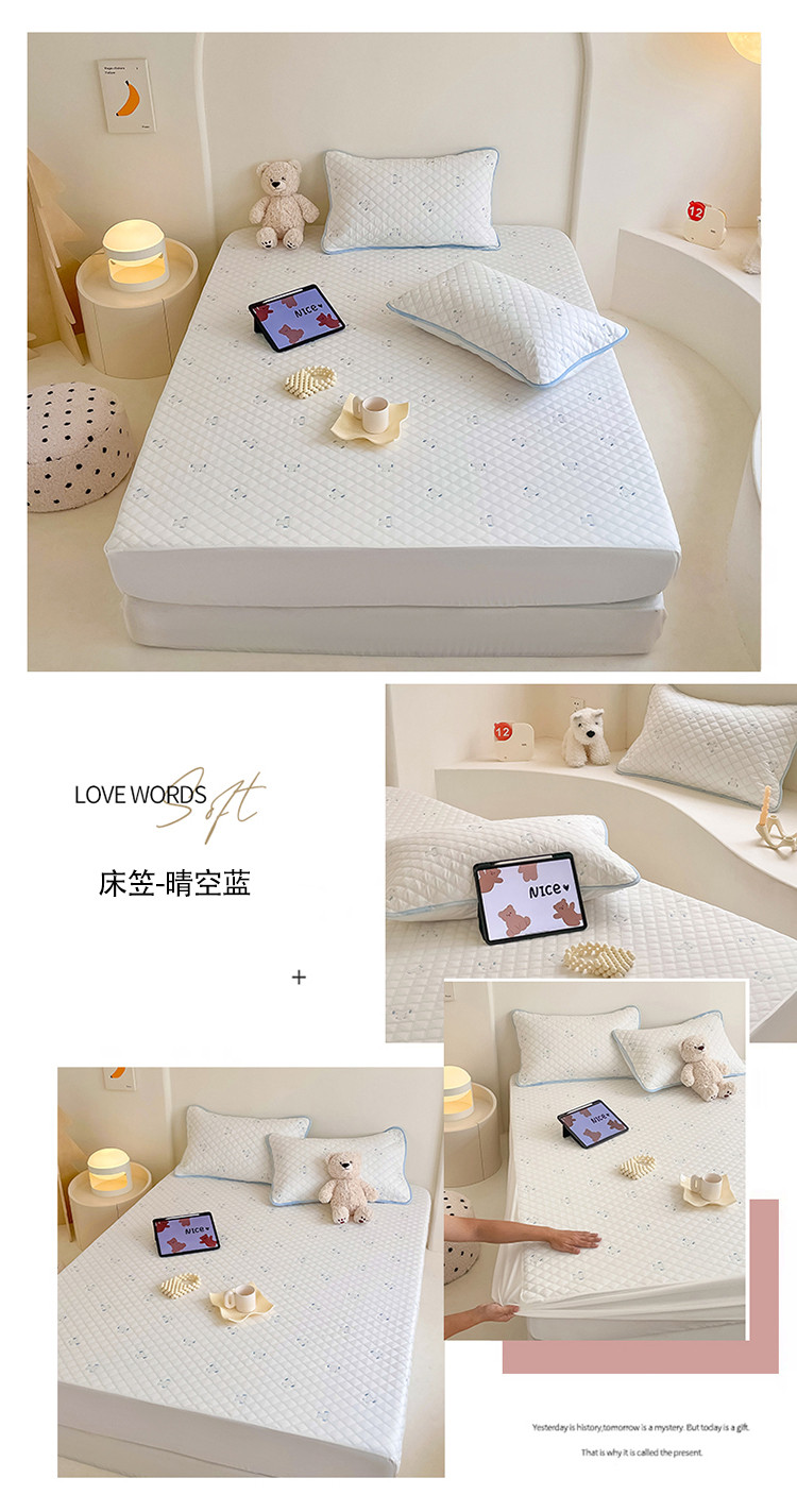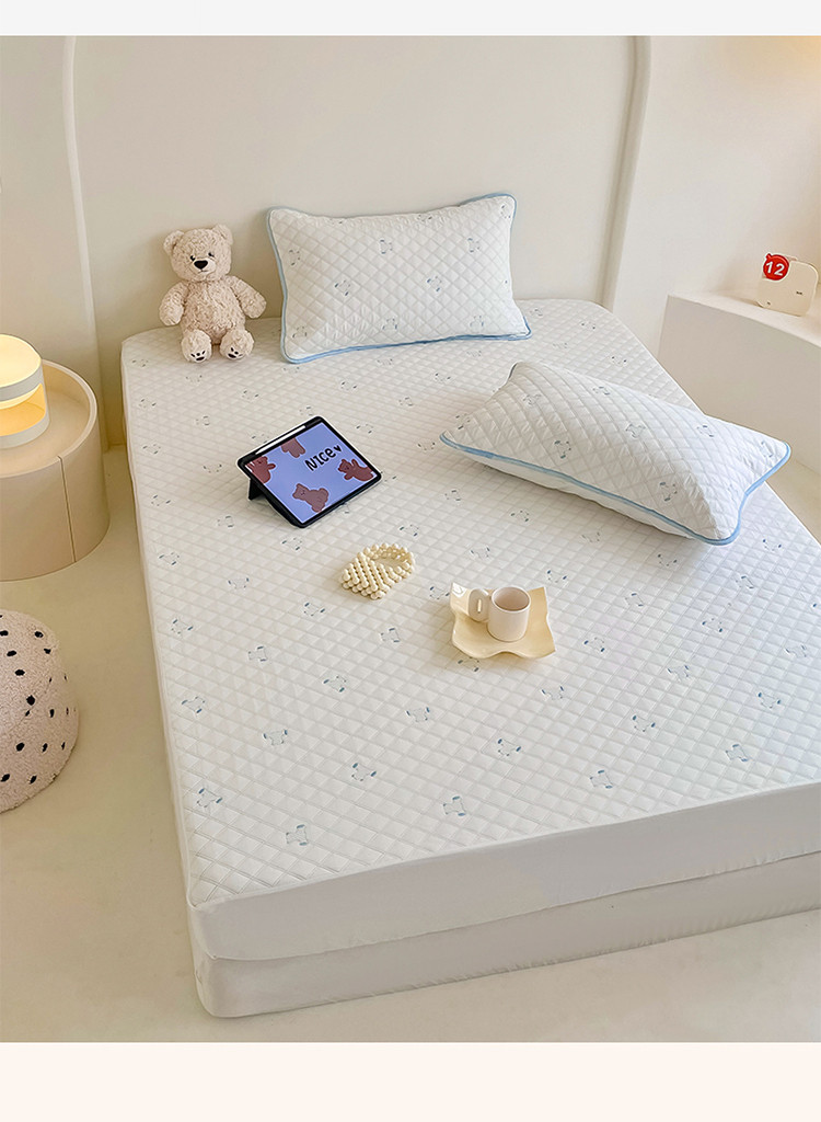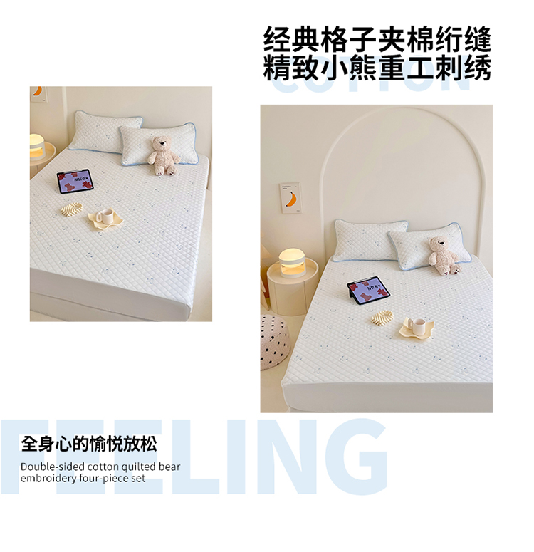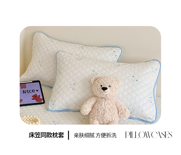 商品名称:漫调 2023新款全棉绗缝床笠格子小熊刺绣 床笠晴空蓝