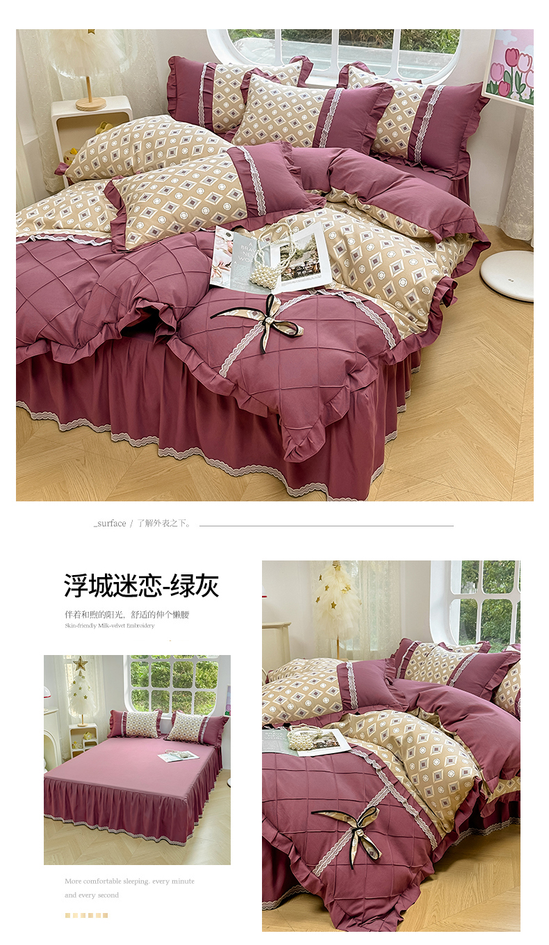 商品名称:金米诺 2024新款蝴蝶结韩版蕾丝花边床裙四件套 浮城迷恋-绿灰