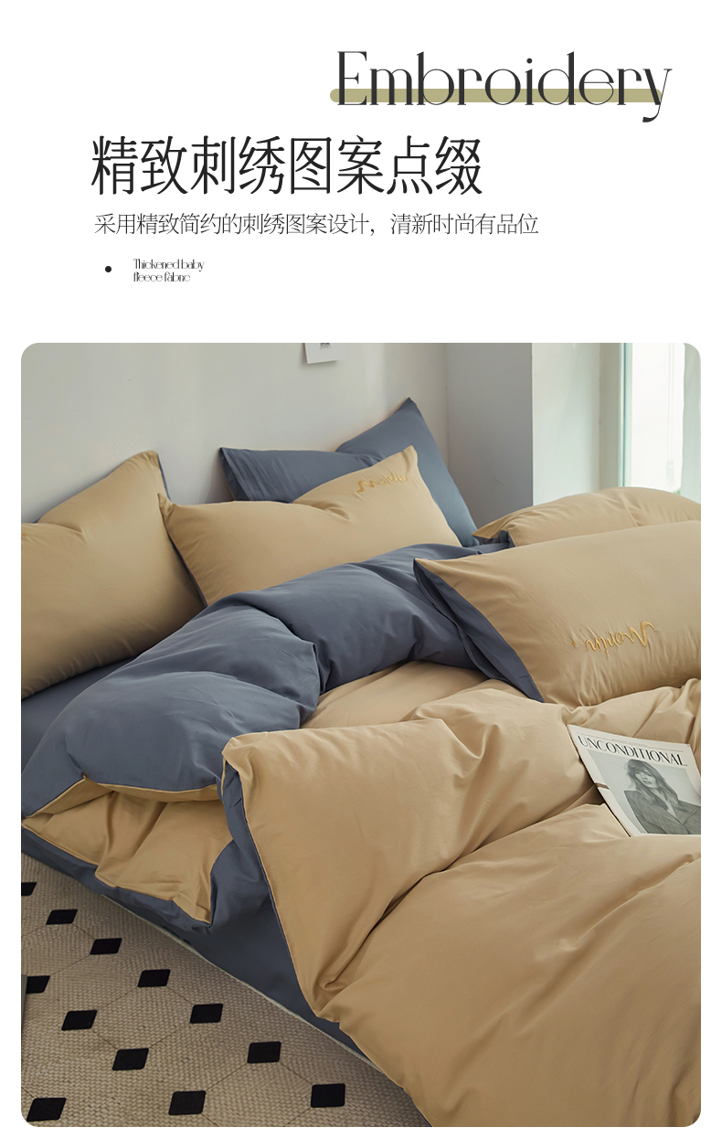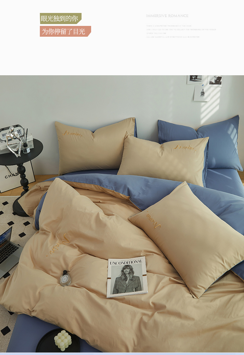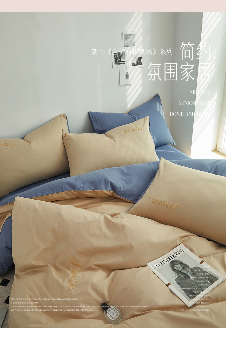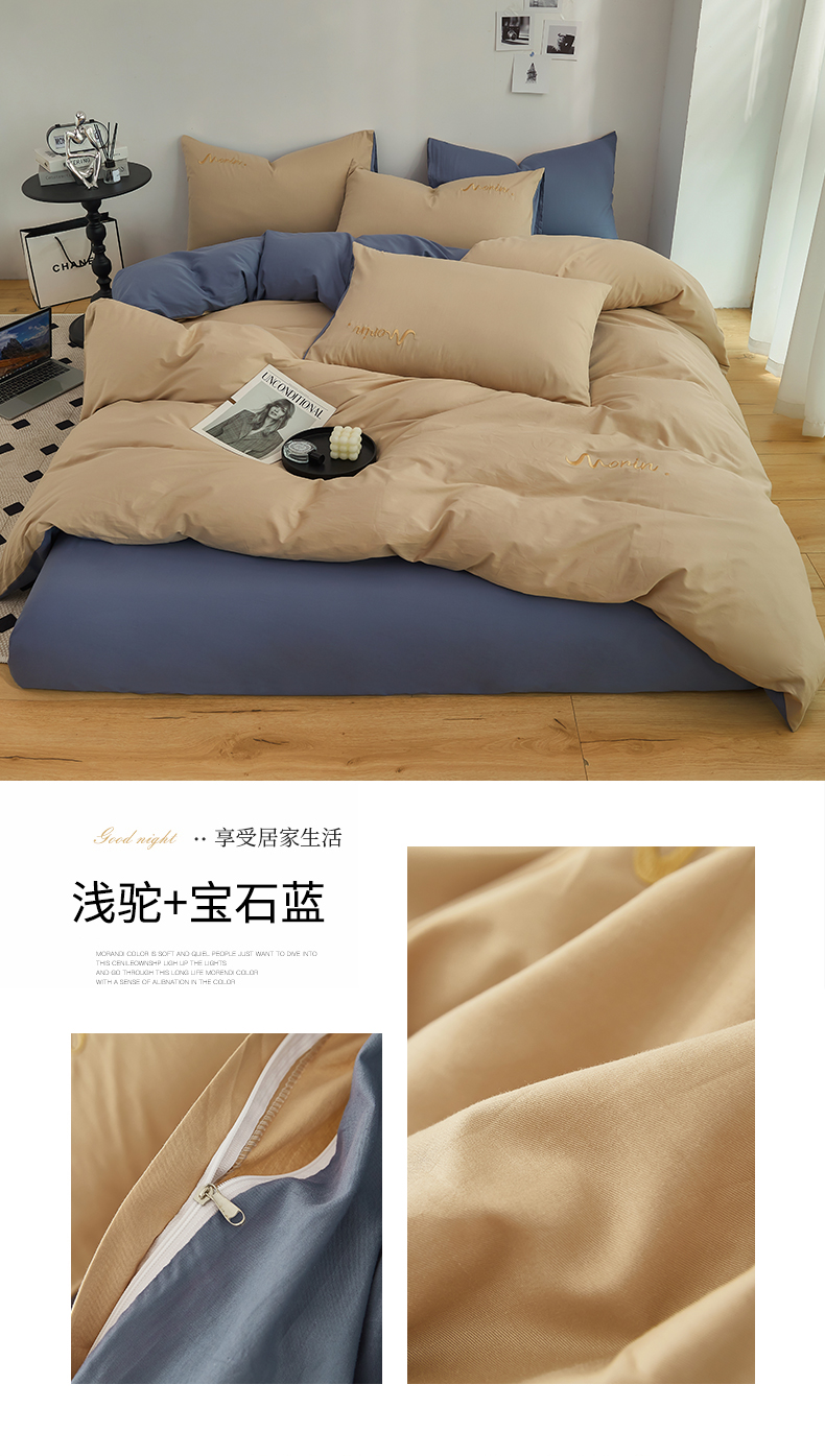 商品名称:多品家纺 2024新款全棉纯色绣花四件套 浅驼+宝石蓝