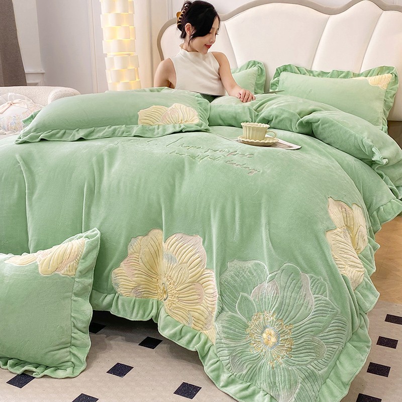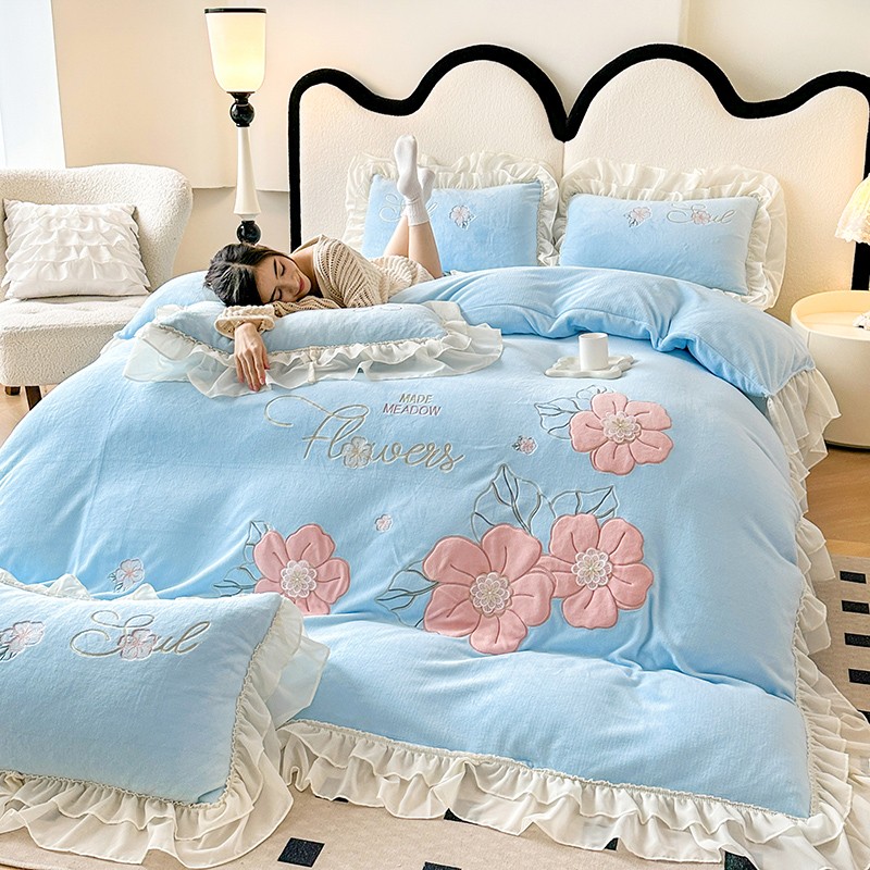 漫布云秋冬230g9.5斤全消光牛奶绒四件套法式公主风婴儿绒雪纺花边款