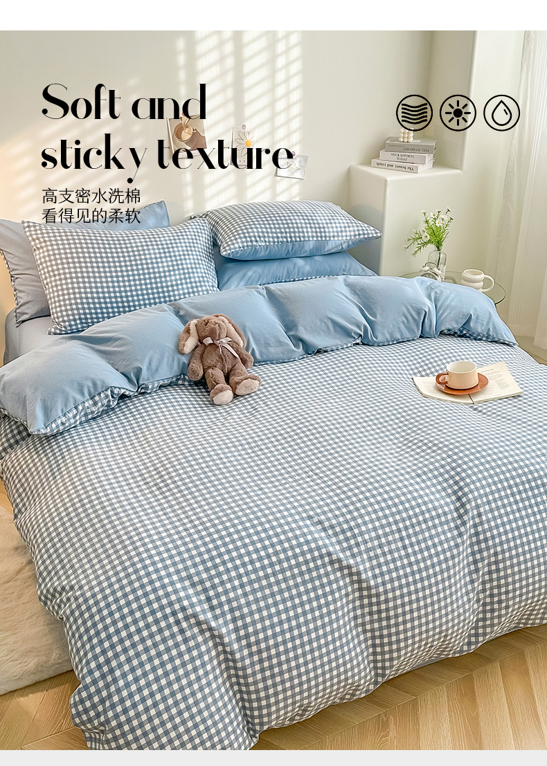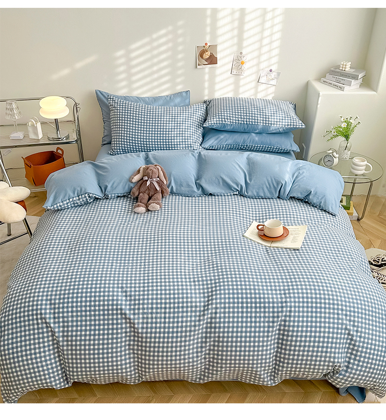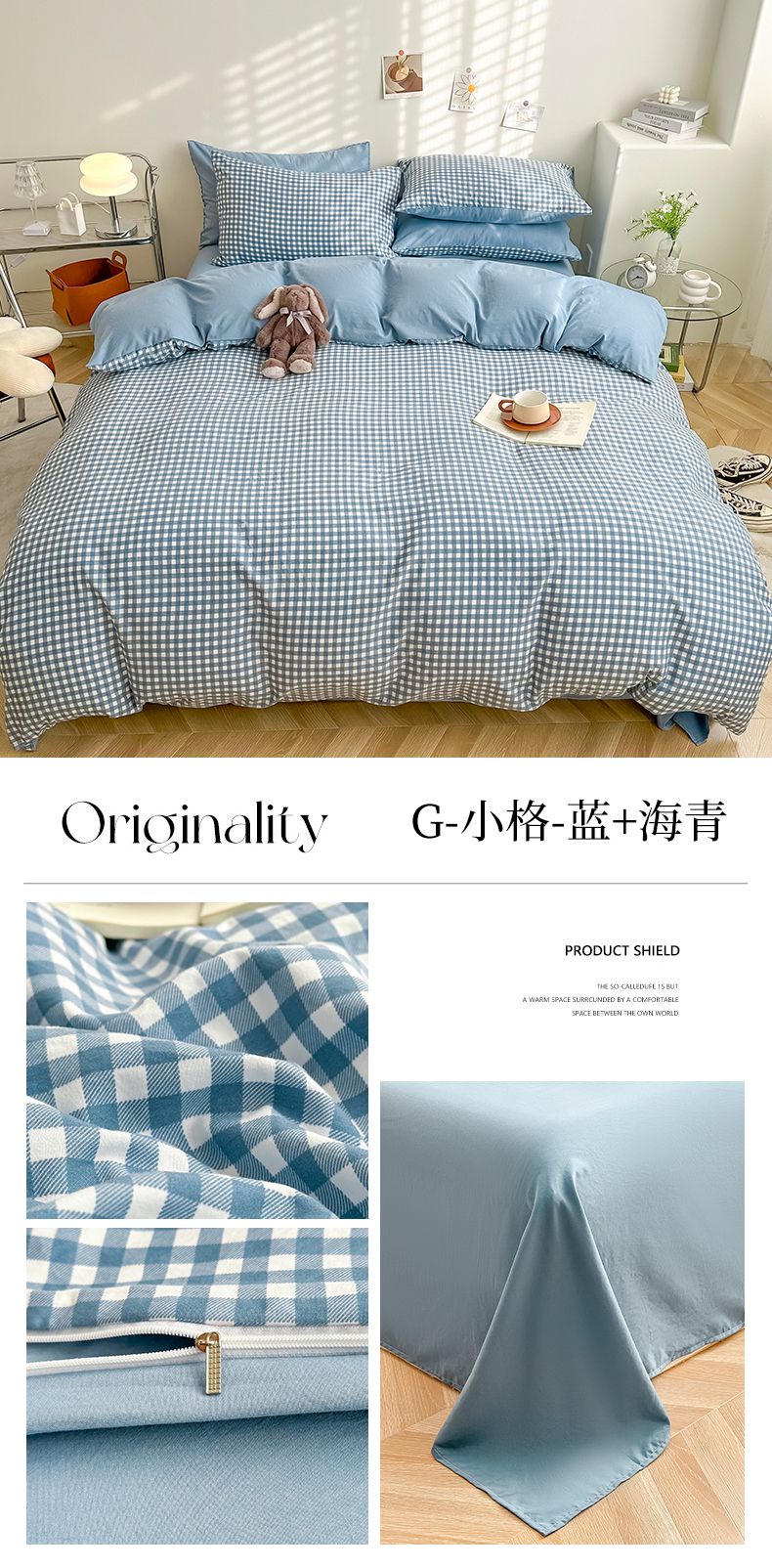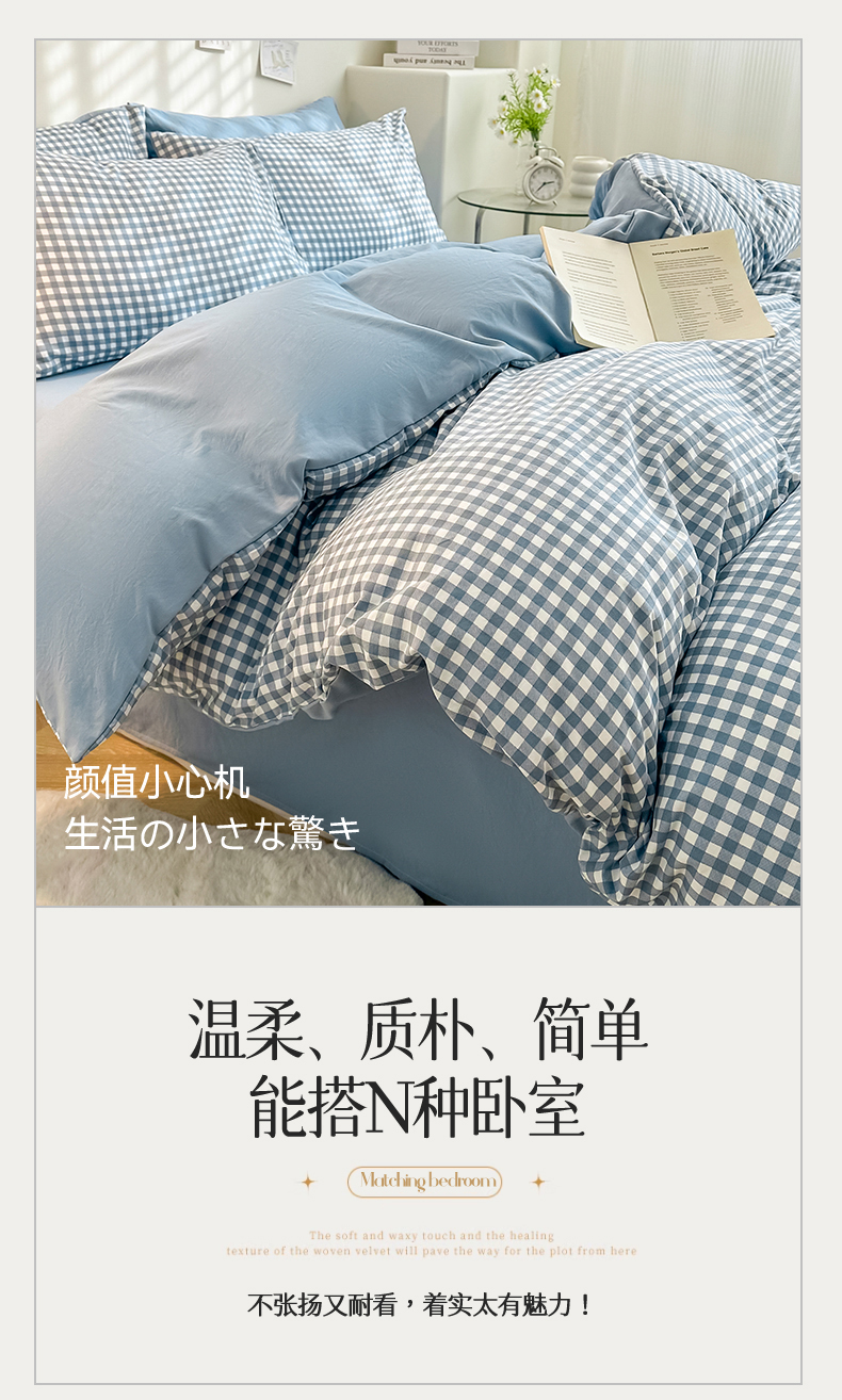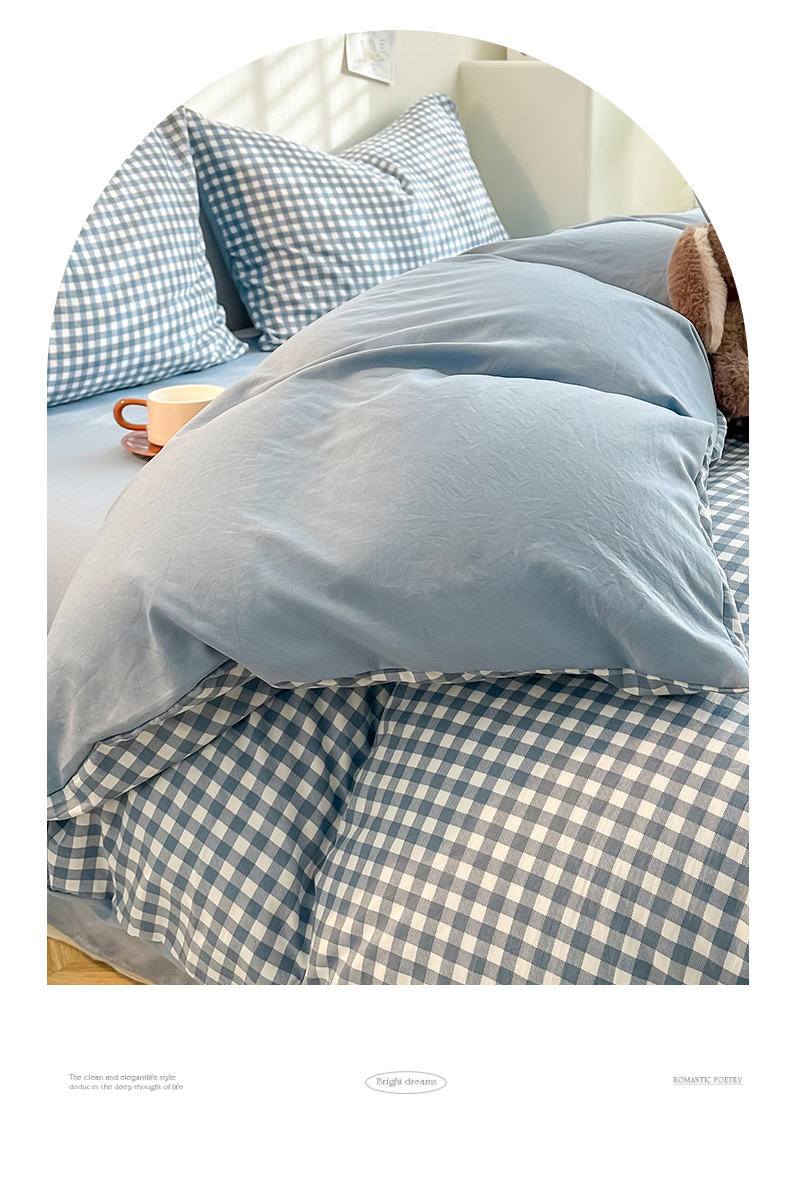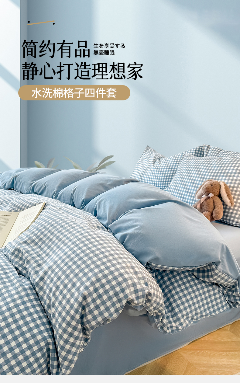 当前位置: 91家纺网 > 商品网购 > 床品套件 > 四件套 > 水洗棉四件套 > 古吉梦 2024新款水洗棉小清新印花格子系列四件套 G-小格-蓝+海青