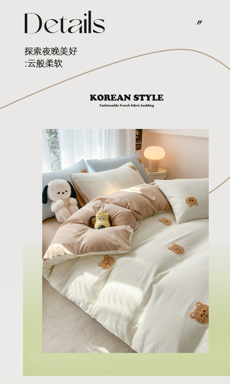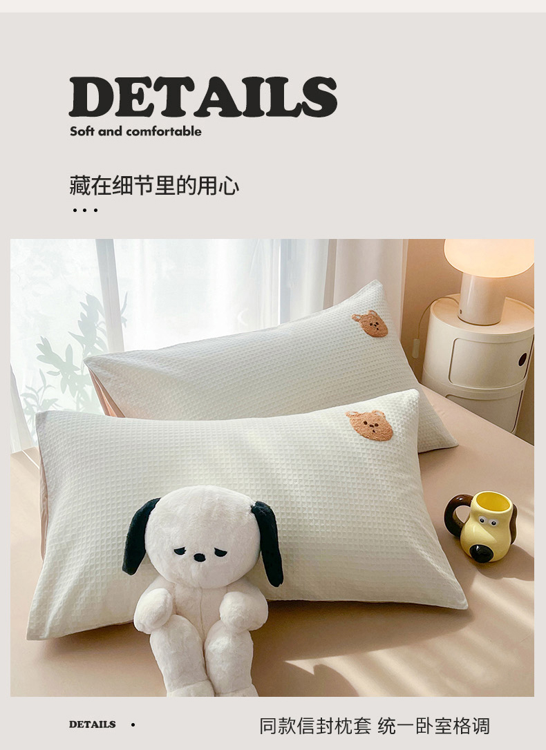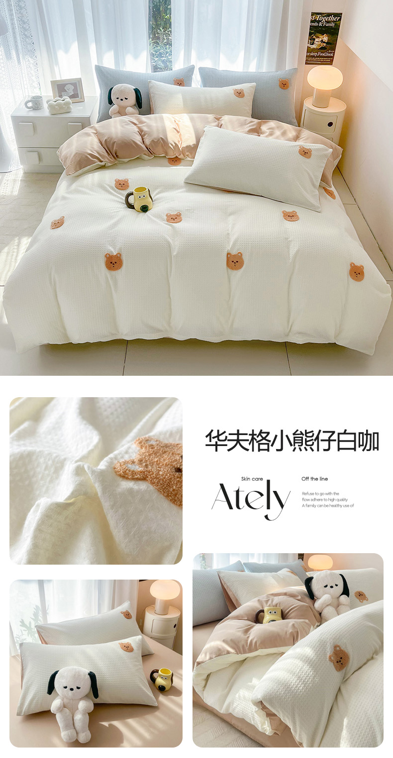 当前位置: 91家纺网 > 商品网购 > 床品套件 > 四件套 > 毛巾绣四件套 > 慕尚 2025新款全棉华夫格毛巾绣四件套 华夫格小熊仔白咖