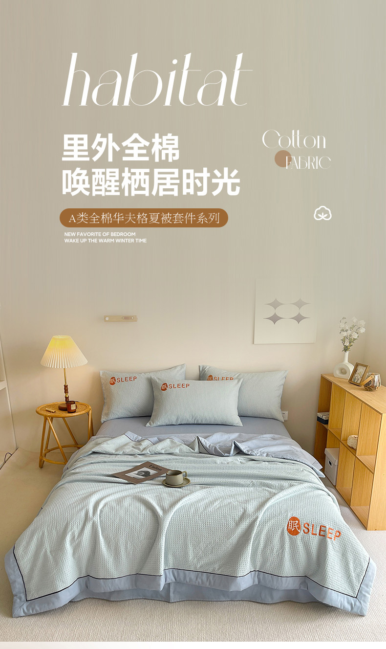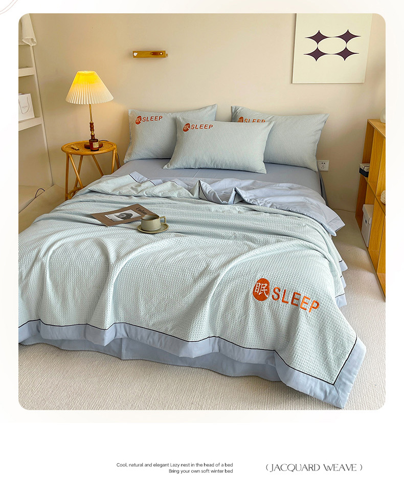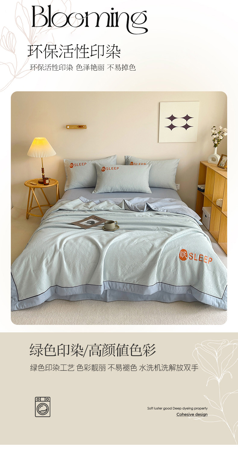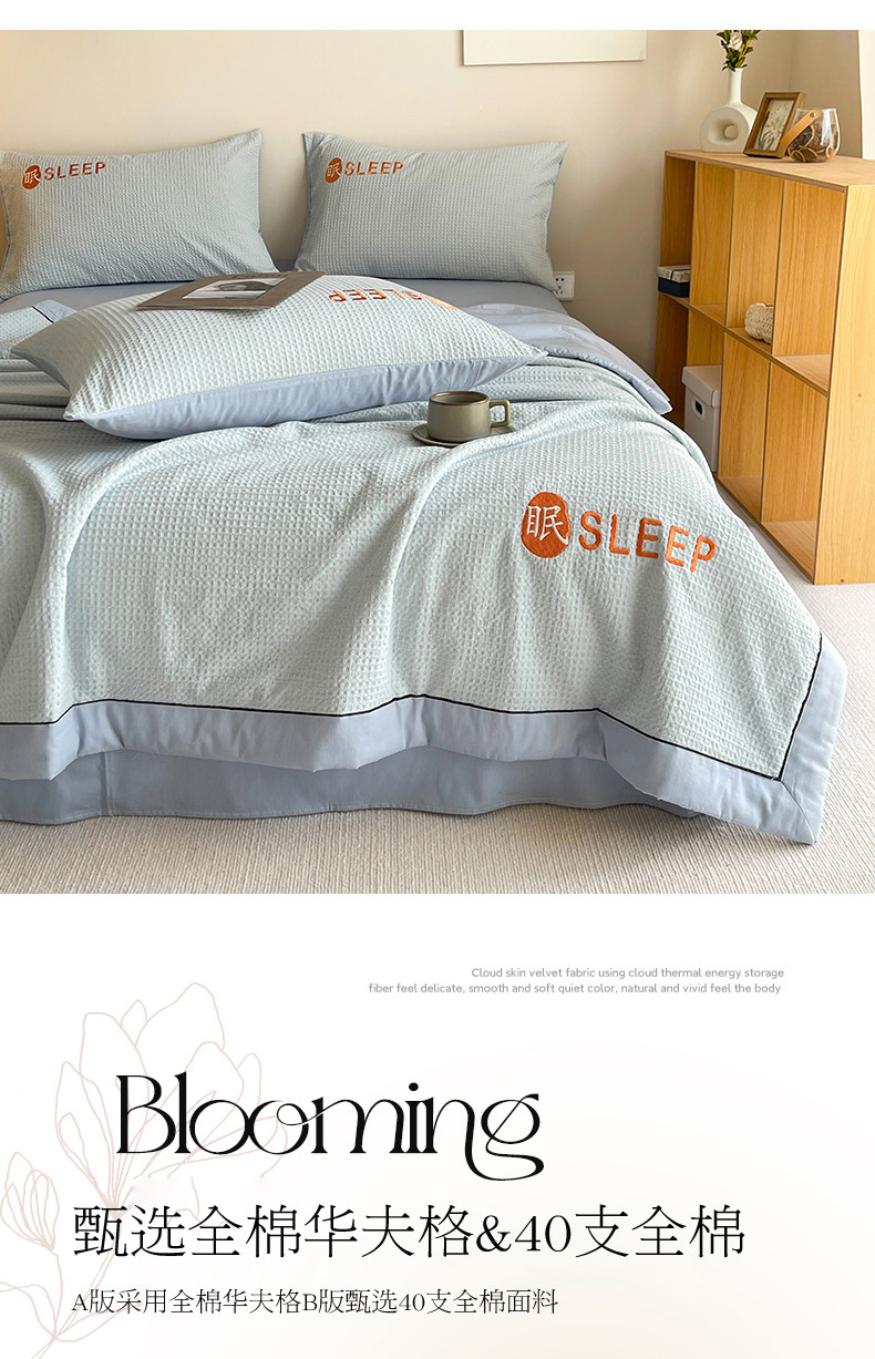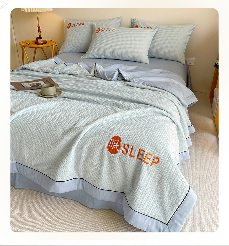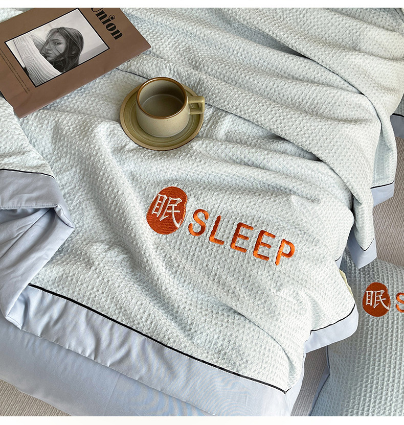 • 91家纺网 家纺一手货源 找家纺 眠博士 2024新款A类全棉华夫格拼角夏被套件系列 夏被-雾蓝
